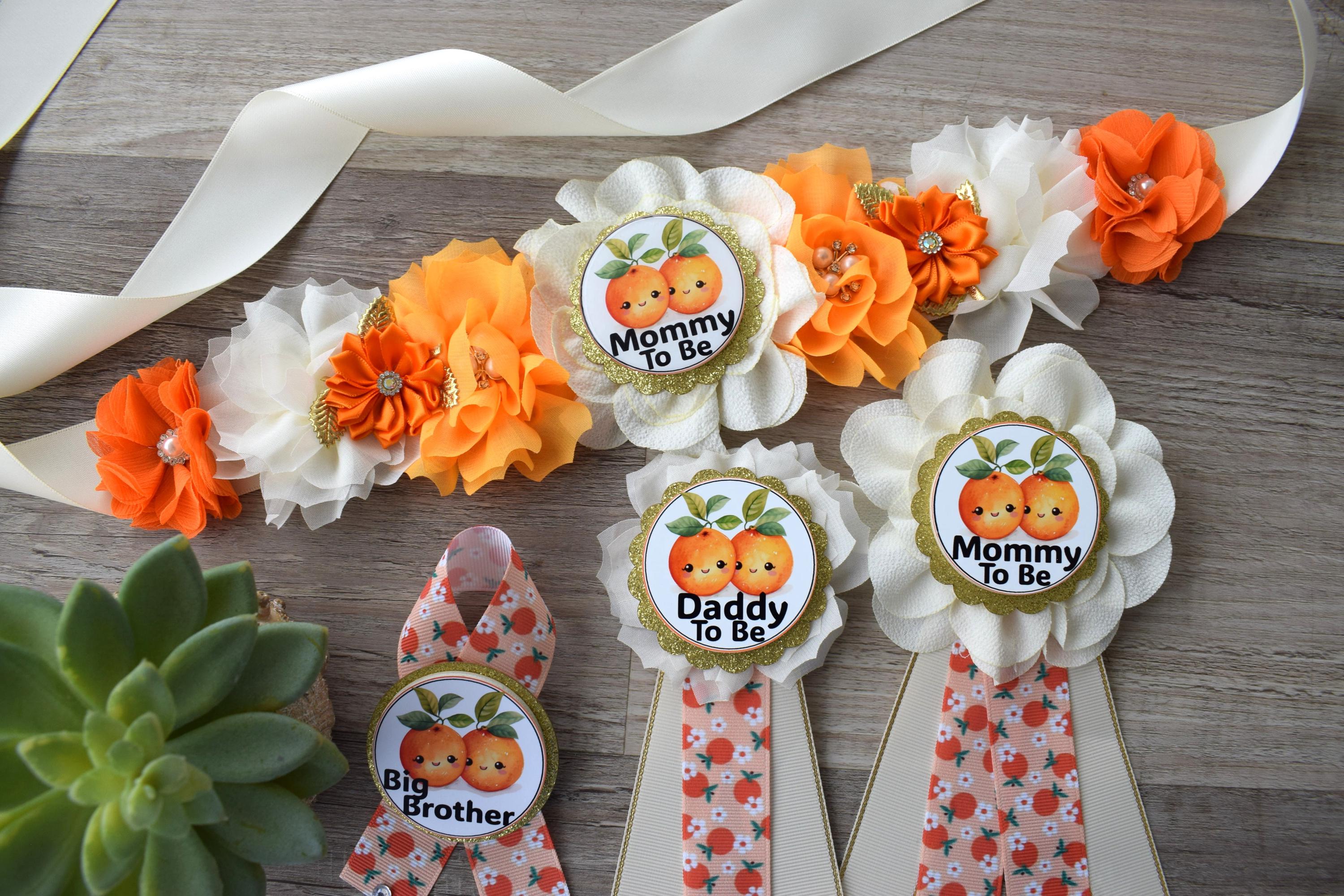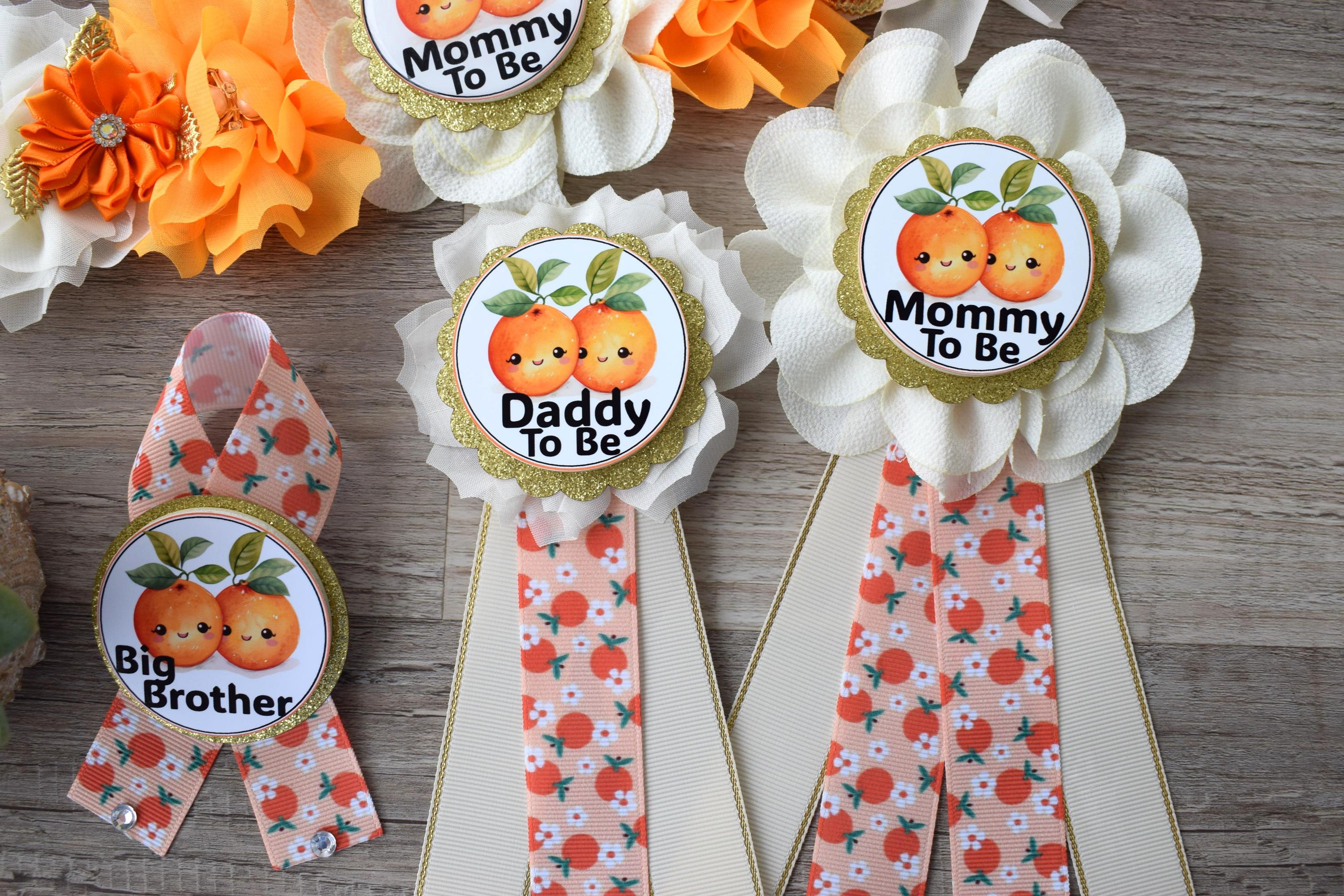 Two Little Cuties Are On The Way Baby Shower, Fruit Orange Maternity Sash, Mommy To Be Ribbon Pin, Daddy To Be , Baby Shower Gift