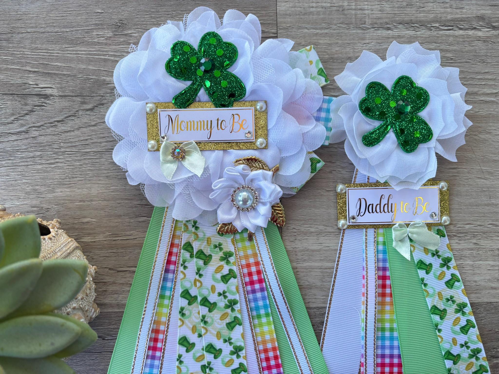 Saint Patrick Baby Shower, Clover Mommy To Be Pin, Green Daddy To Be Pin, St. Patrick's Day Baby Shower, New Parents To Be Pin Set