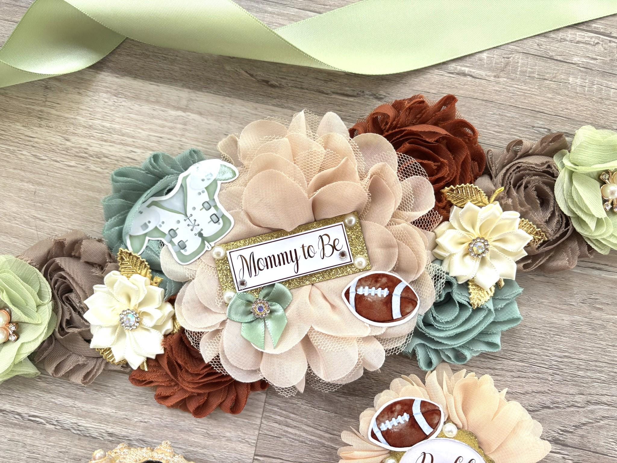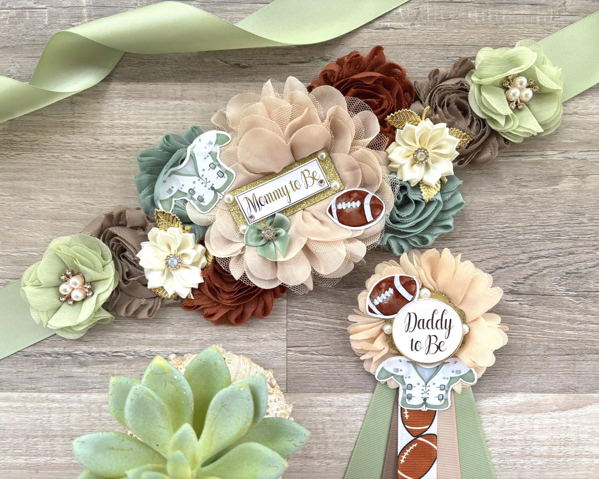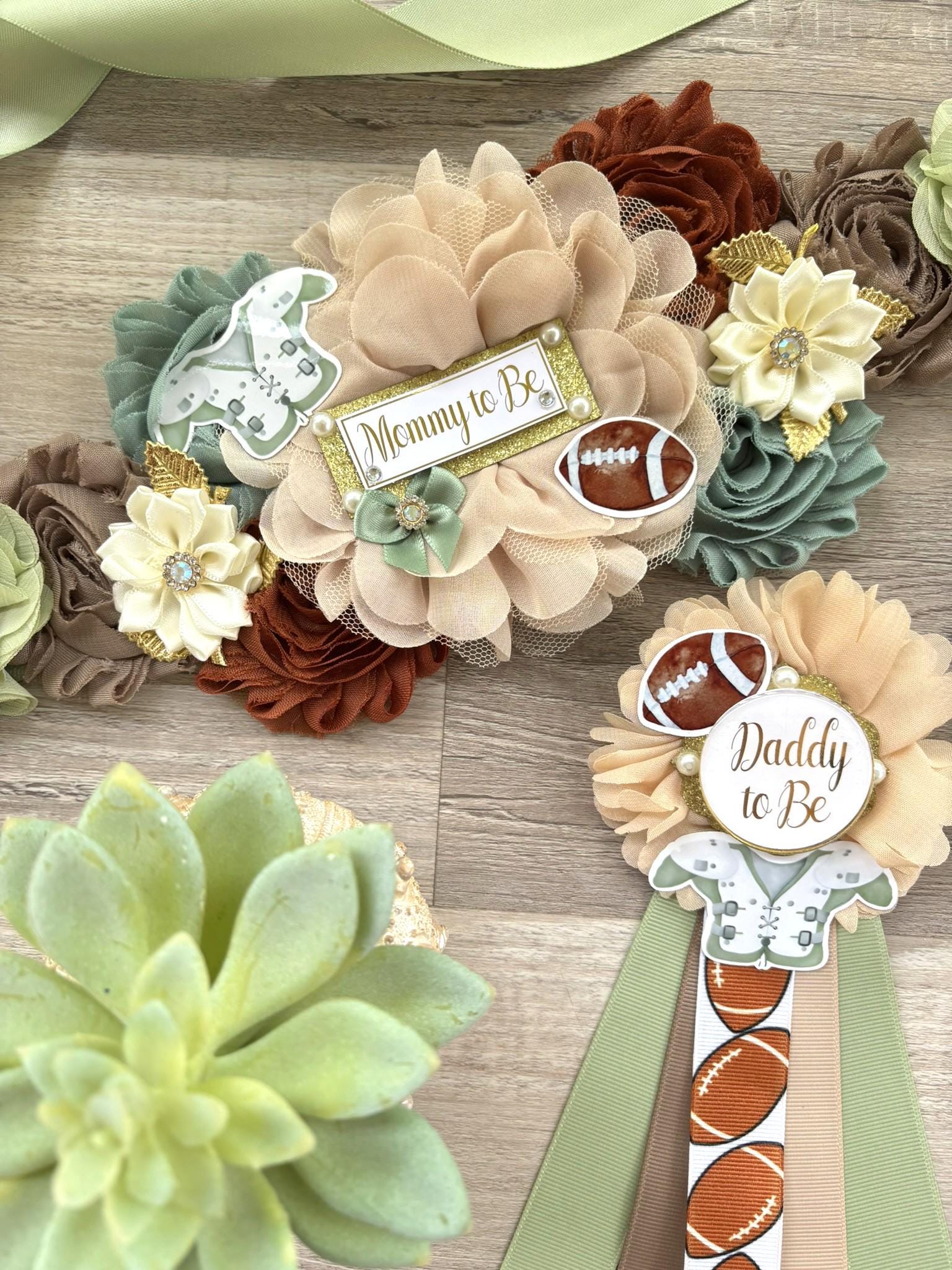 Football Baby Shower, Sport Baby Shower, Sage and Brown Maternity Sash, American Football Daddy To Be Pin, Parents Baby Shower Set