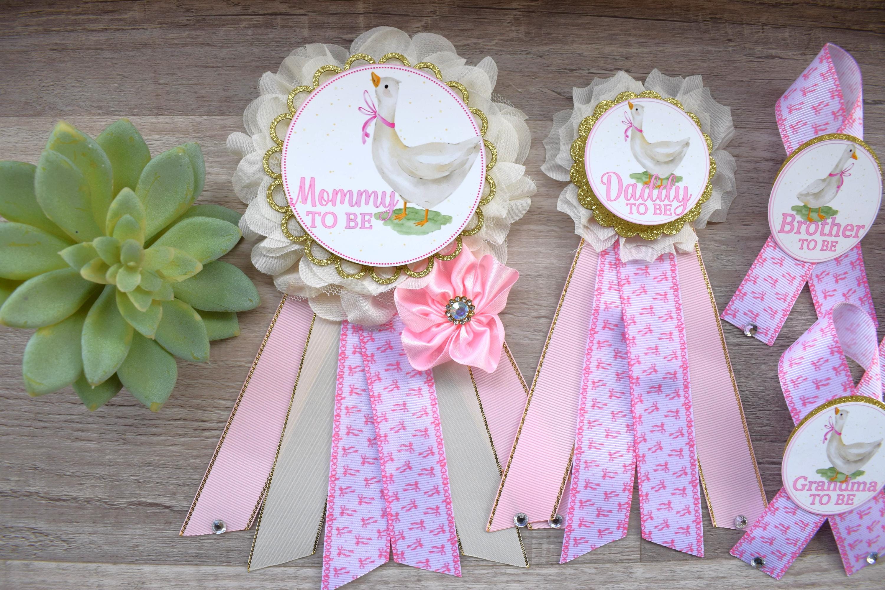 Girl Silly Goose Baby Shower, Goose Maternity Belly Sash, Ivory Pink Gold Mommy To Be Ribbon Pin, Goose Daddy To Be Pin, Family Custom Pins