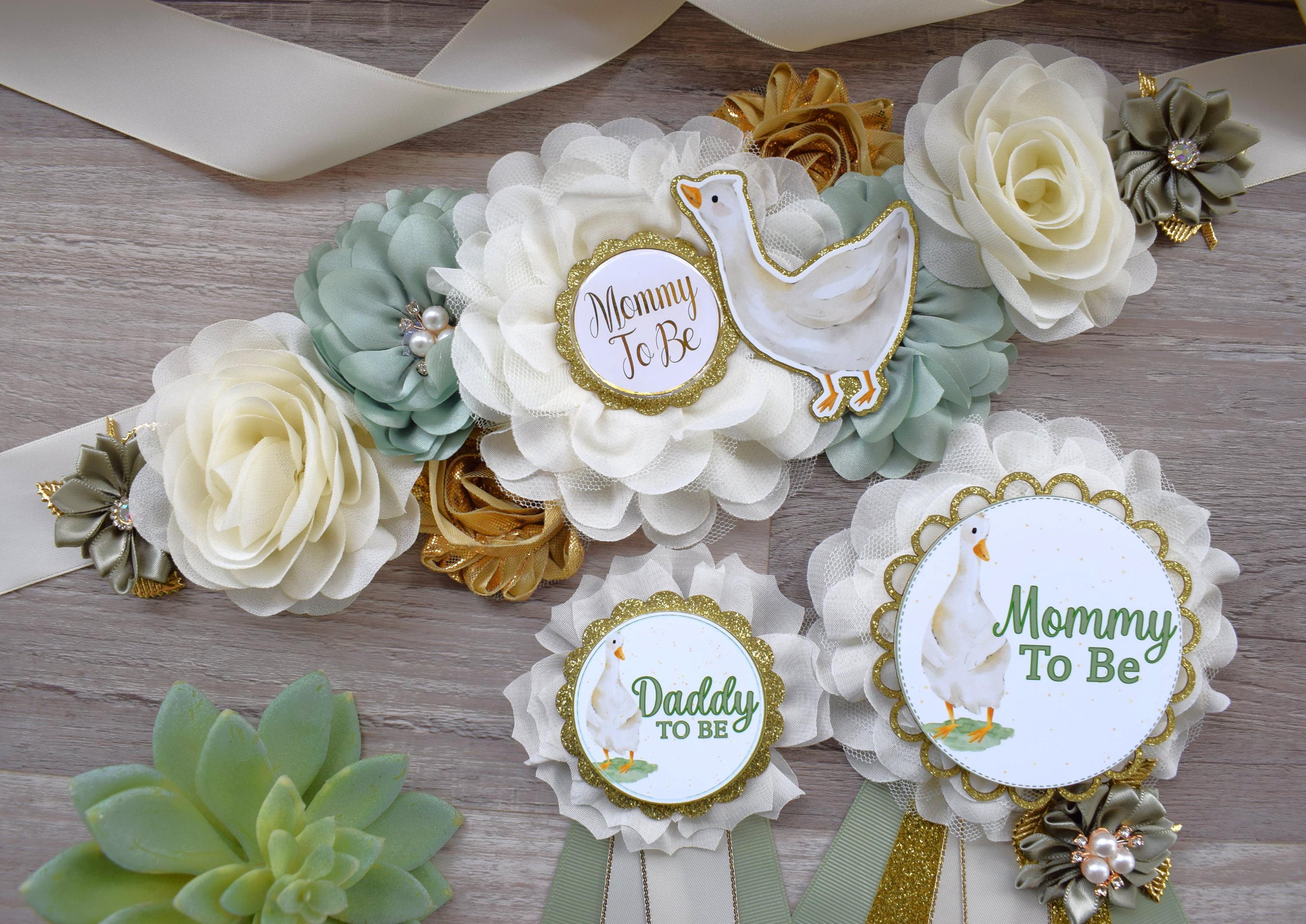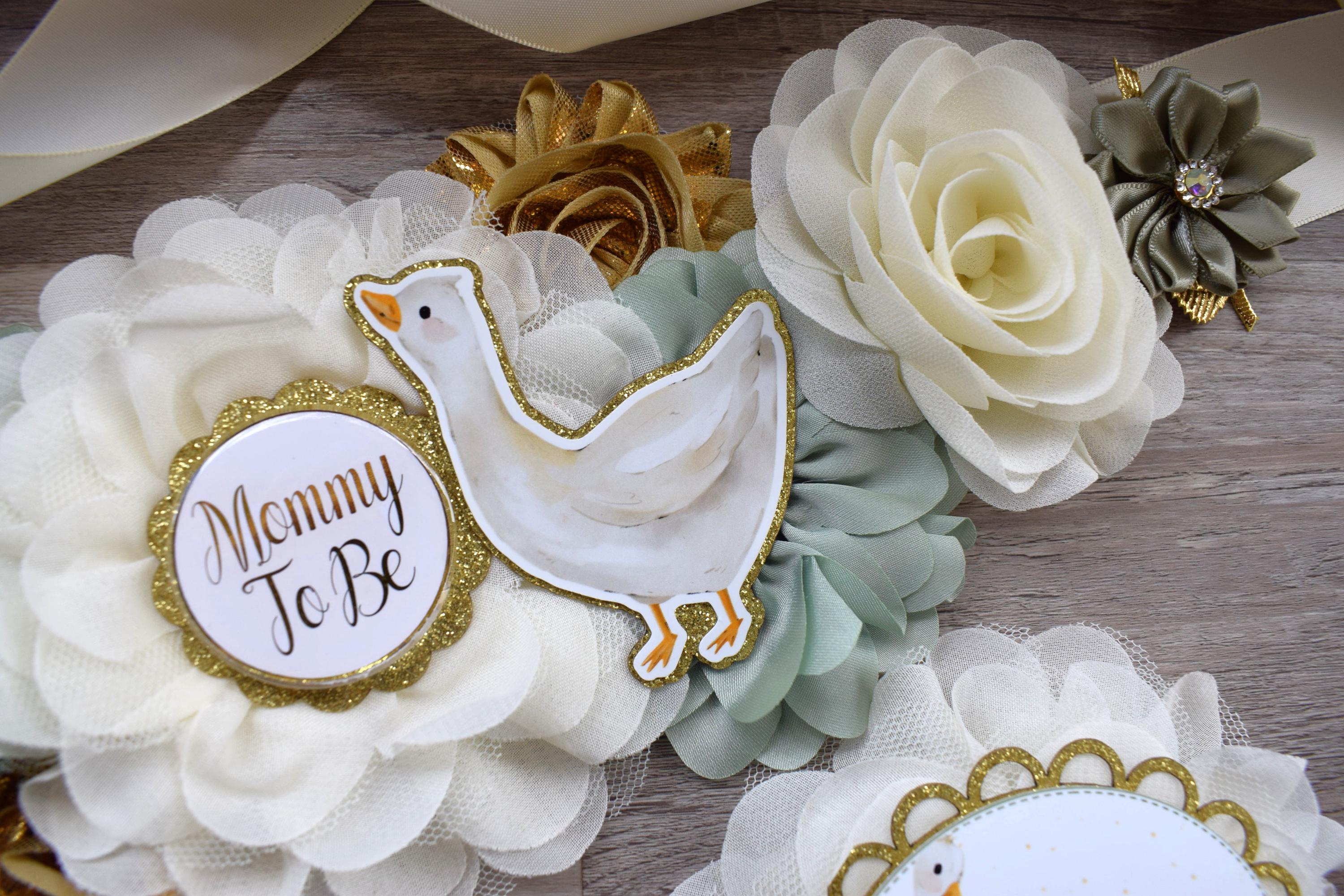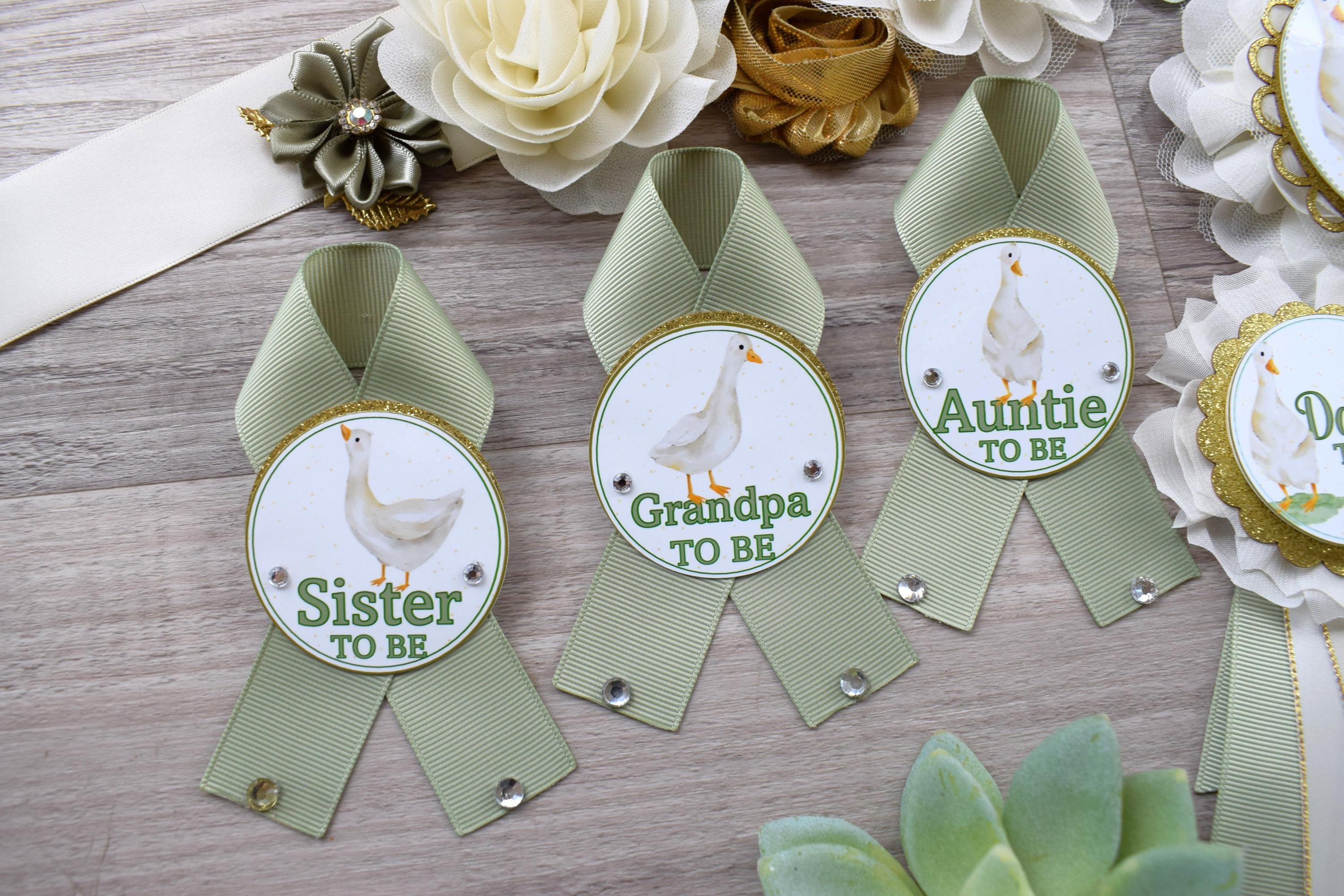 Silly Goose Baby Shower, Goose Maternity Belly Sash, Ivory Sage Gold Mommy To Be Ribbon Pin, Goose Daddy To Be Pin, Family Custom Pins