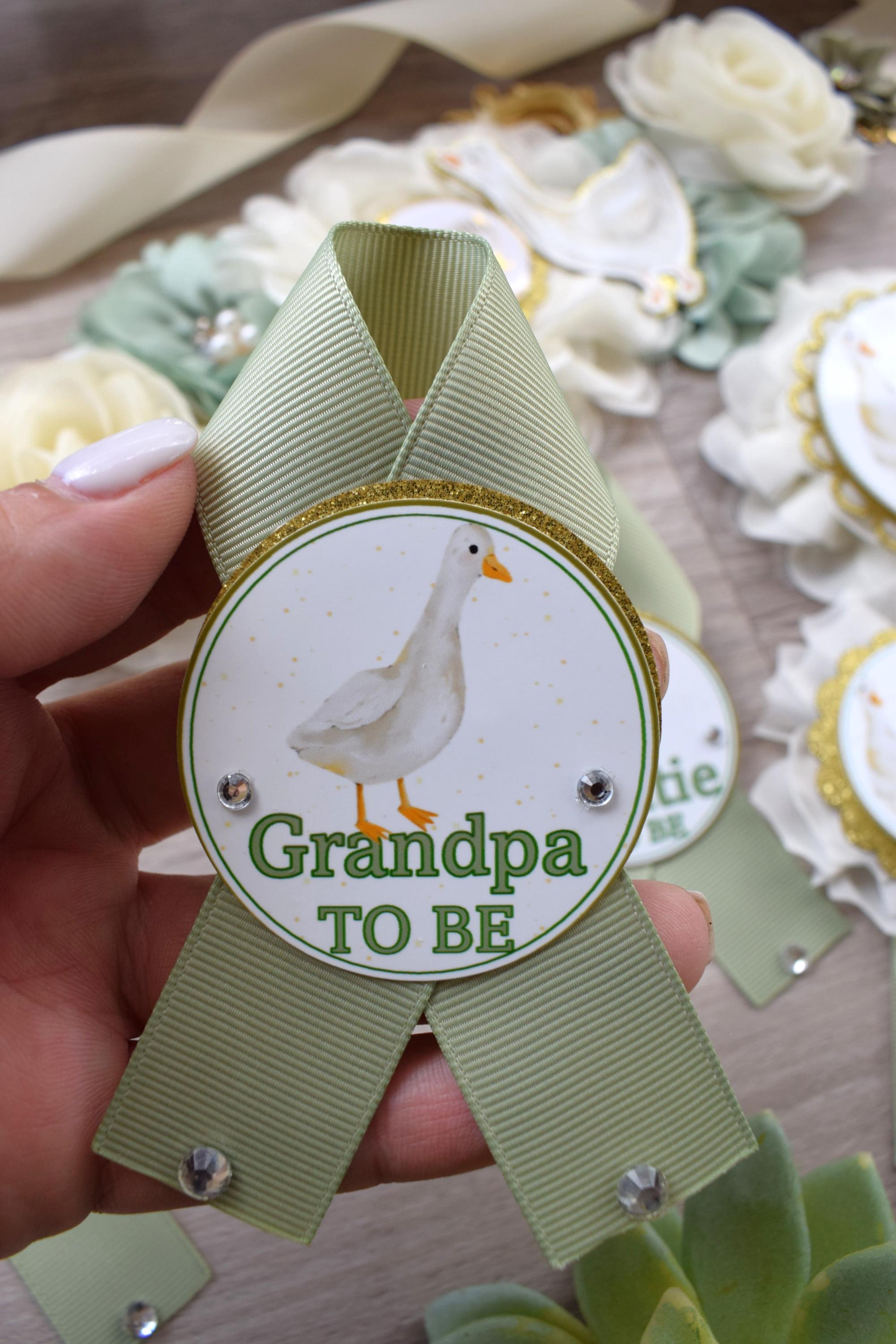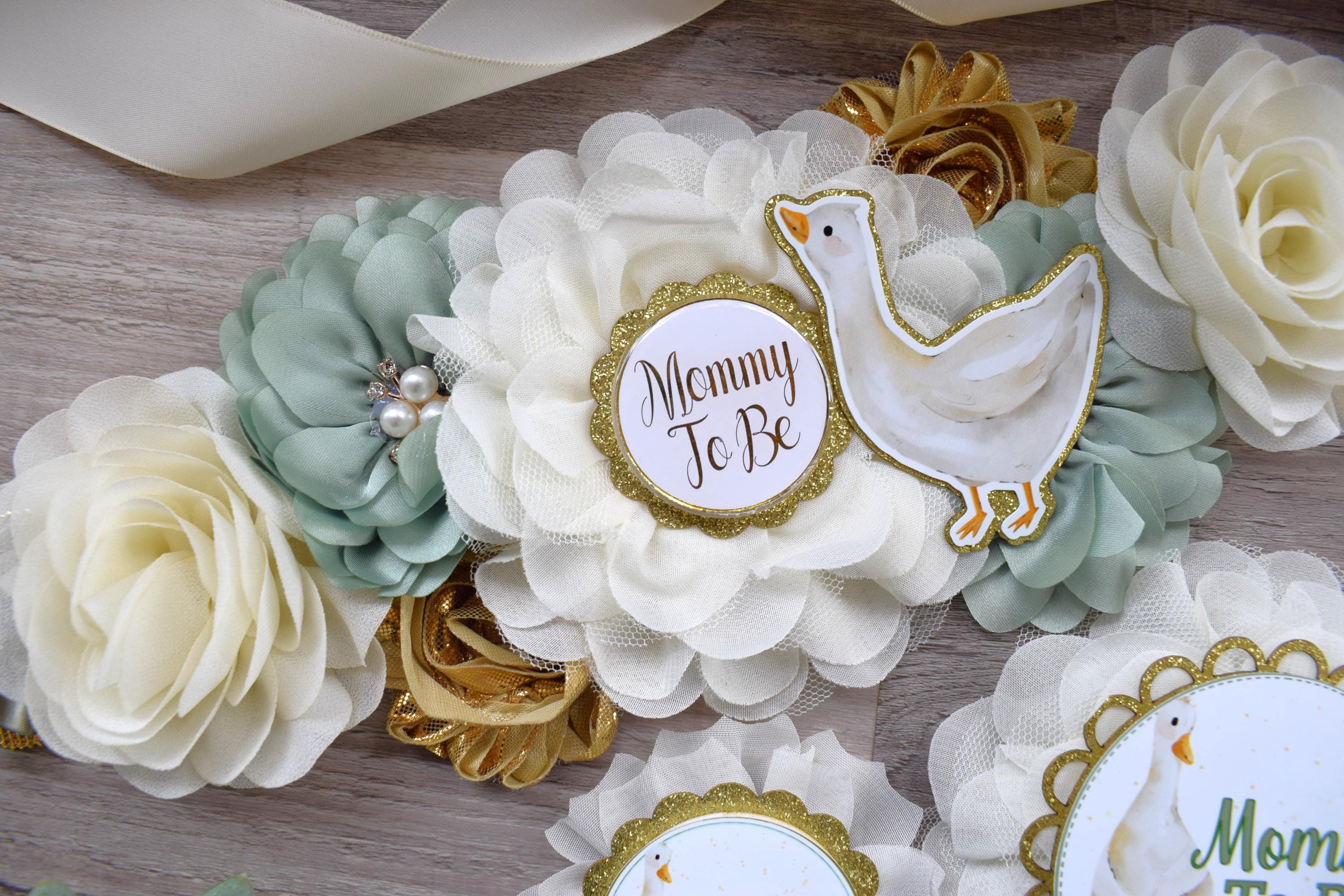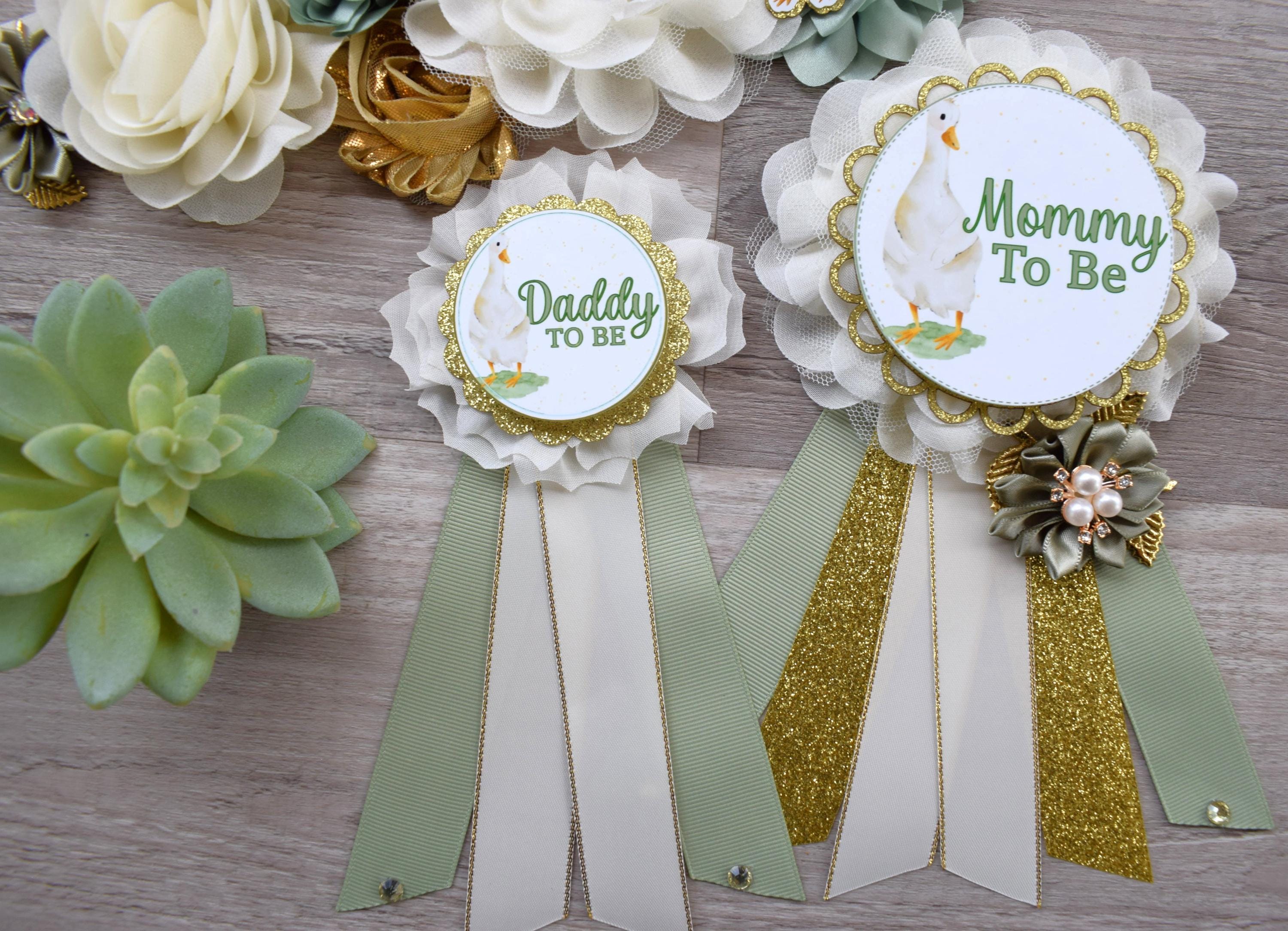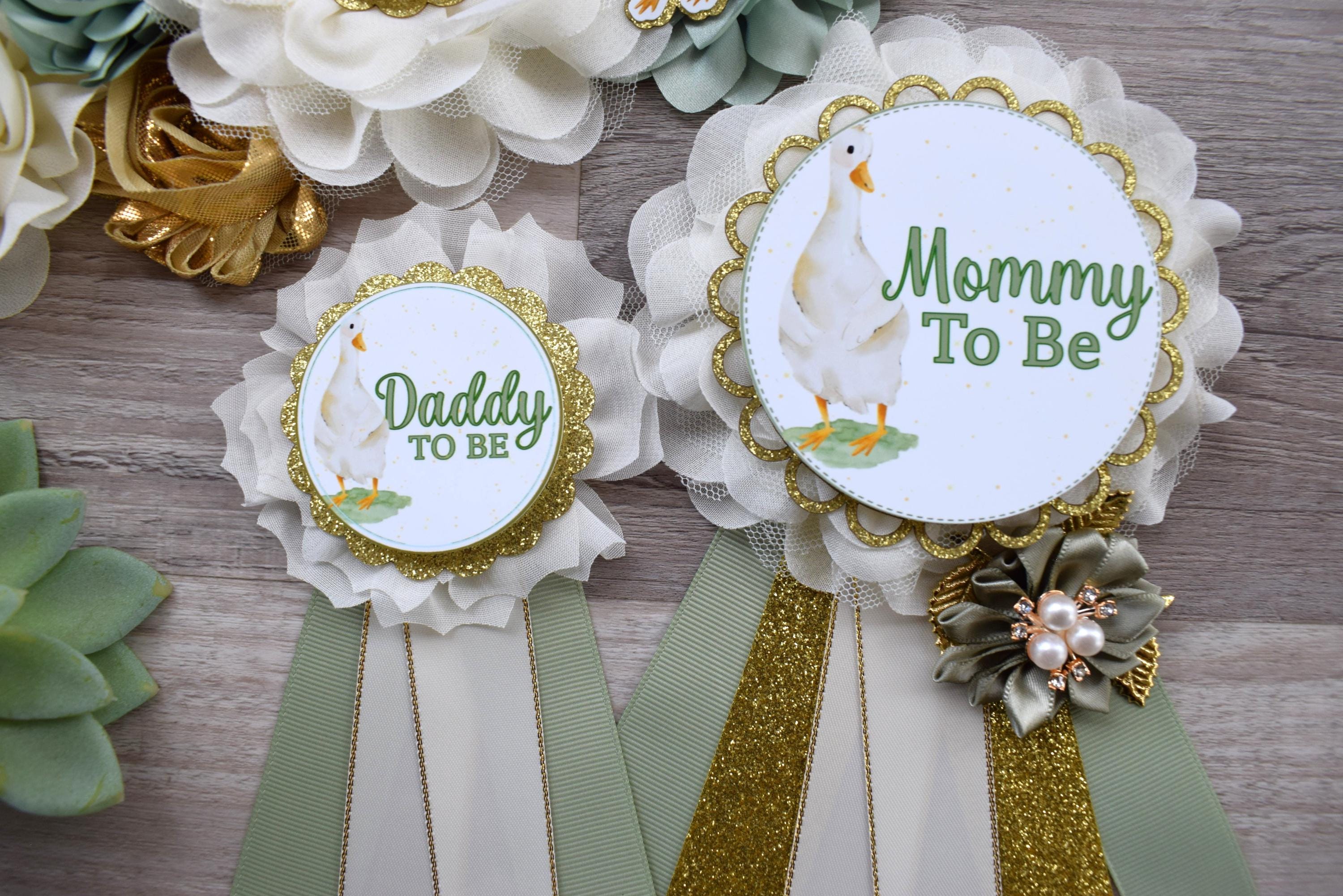 Silly Goose Baby Shower, Goose Maternity Belly Sash, Ivory Sage Gold Mommy To Be Ribbon Pin, Goose Daddy To Be Pin, Family Custom Pins