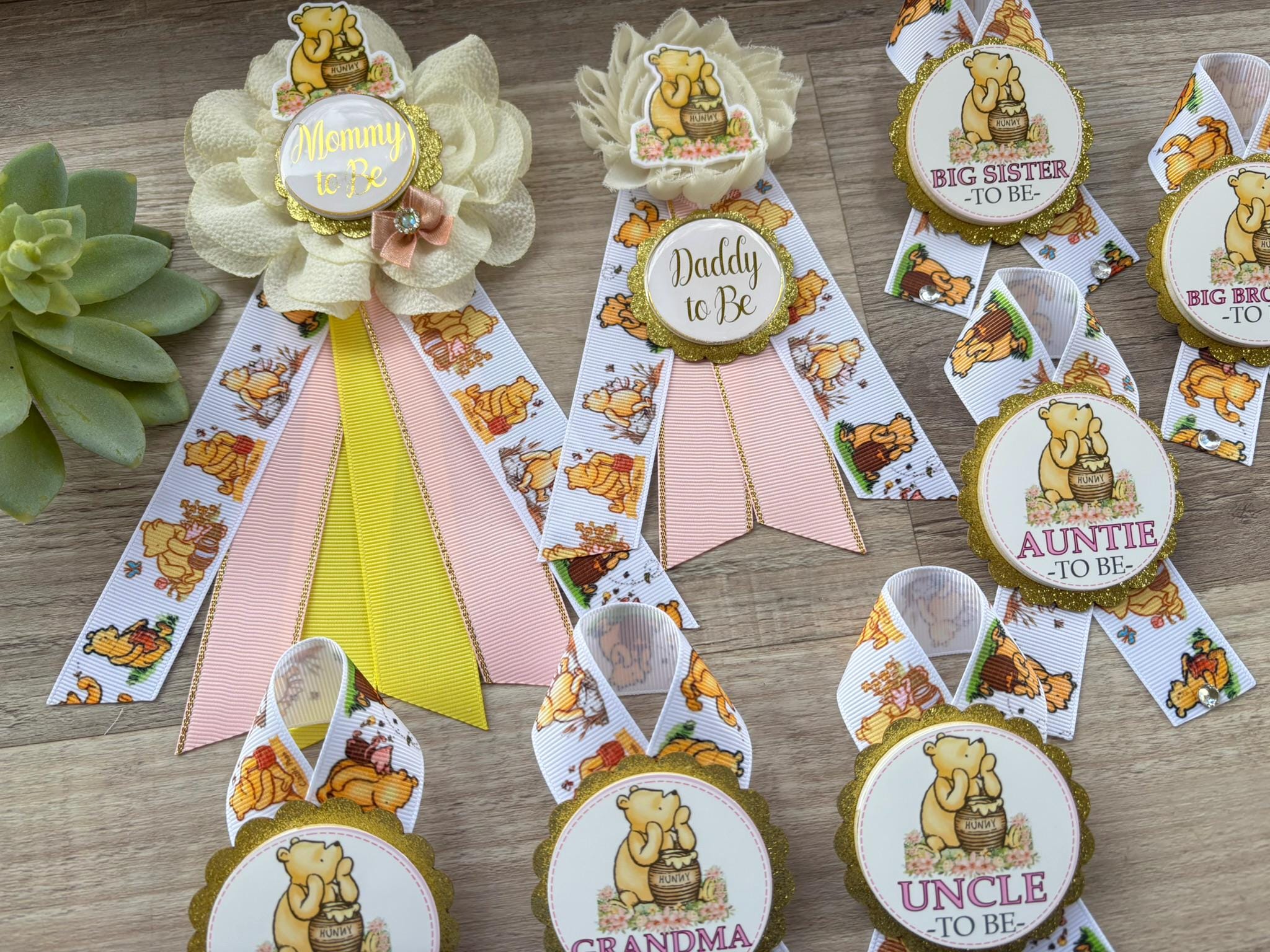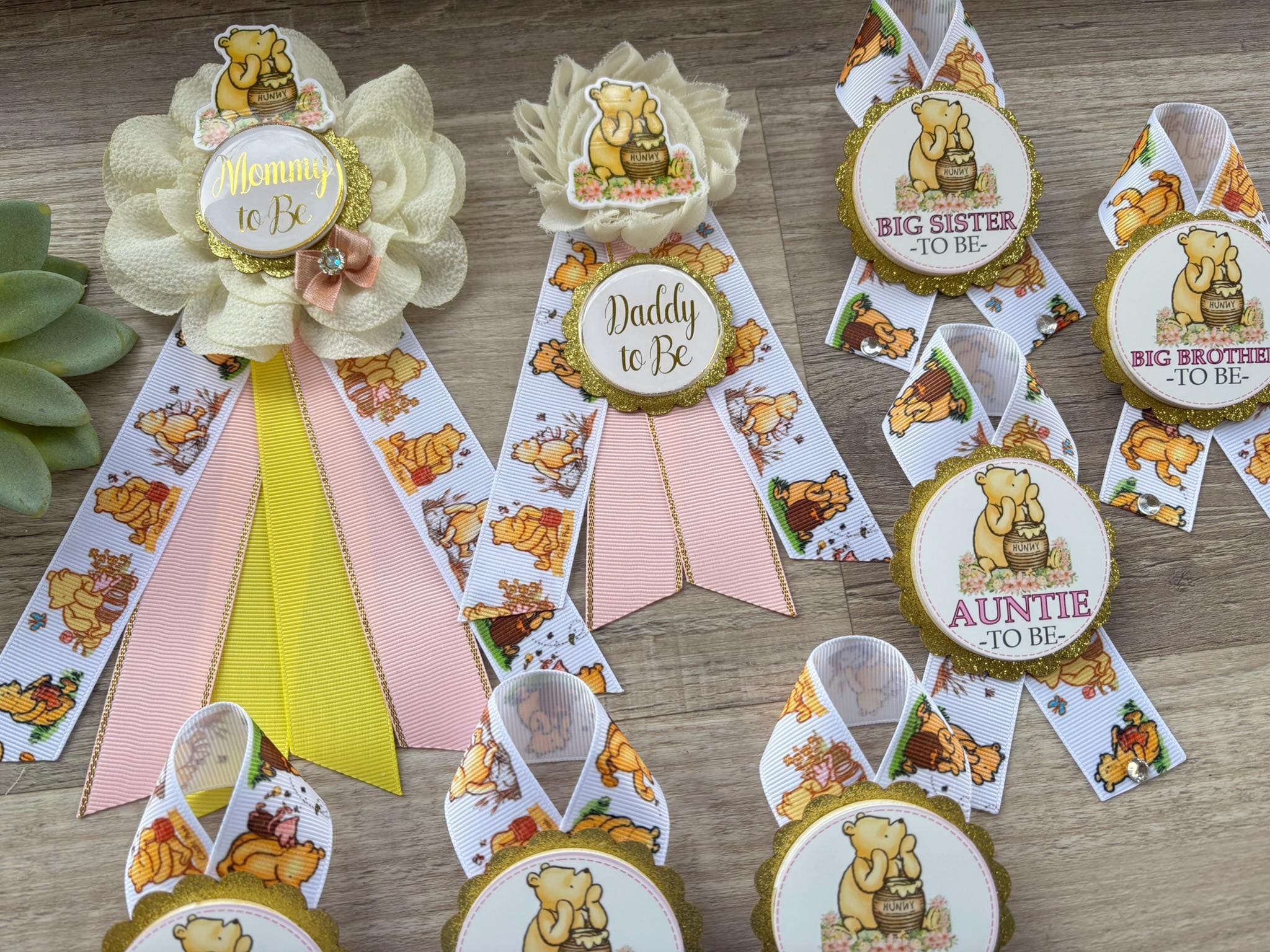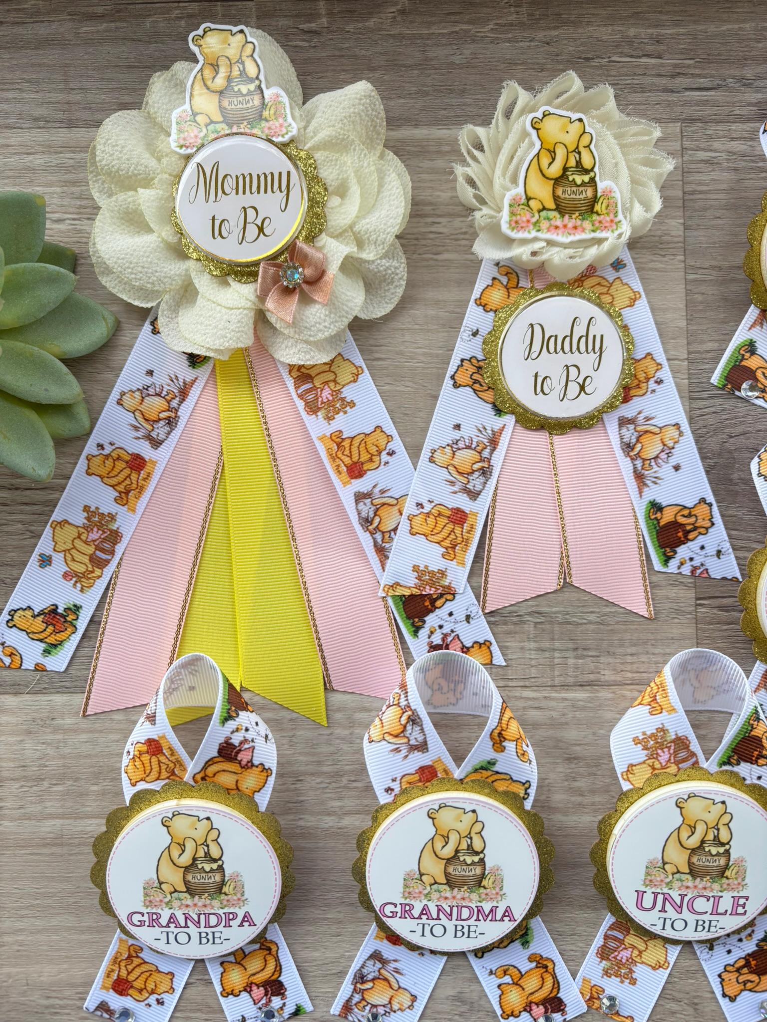 Girl Winnie The Pooh Baby Shower, Winnie the Pooh Mommy To Be Ribbon, Daddy To Be Pin, Winnie the Pooh Family Pins