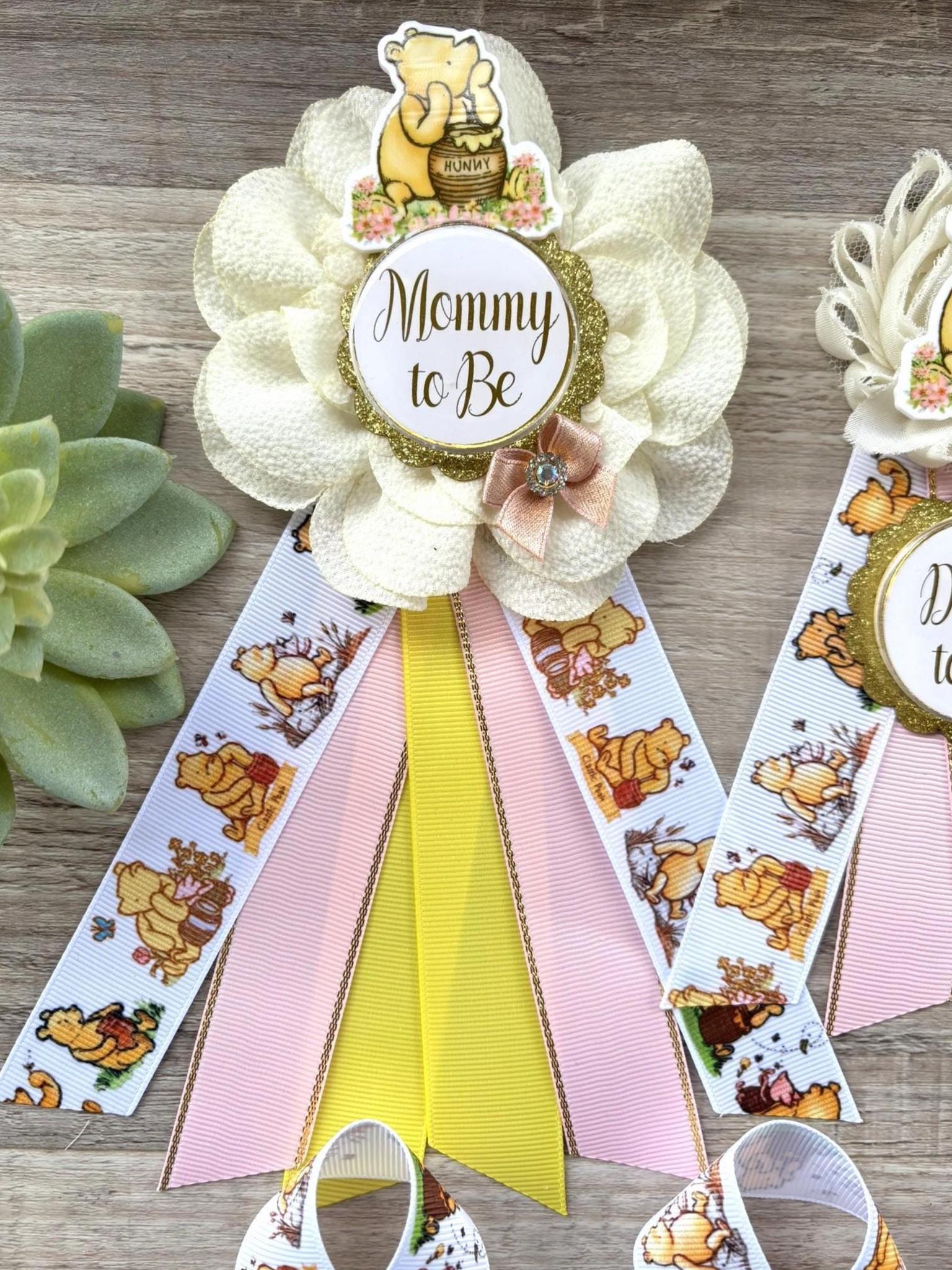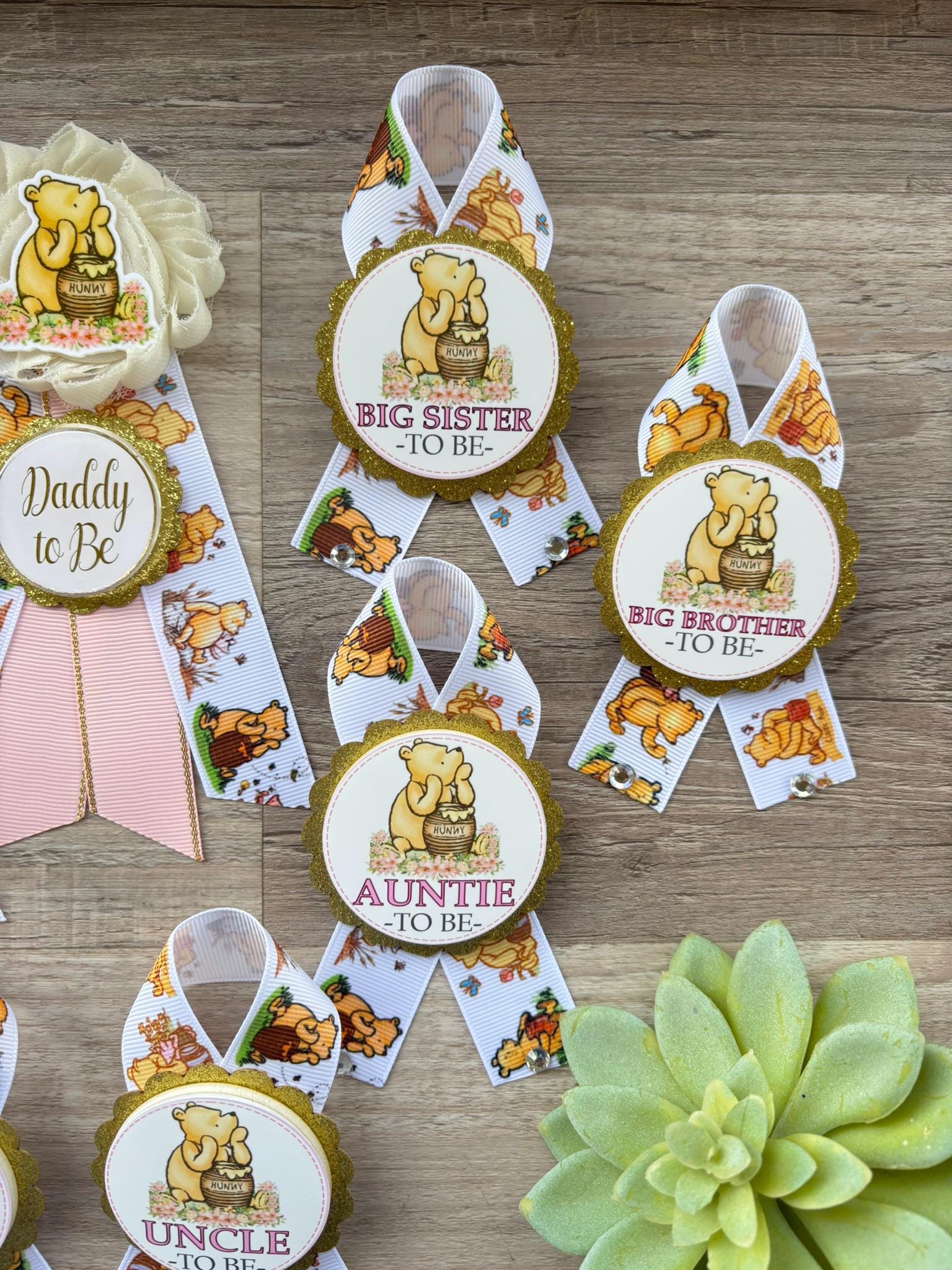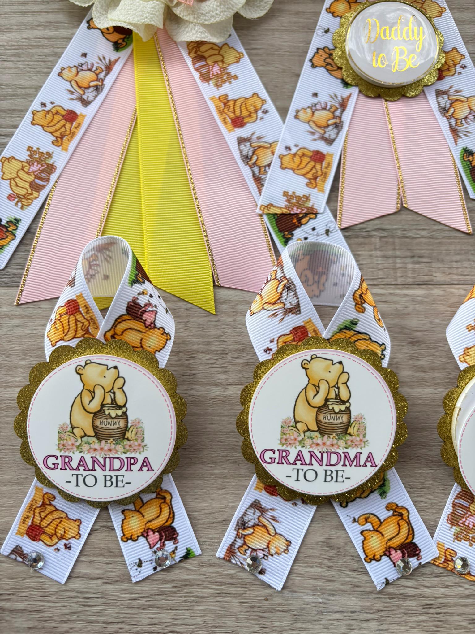 Girl Winnie The Pooh Baby Shower, Winnie the Pooh Mommy To Be Ribbon, Daddy To Be Pin, Winnie the Pooh Family Pins
