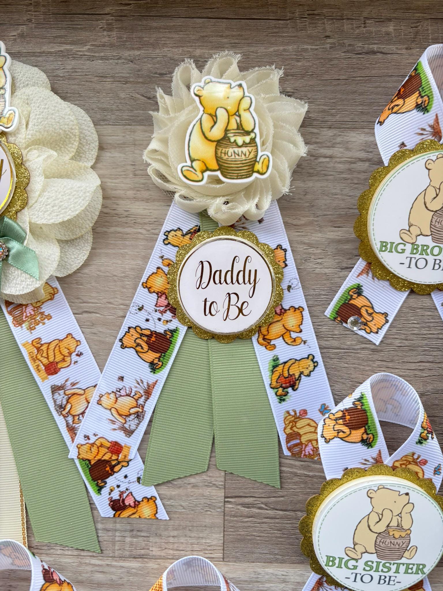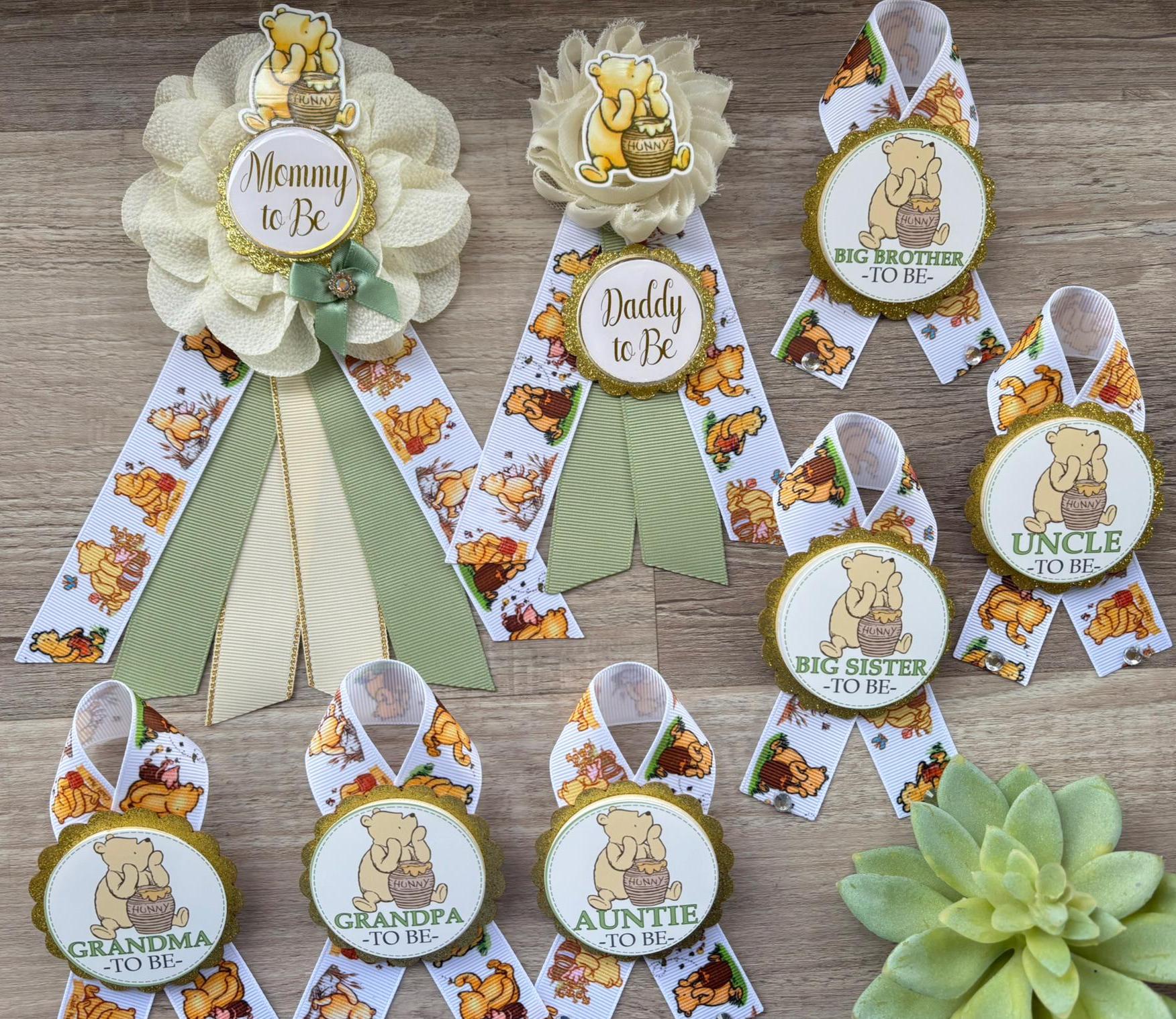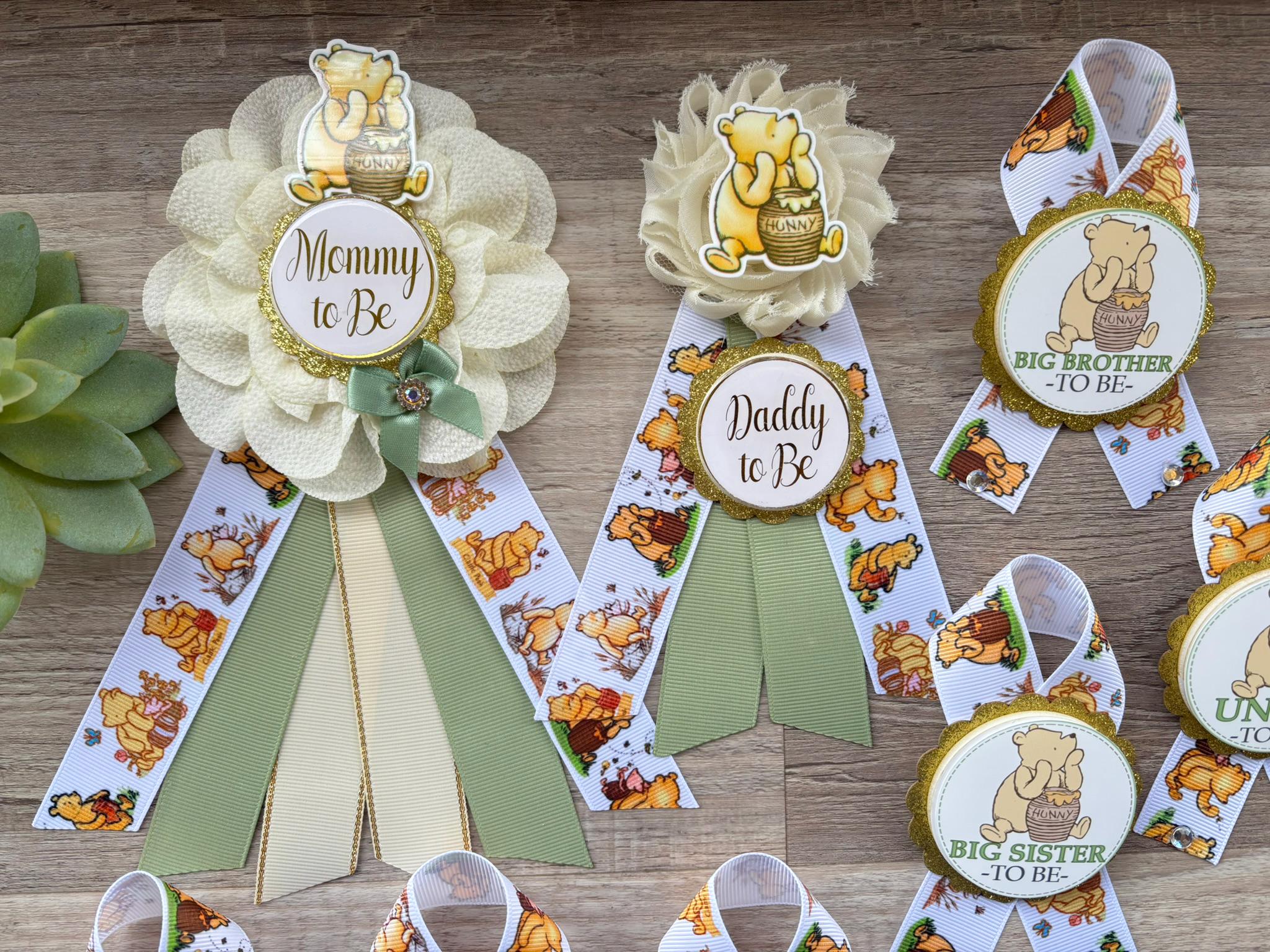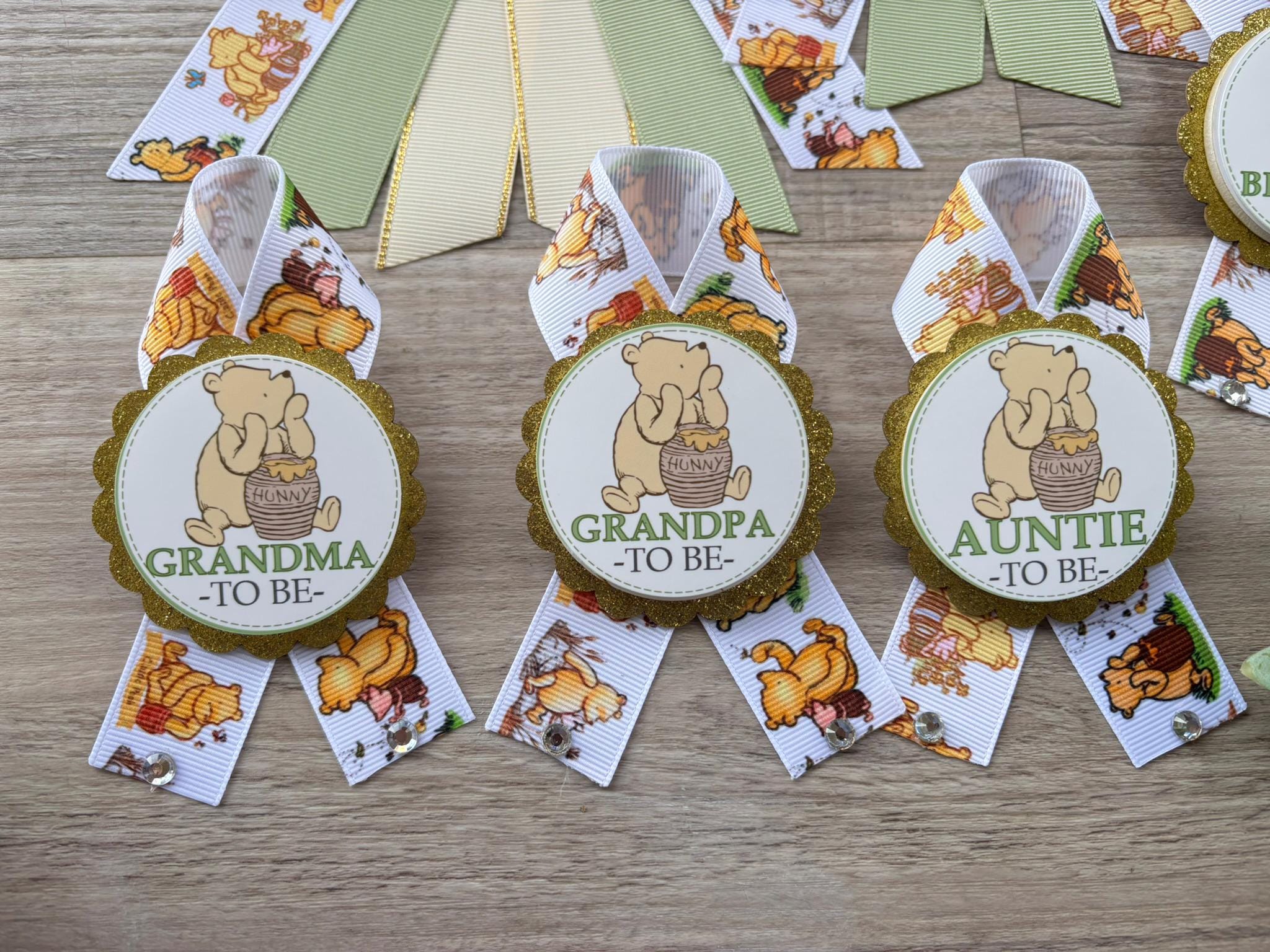 Winnie The Pooh Classic Baby Shower, Winnie the Pooh Mommy To Be Ribbon, Daddy To Be Pin, Winnie the Pooh Family Pins