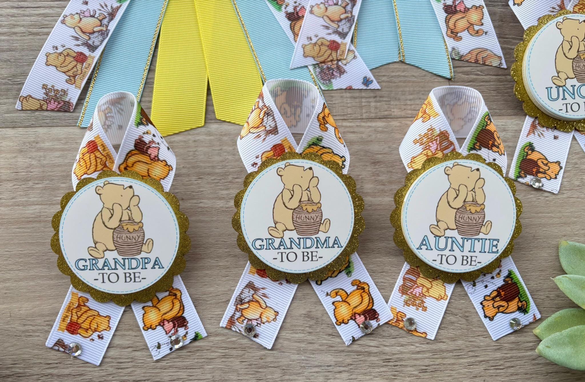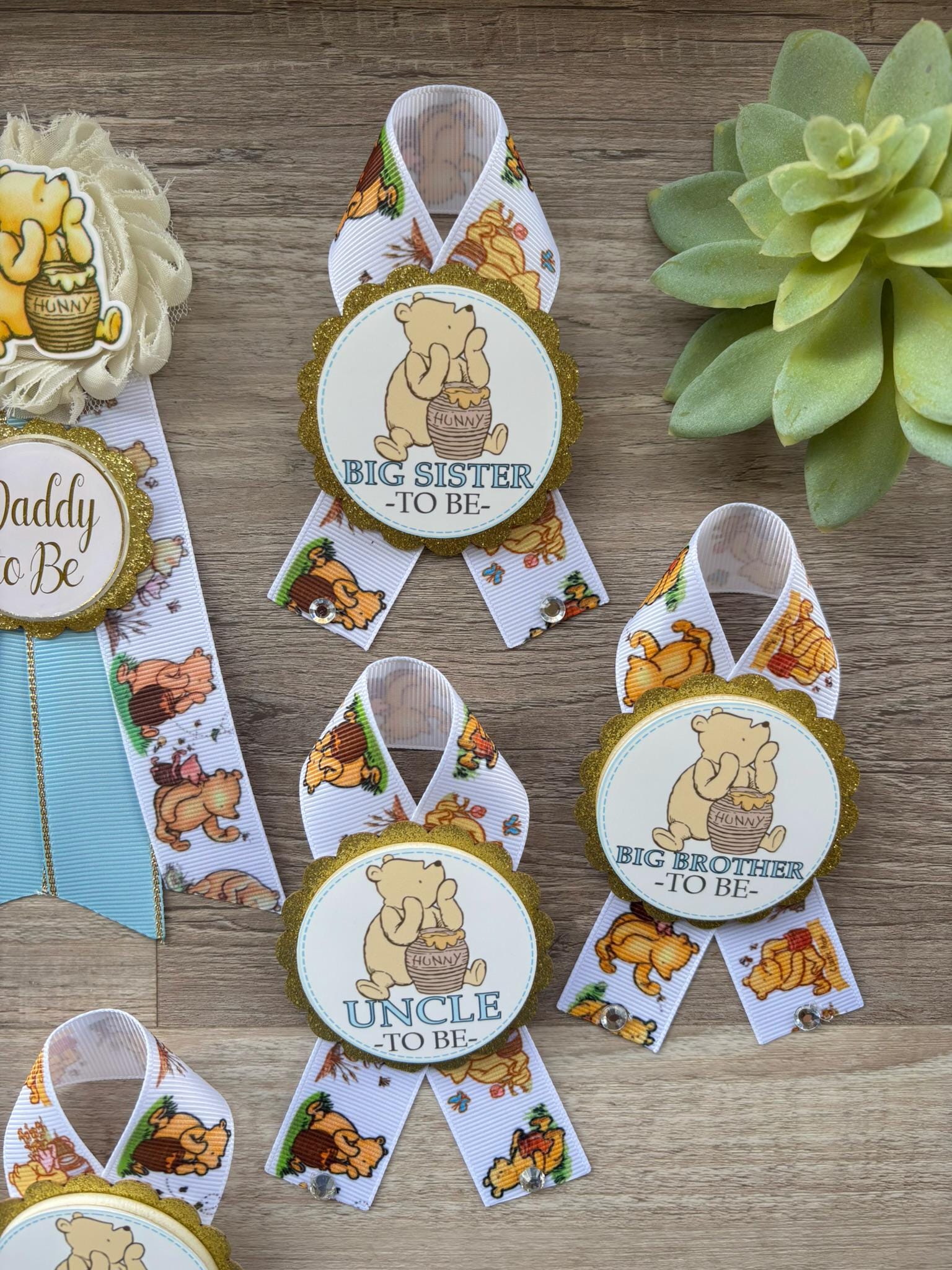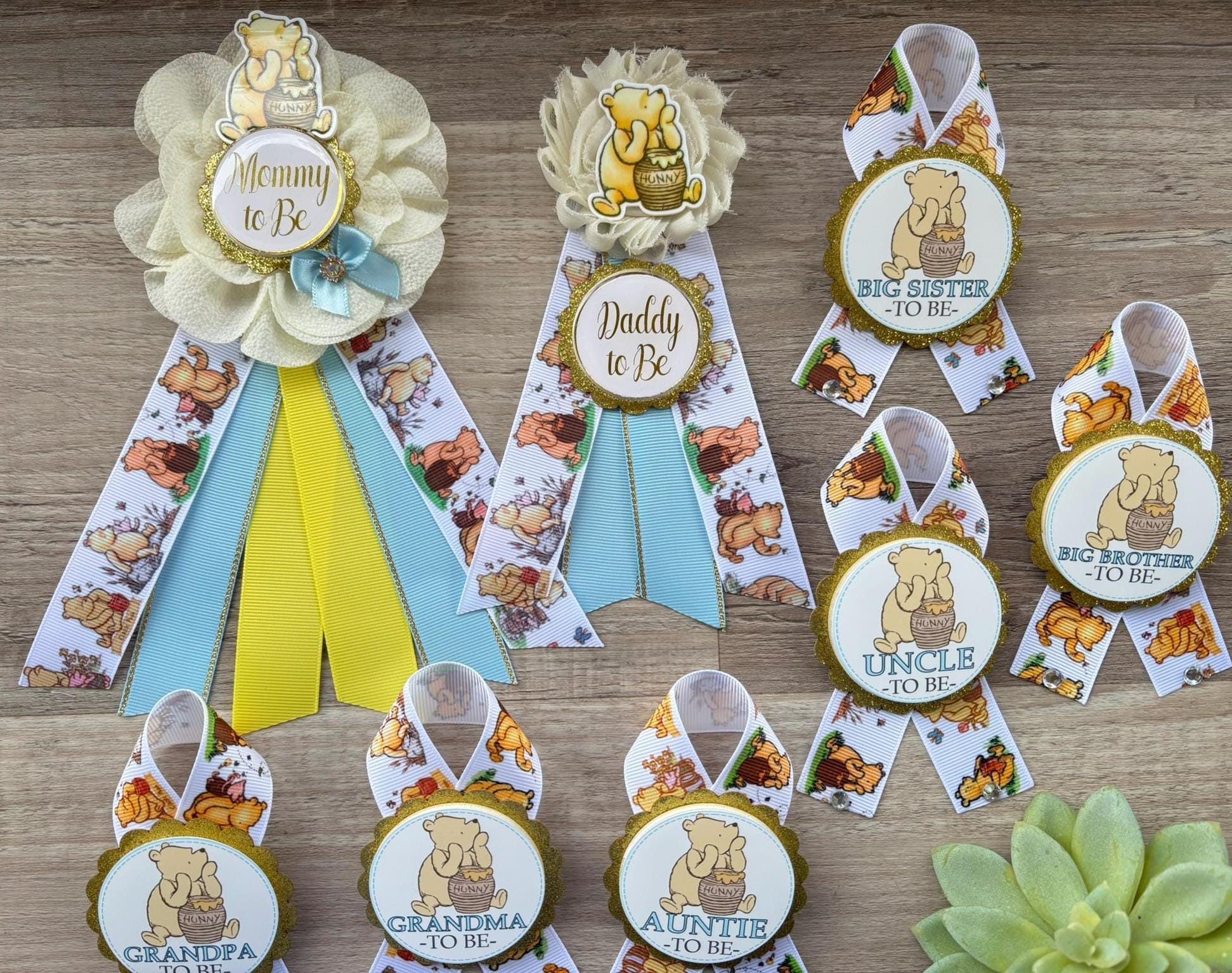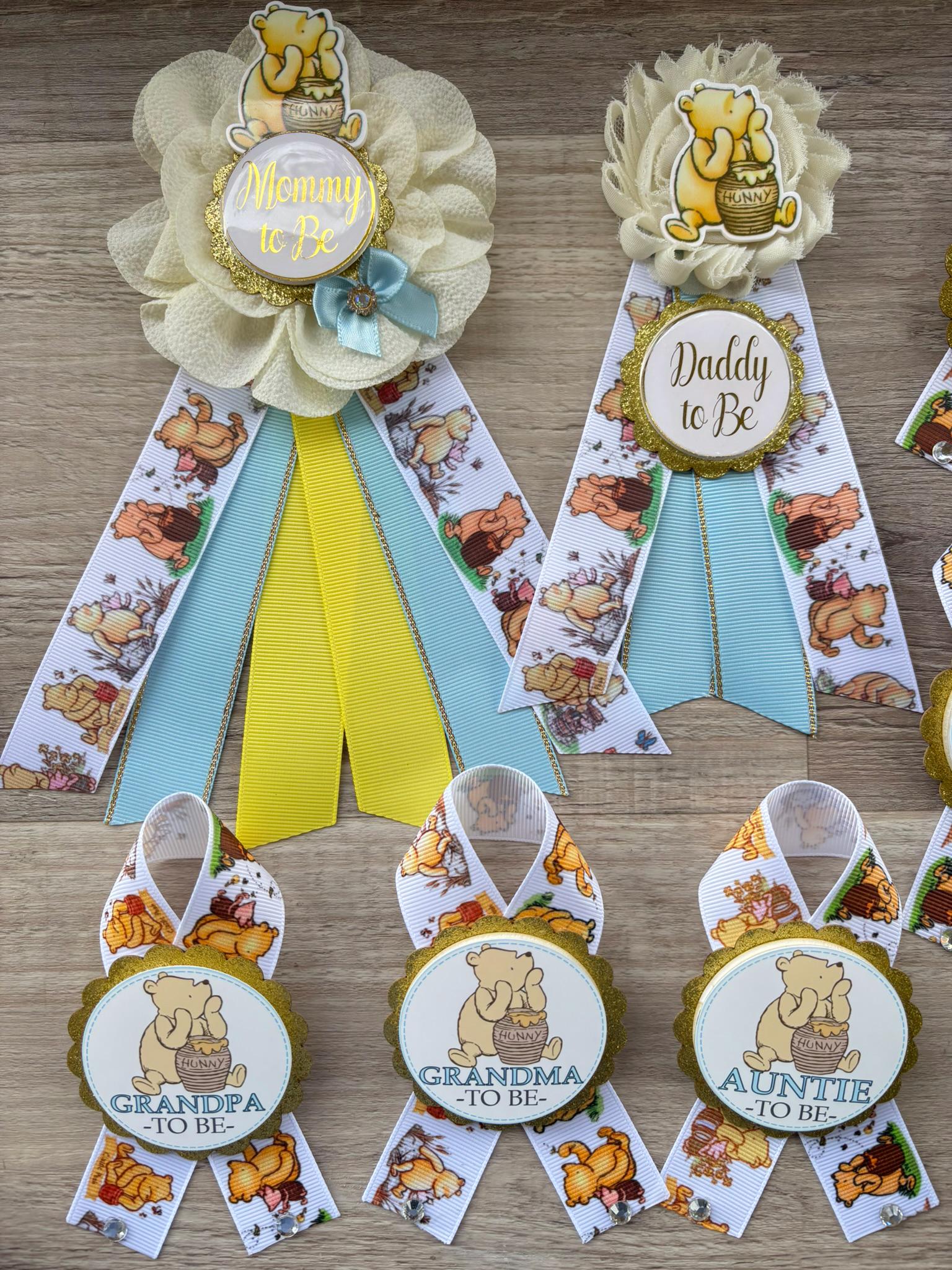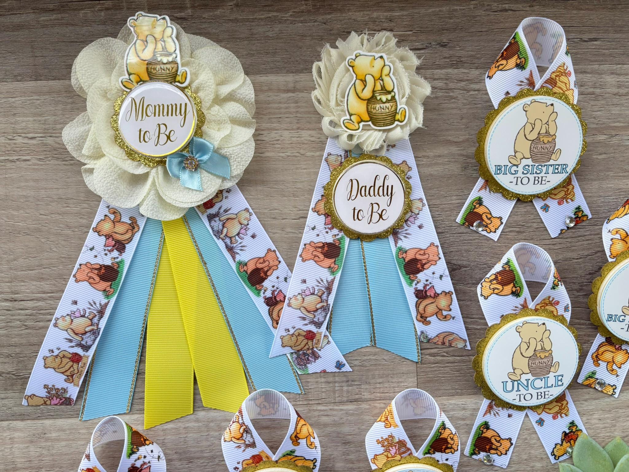 Blue Winnie The Pooh Classic Baby Shower, Boy Winnie the Pooh Mommy To Be Ribbon, Daddy To Be Pin, Winnie the Pooh Family Pins