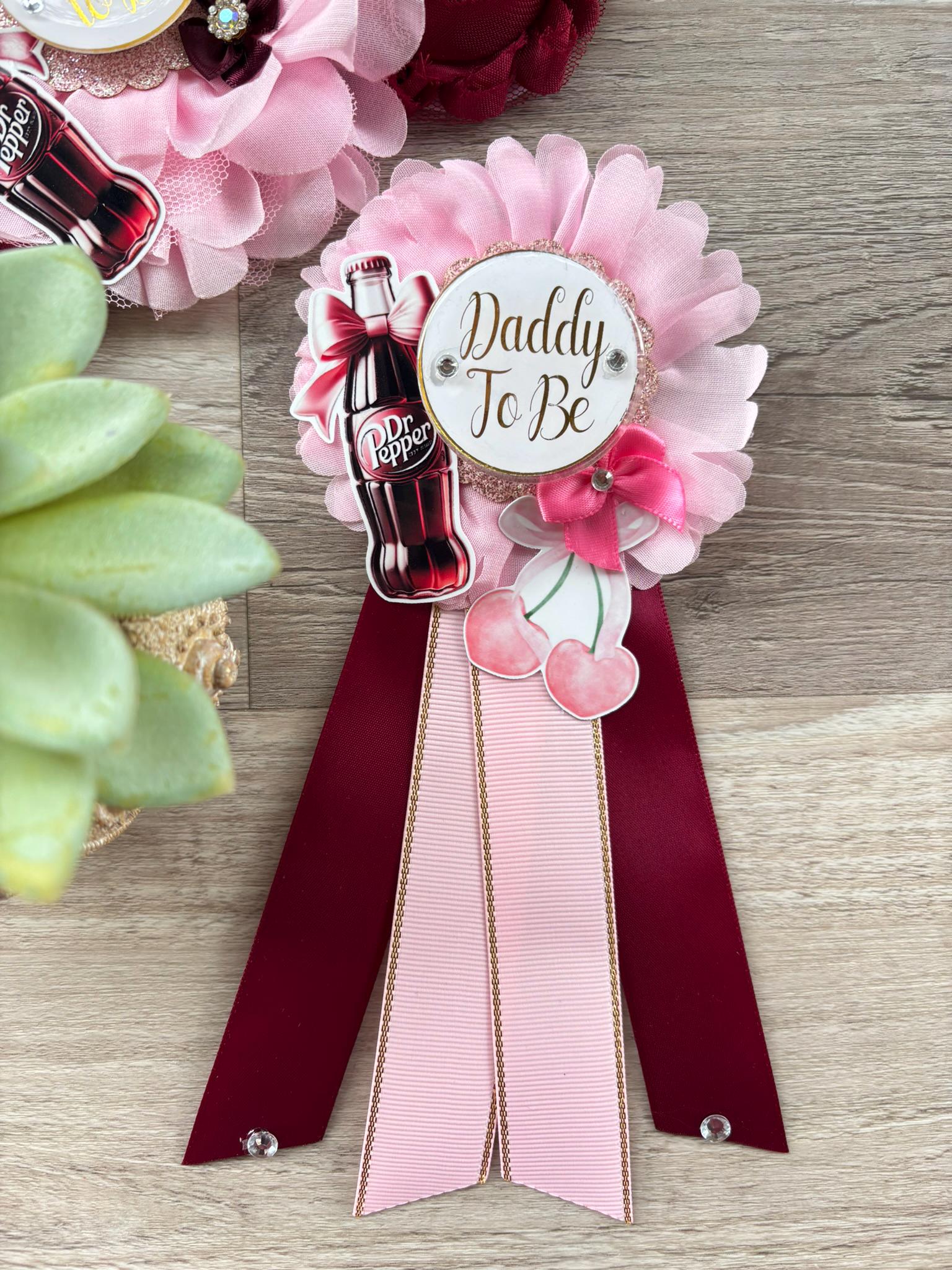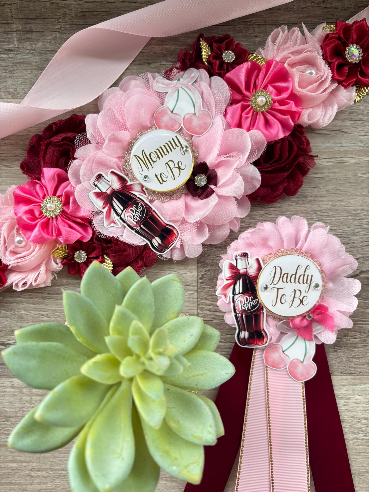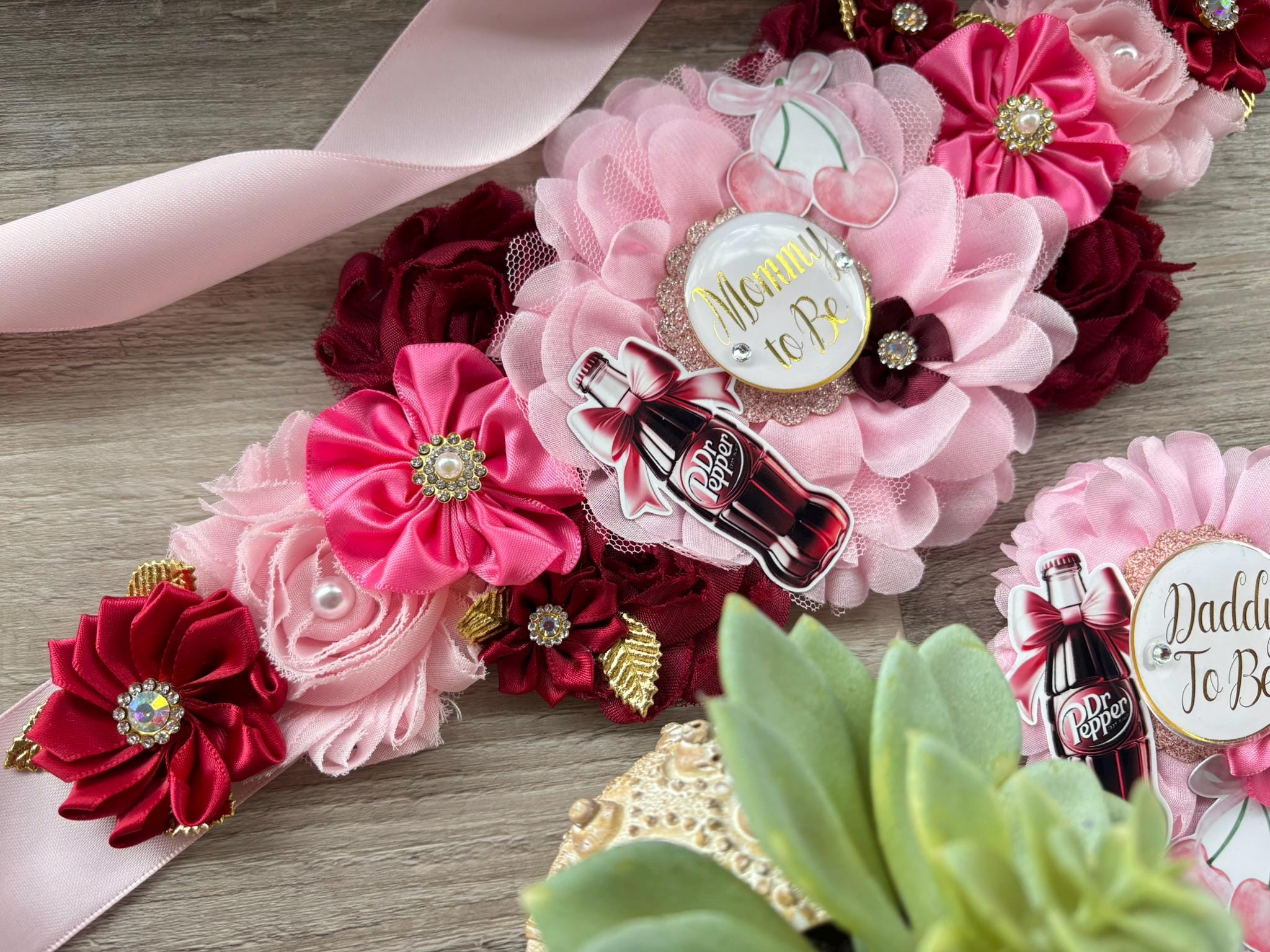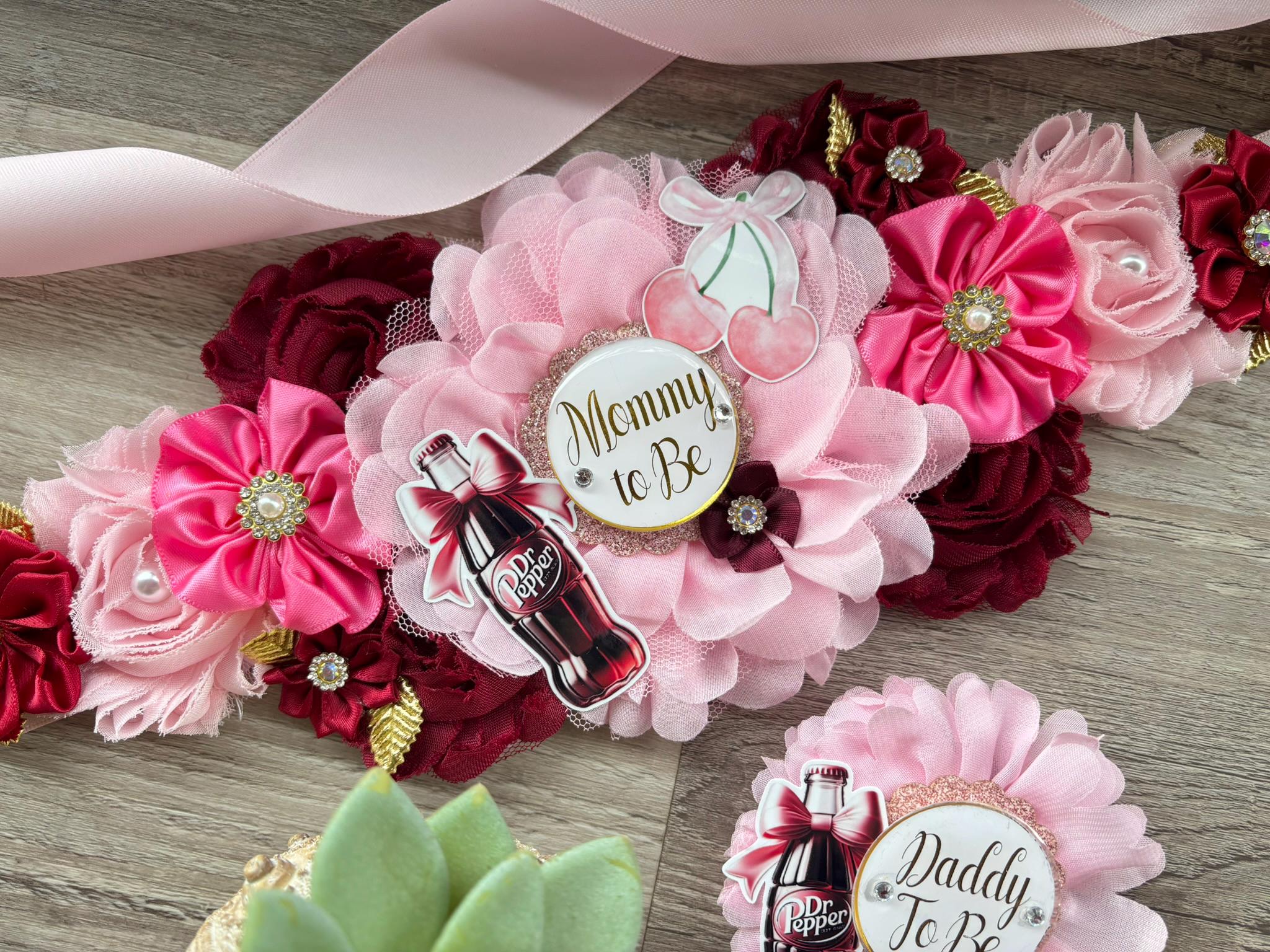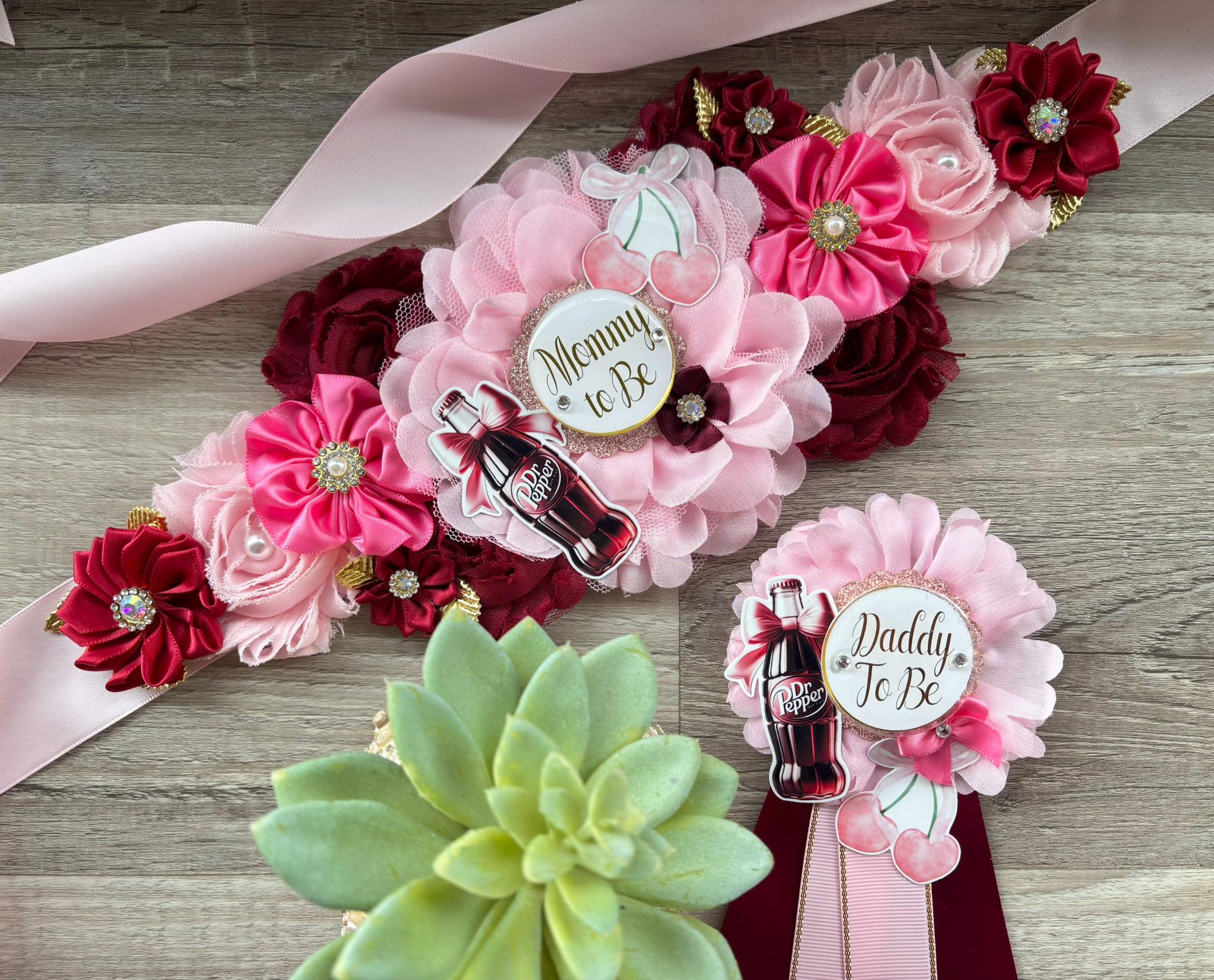 Dr Pepper and Cherry Baby Shower, Pink Maroon Maternity Sash, Girl Mom To Be Sash, Pepper Daddy To Be Pin, Baby Shower Gift, Custom