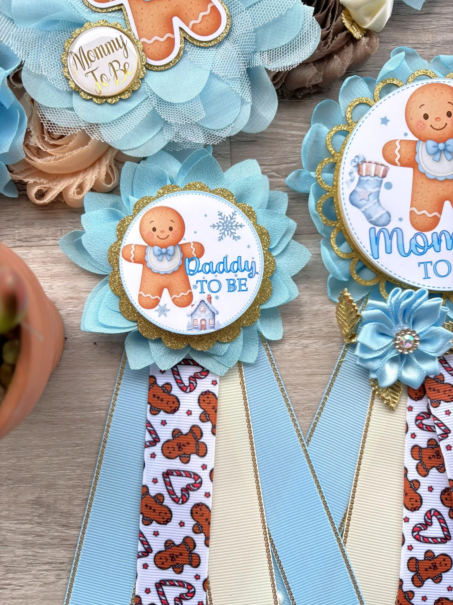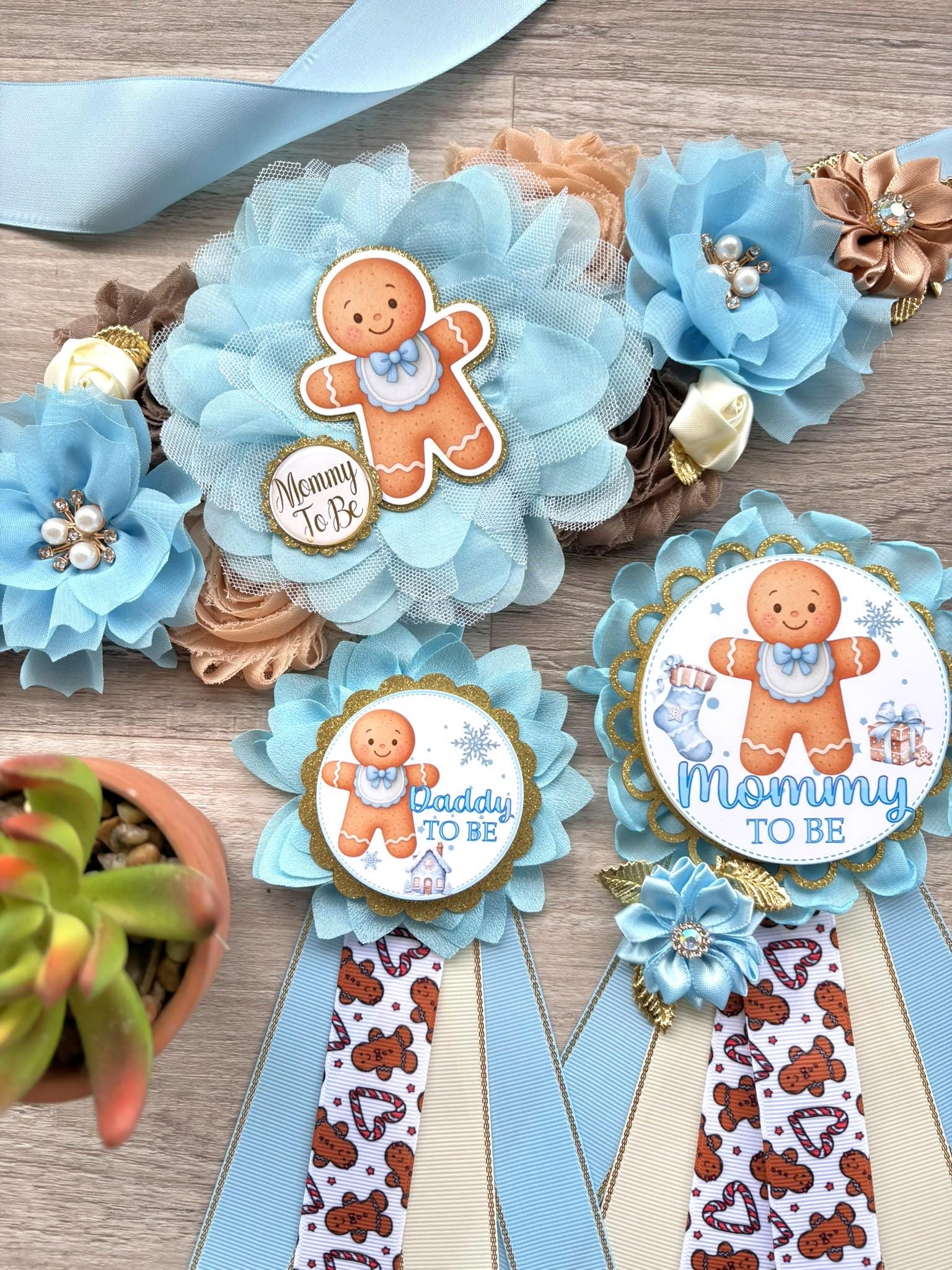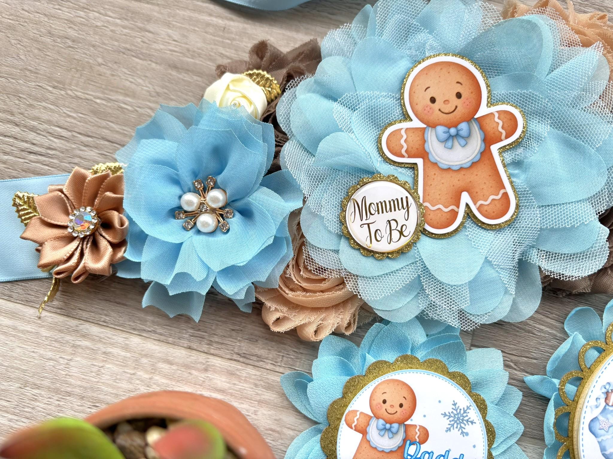 Boy Gingerbread Baby Shower Set, Blue Maternity Sash, Winter Mommy To Be Pin, Daddy To Be Pin, Baby Shower Gift, Custom Order Welcome