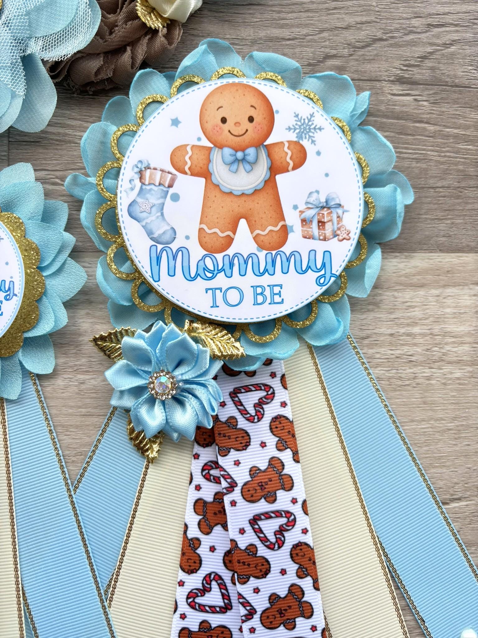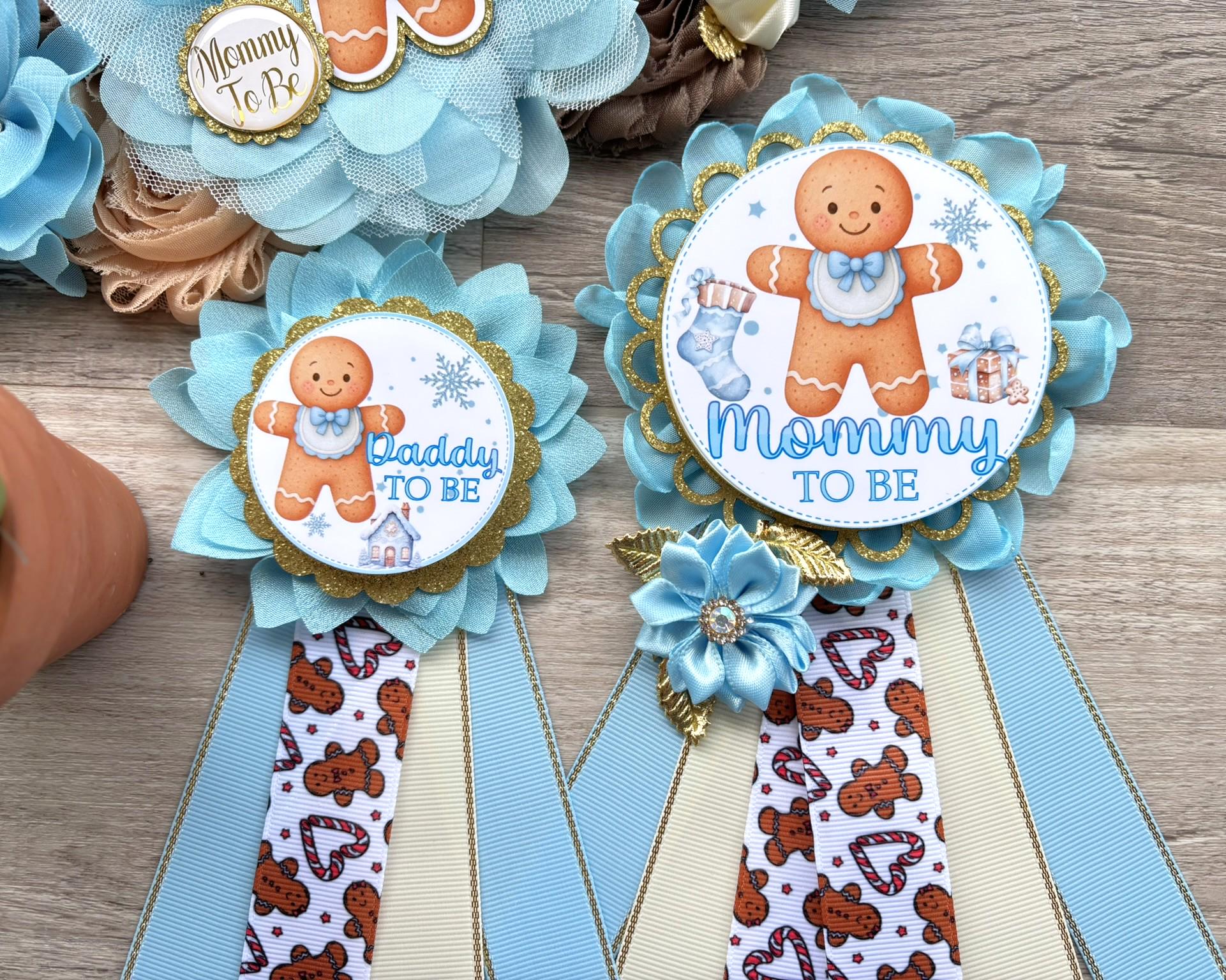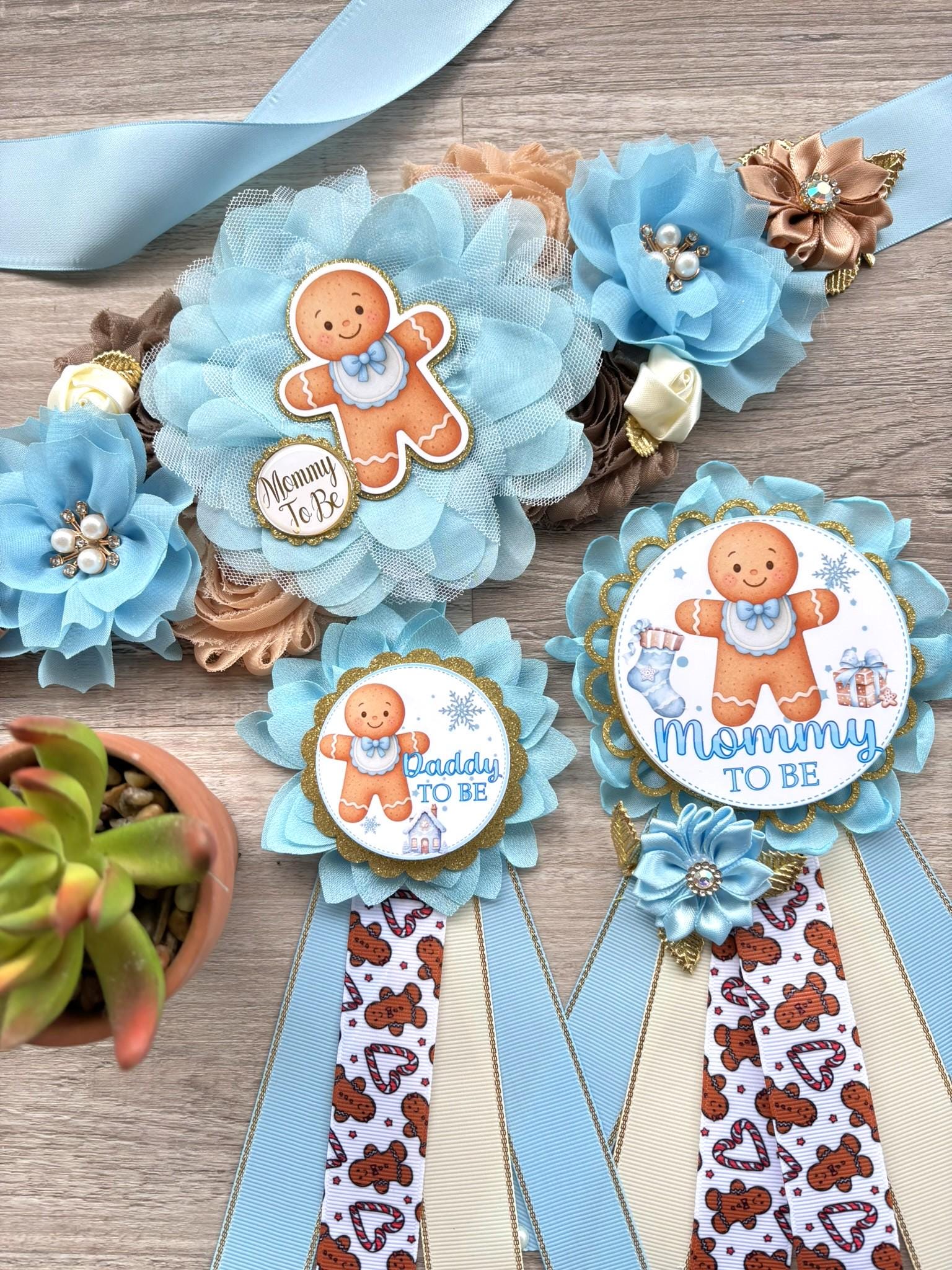 Boy Gingerbread Baby Shower Set, Blue Maternity Sash, Winter Mommy To Be Pin, Daddy To Be Pin, Baby Shower Gift, Custom Order Welcome