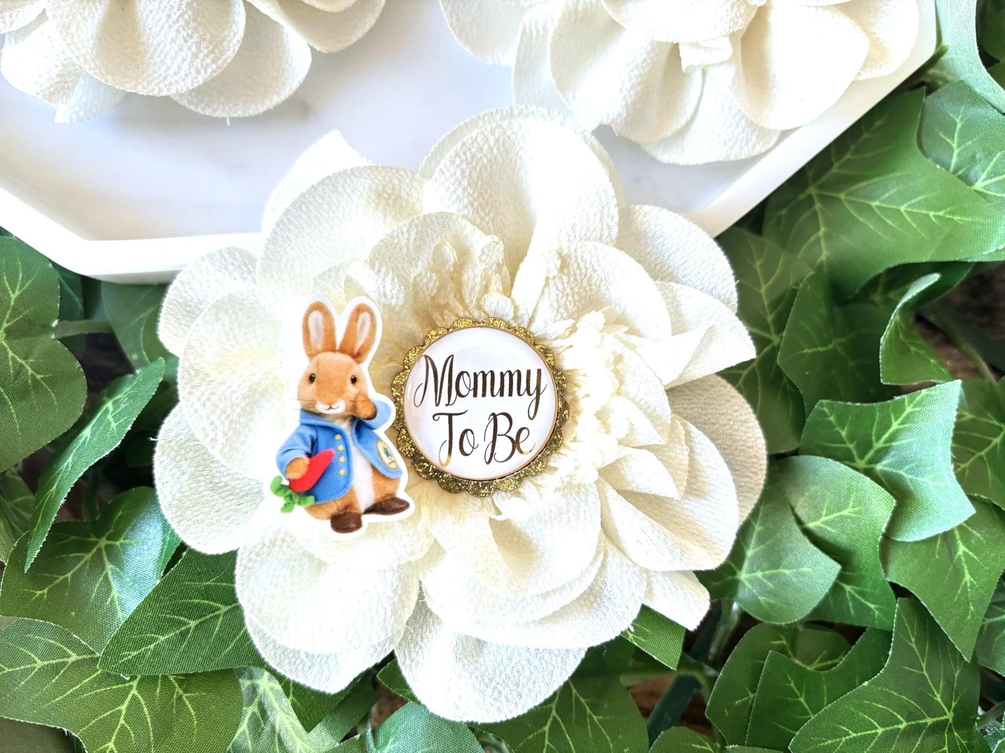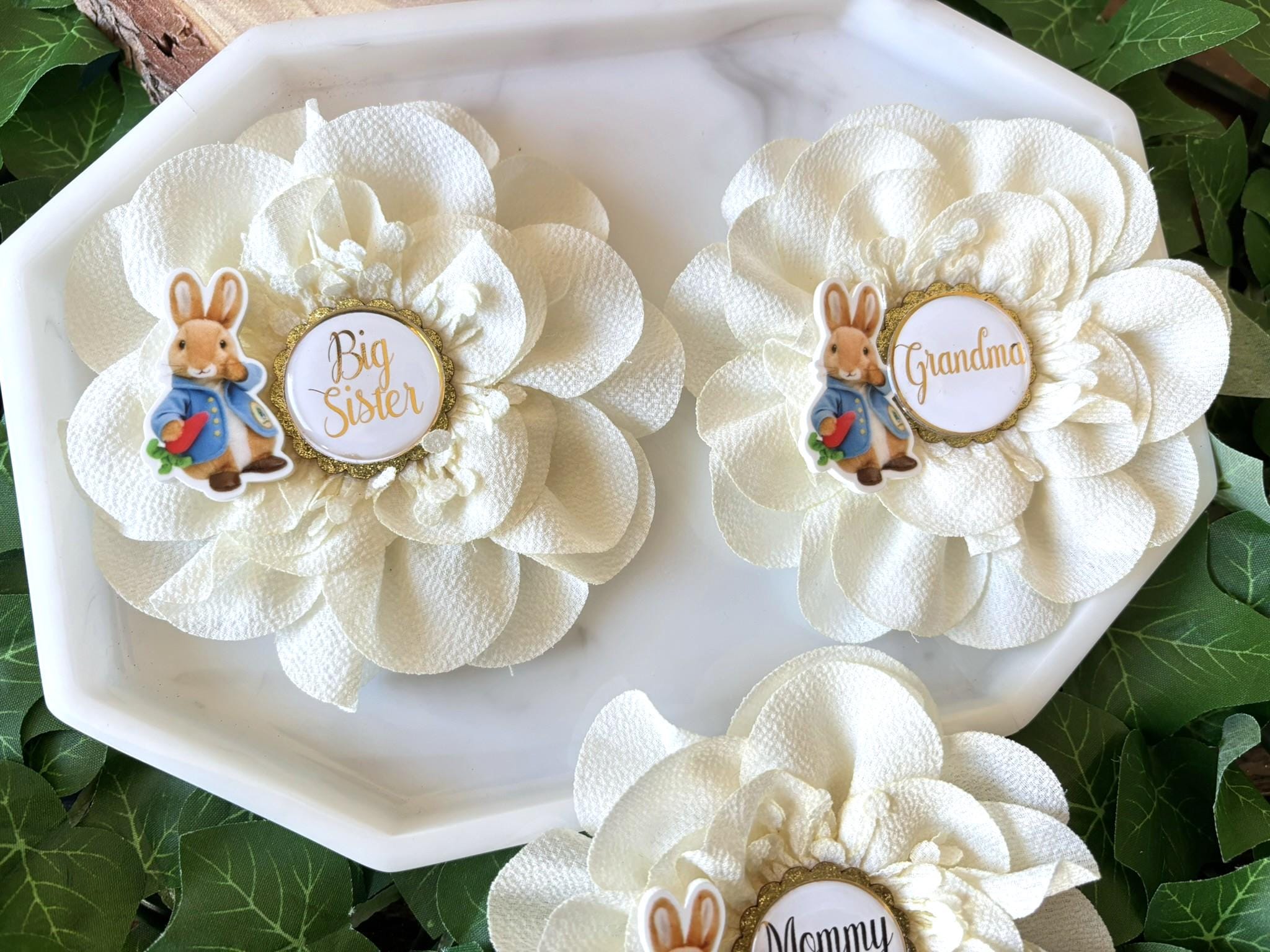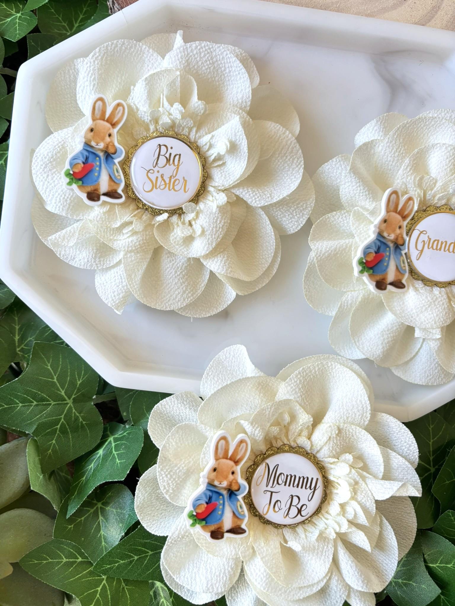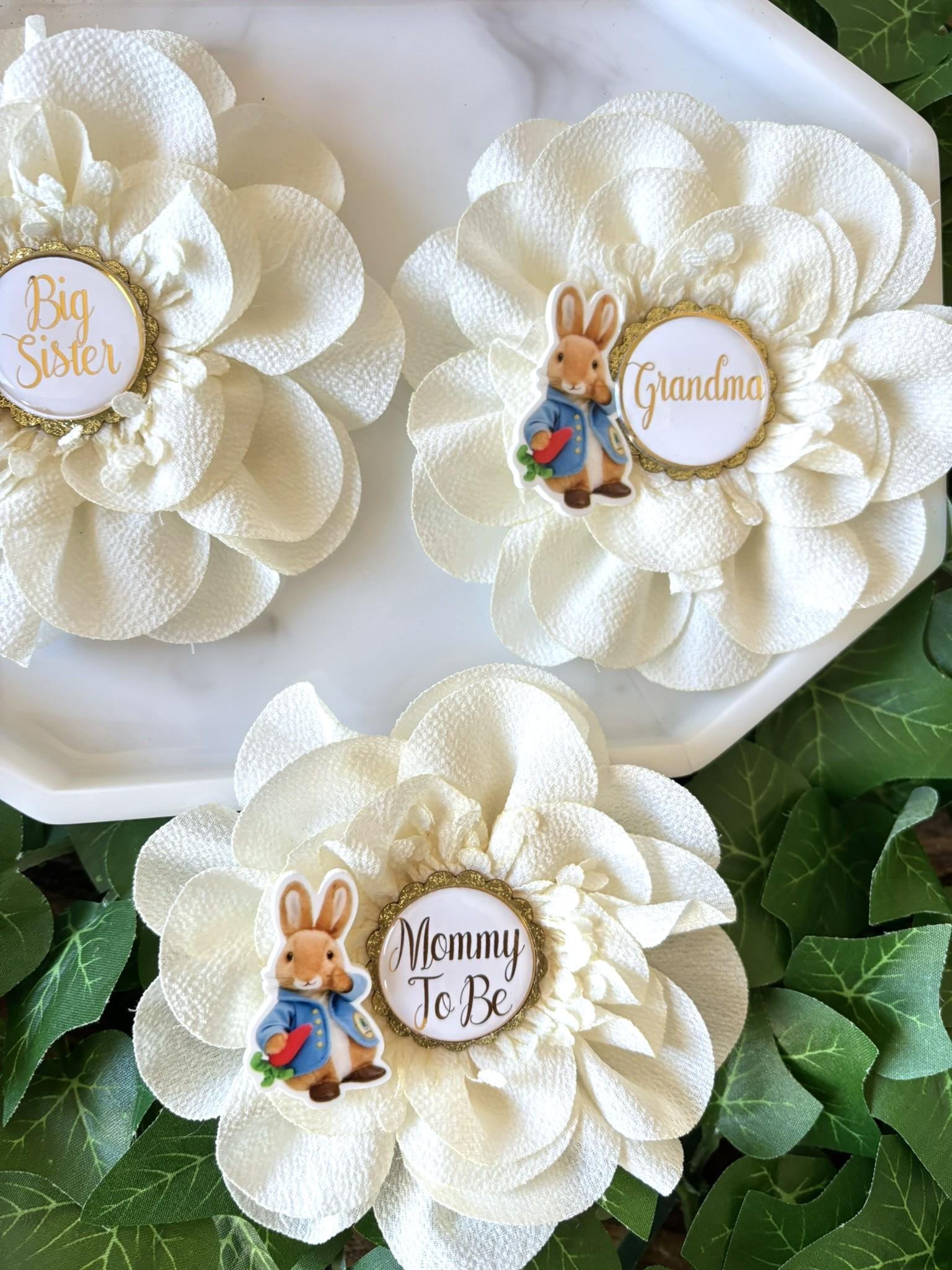 Boy Rabbit Baby Shower Pin, Mommy To Be Pin, Daddy To Be Pin, Big Sister, Big Brother, Grandma, Grandpa, Custom Wording Available