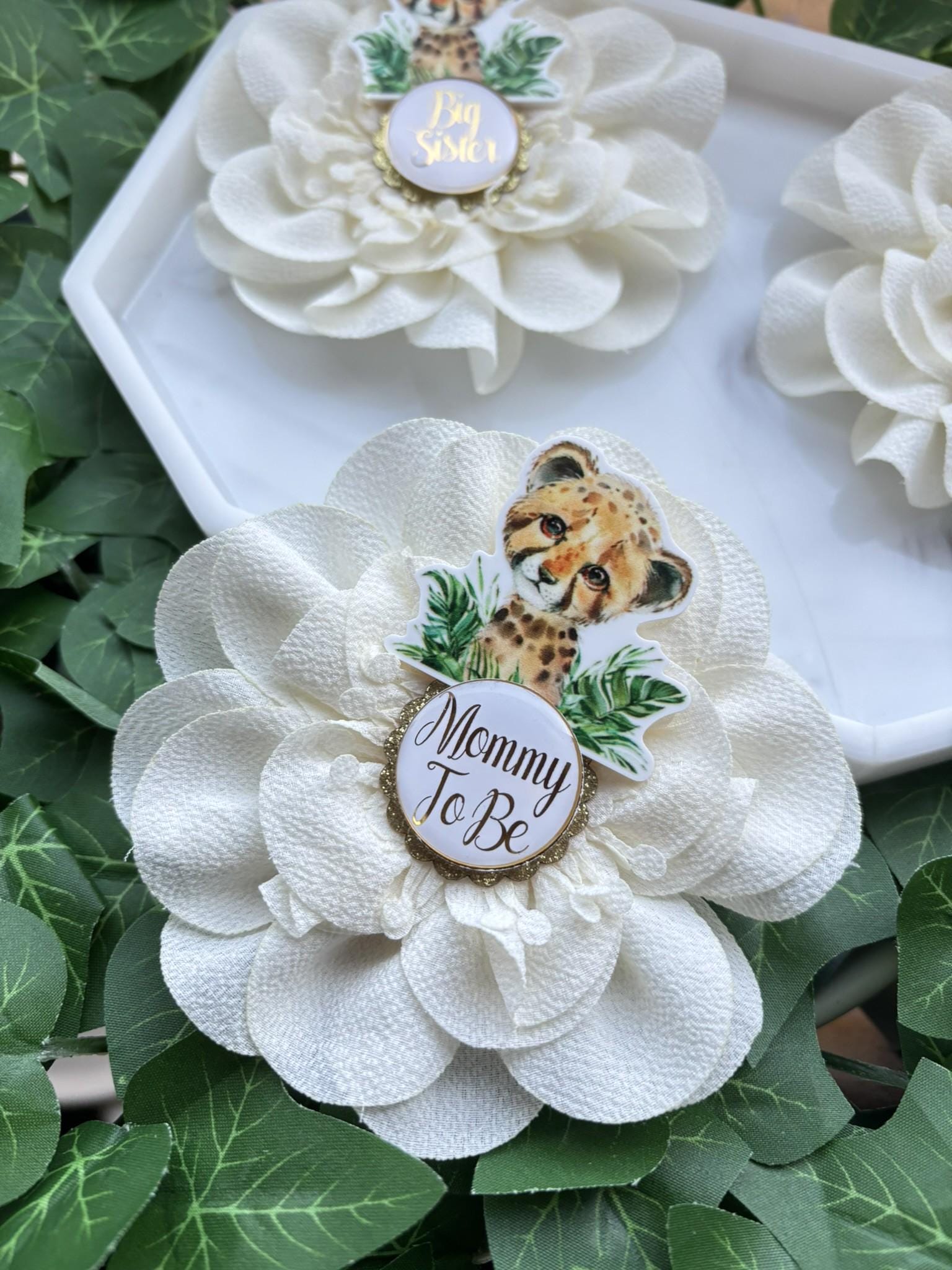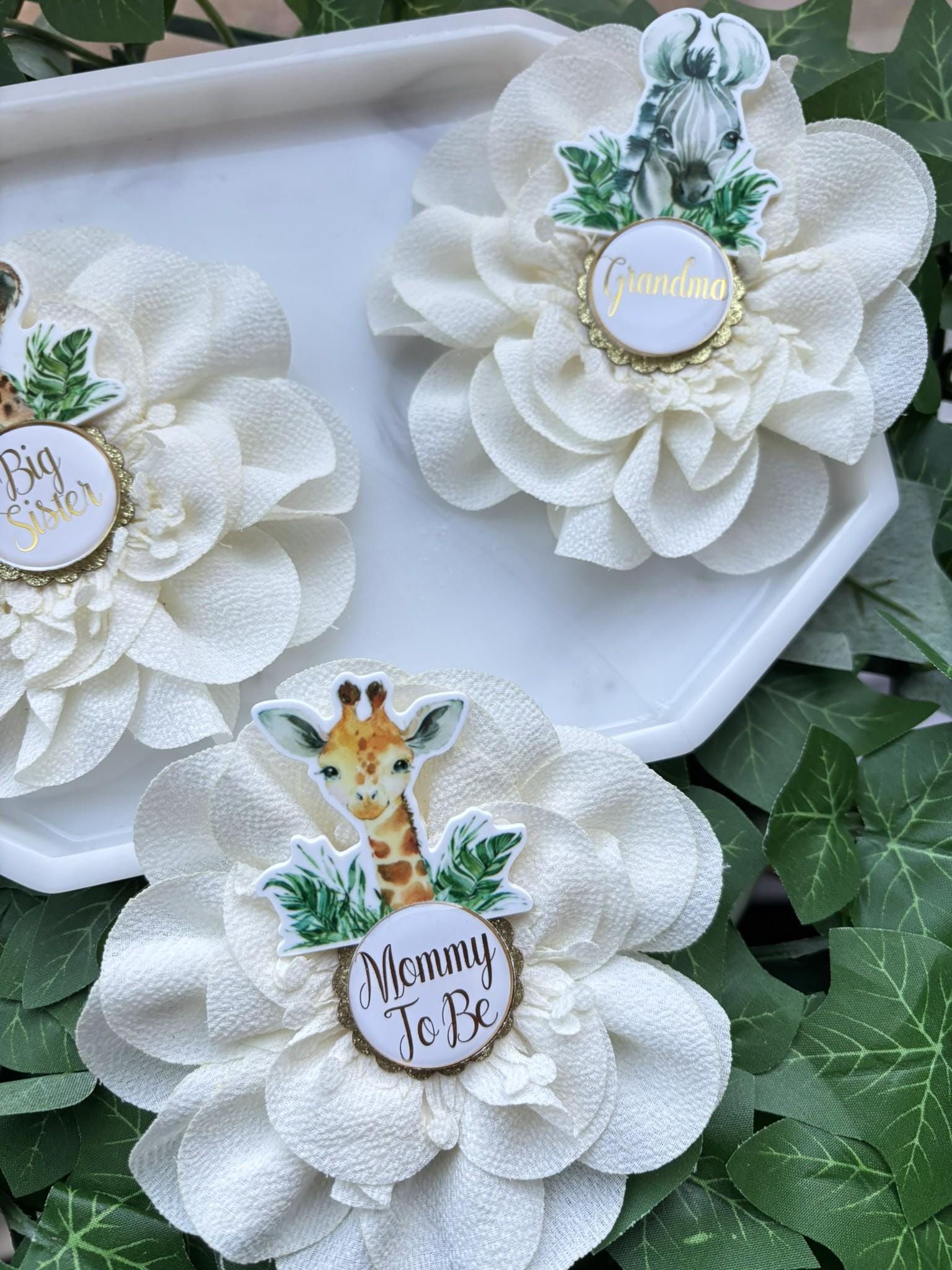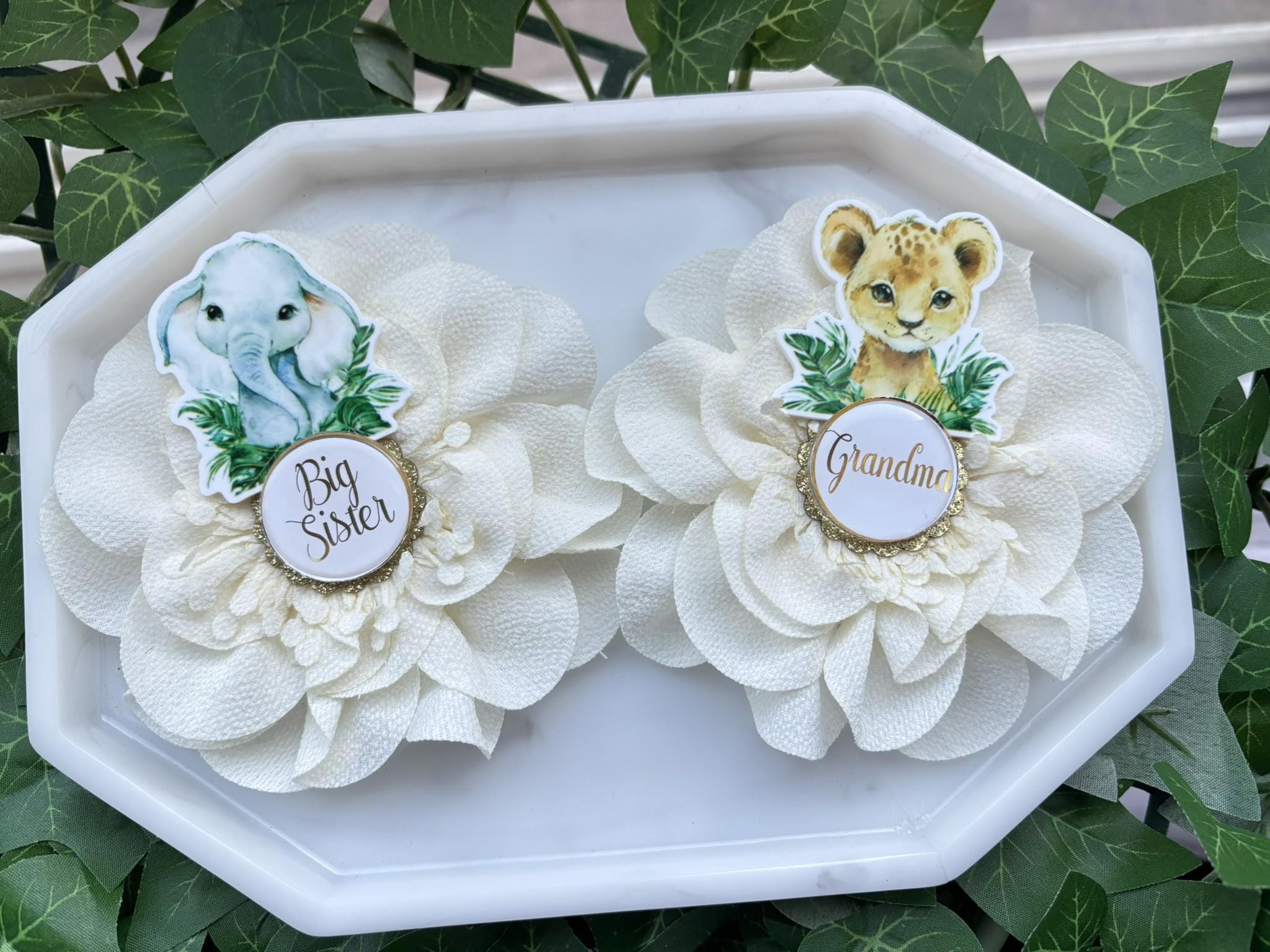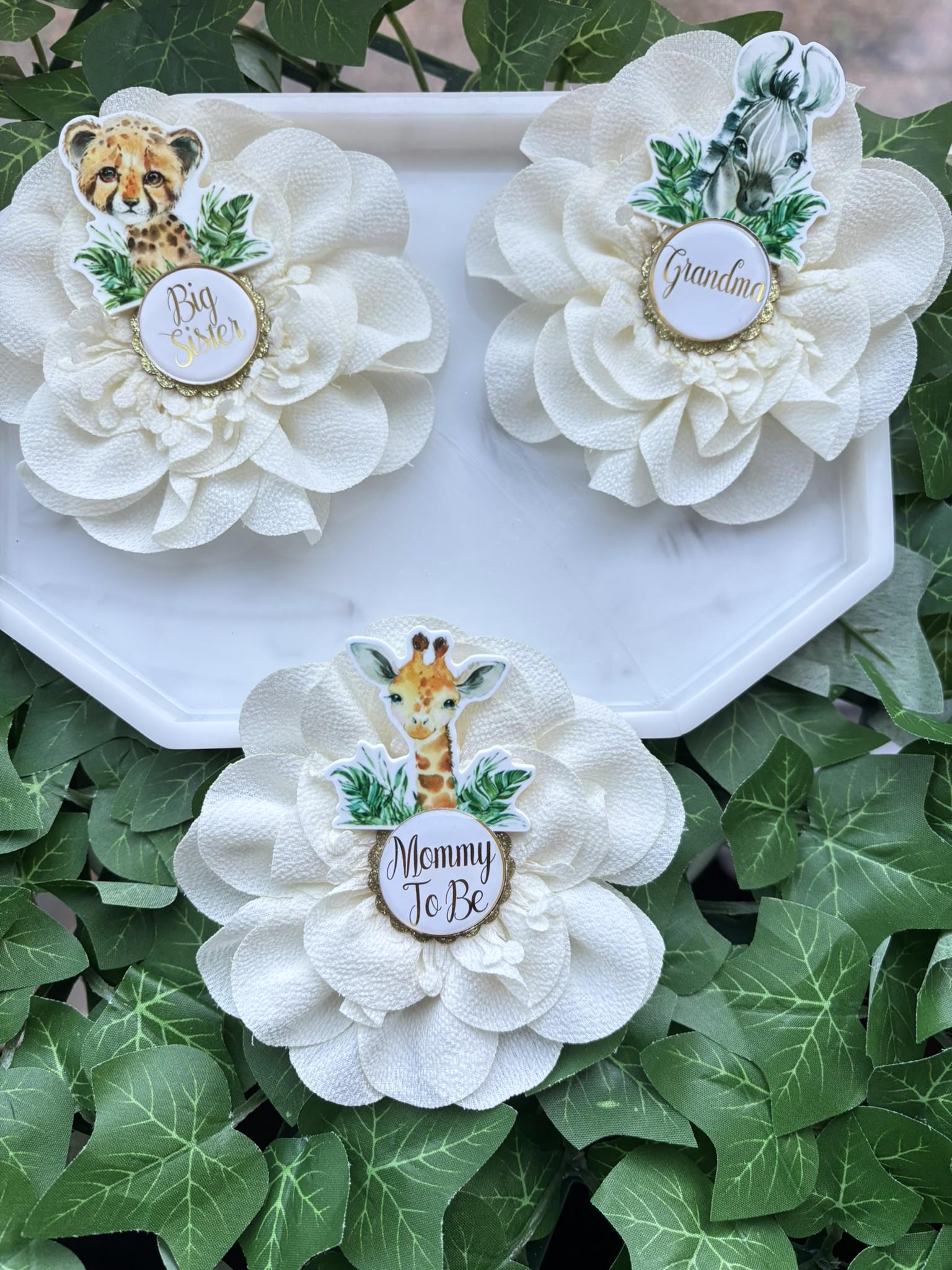 Animal Safari Baby Shower Pin, Mommy To Be Pin, Daddy To Be Pin, Big Sister, Big Brother, Grandma, Grandpa, Custom Wording Available