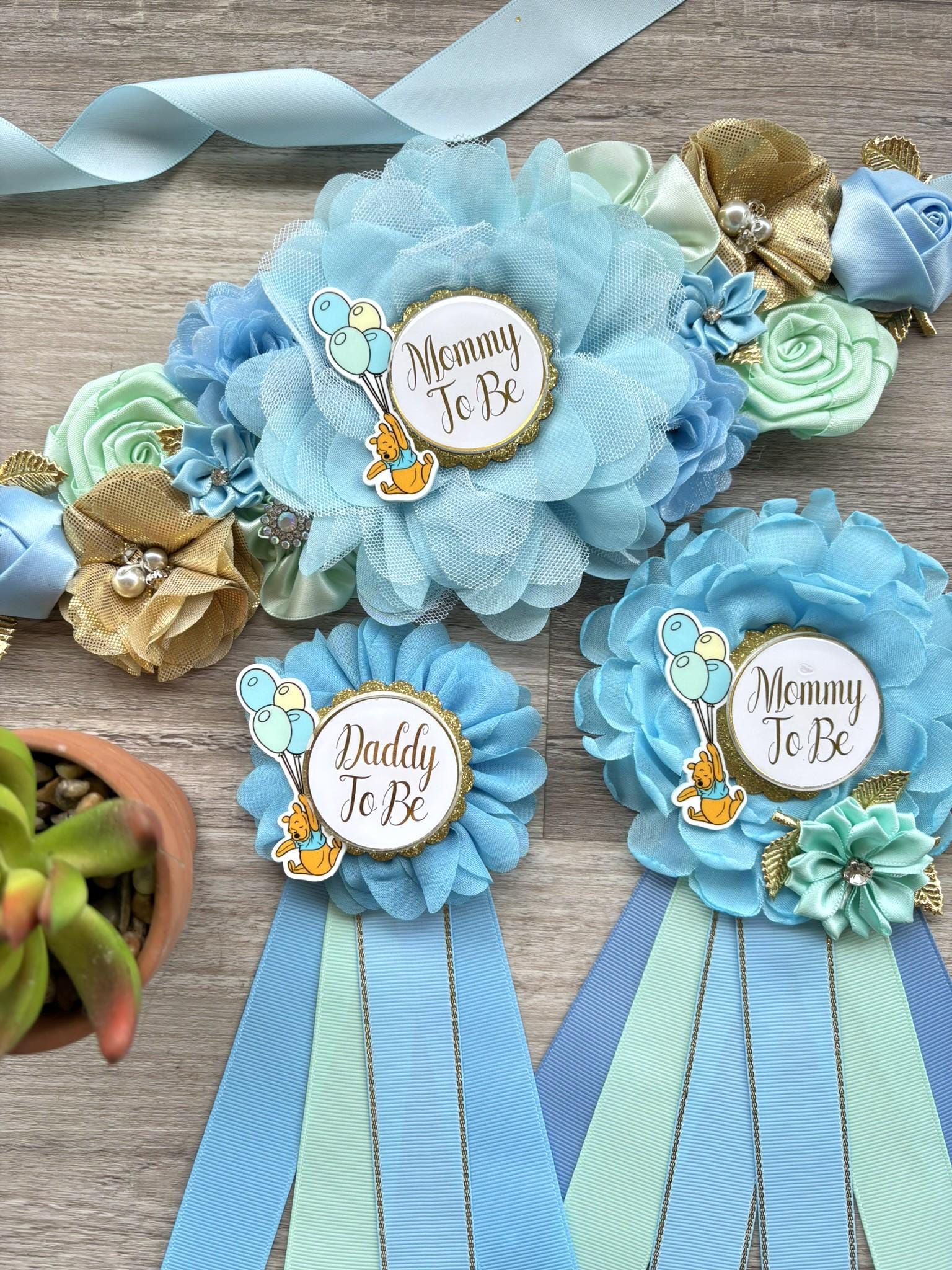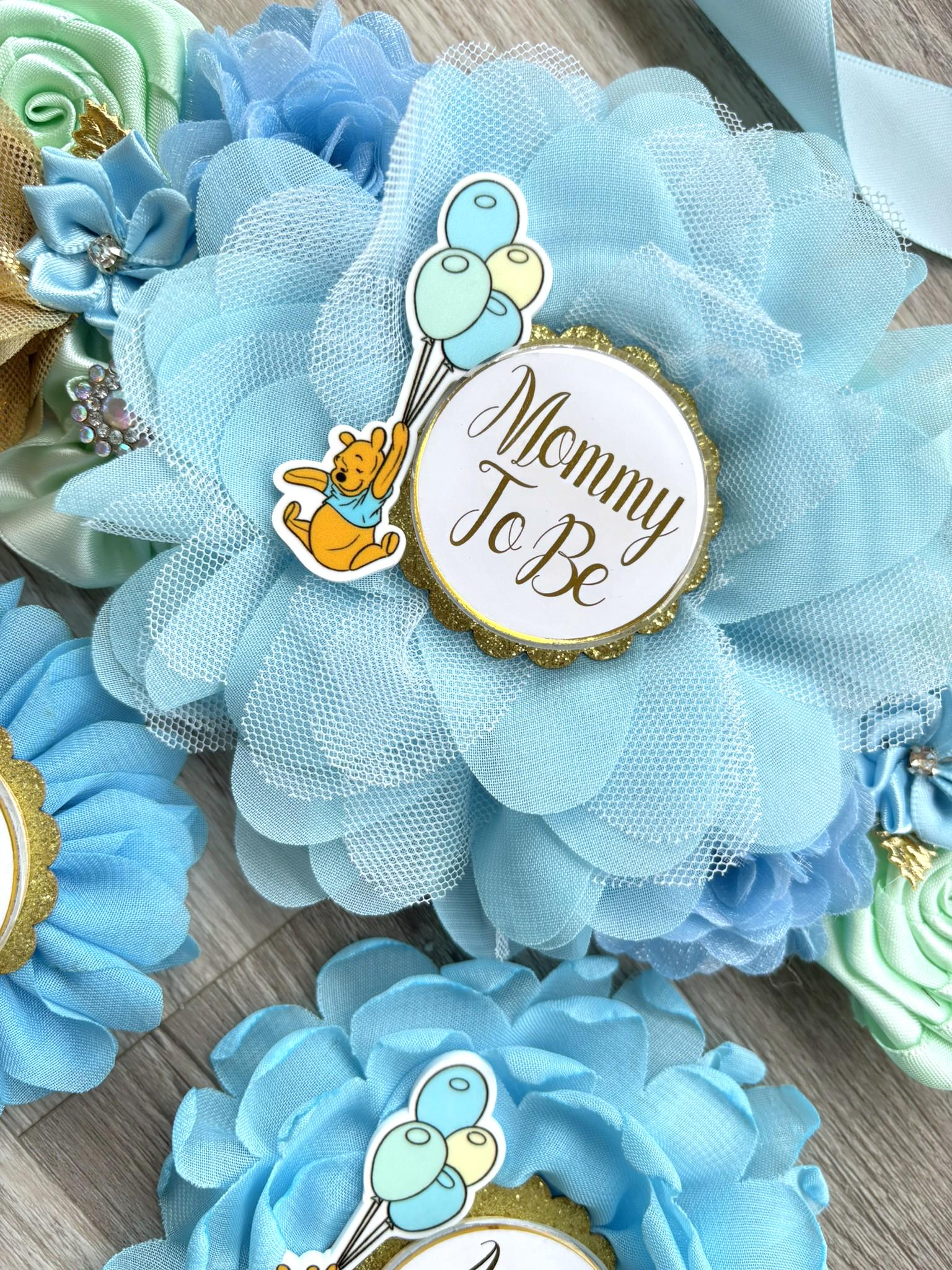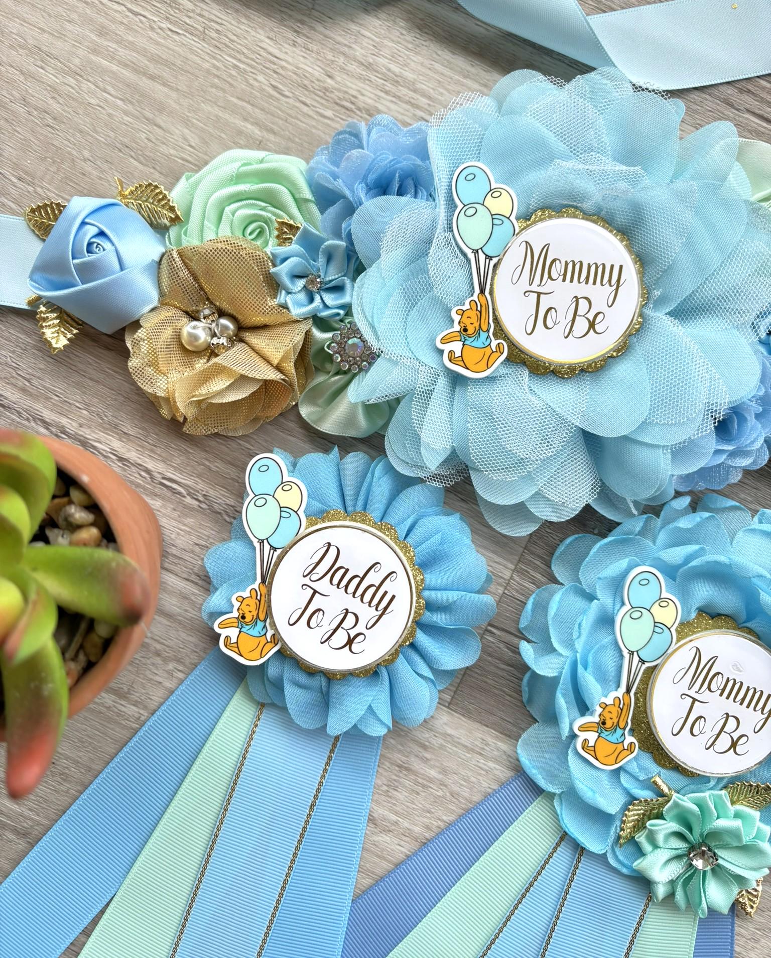 Blue Winnie the Pooh Baby Shower Set, Winnie Maternity Sash, Mommy To Be Pin, Daddy To Be Pin, Baby Shower Gift, Custom Order Welcome
