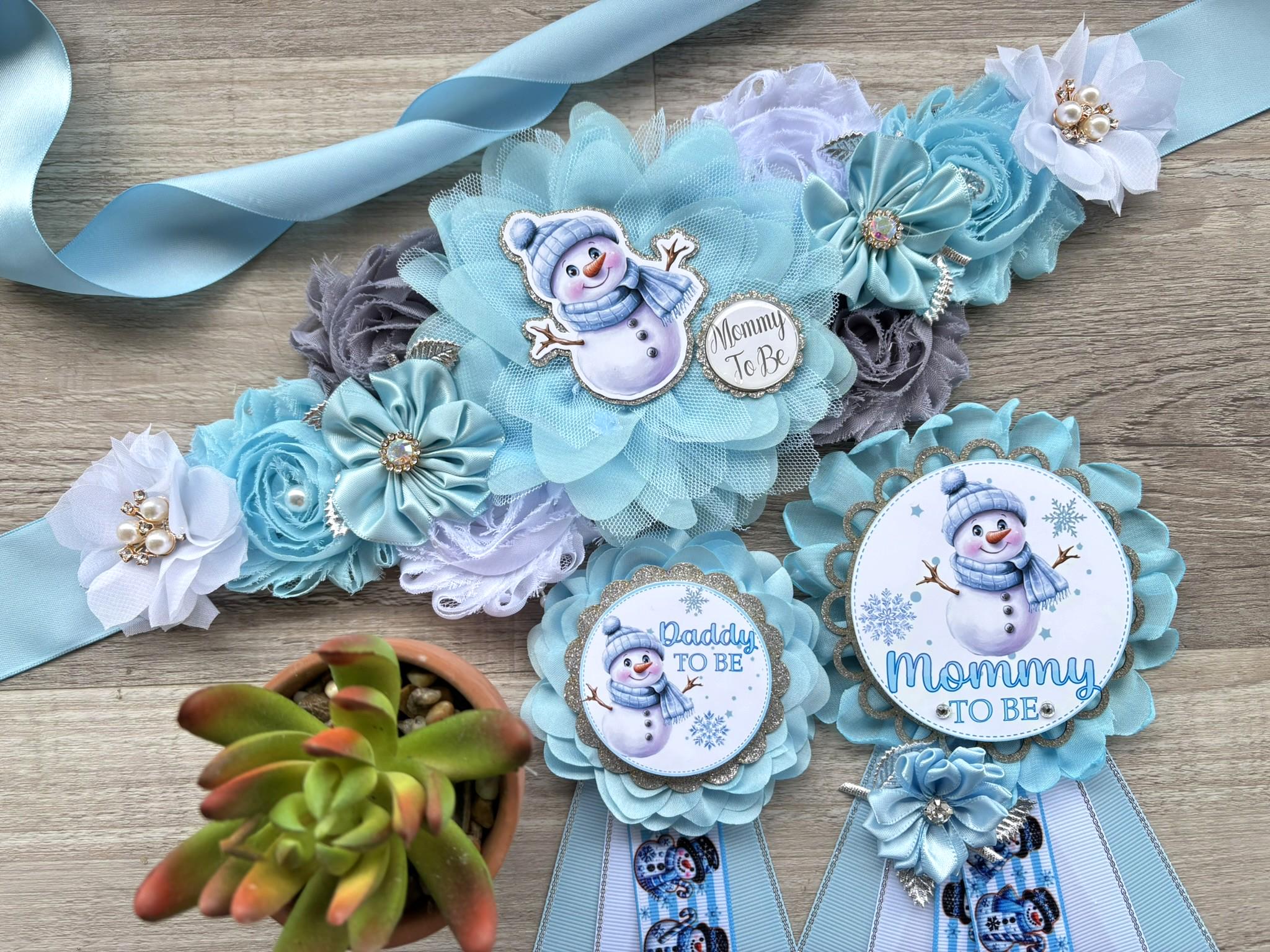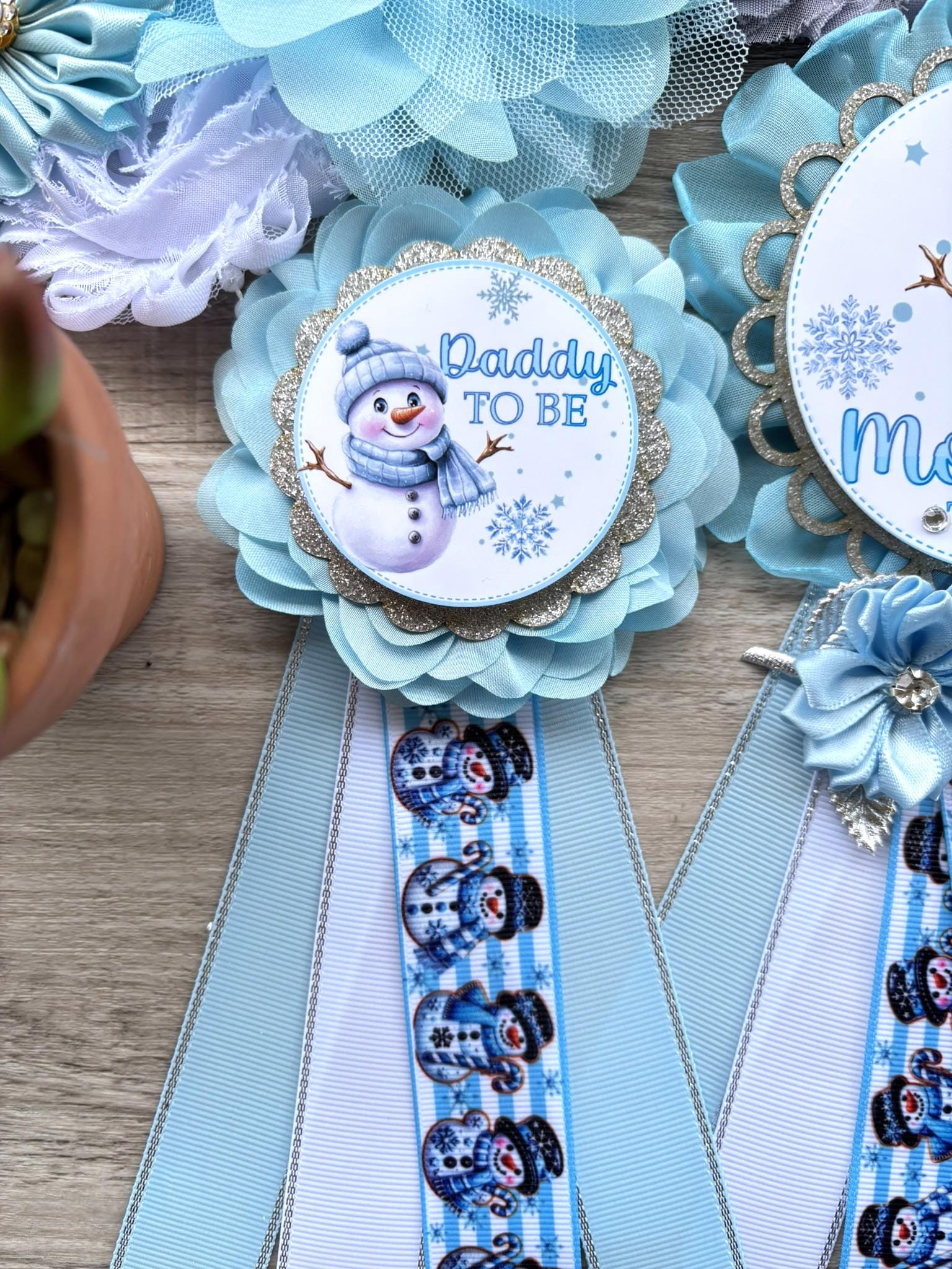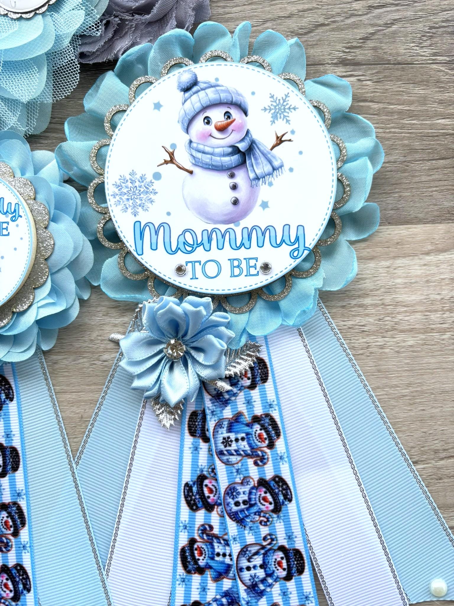 Boy Snowman Baby Shower Pins, Blue Snowman Maternity Sash, Mommy To Be Pin, Snowman Daddy To Be Pin, Baby Shower Gift, Custom Order Welcome
