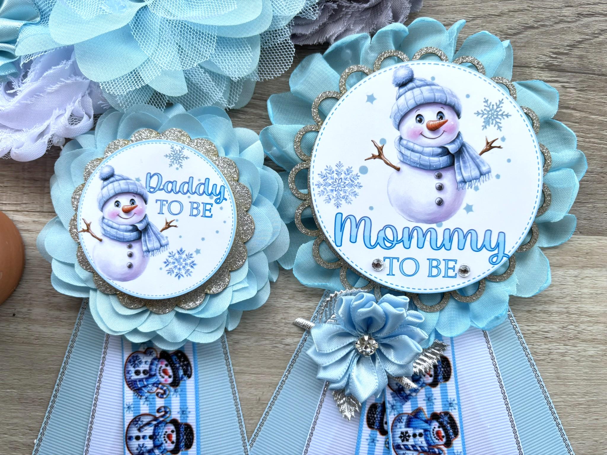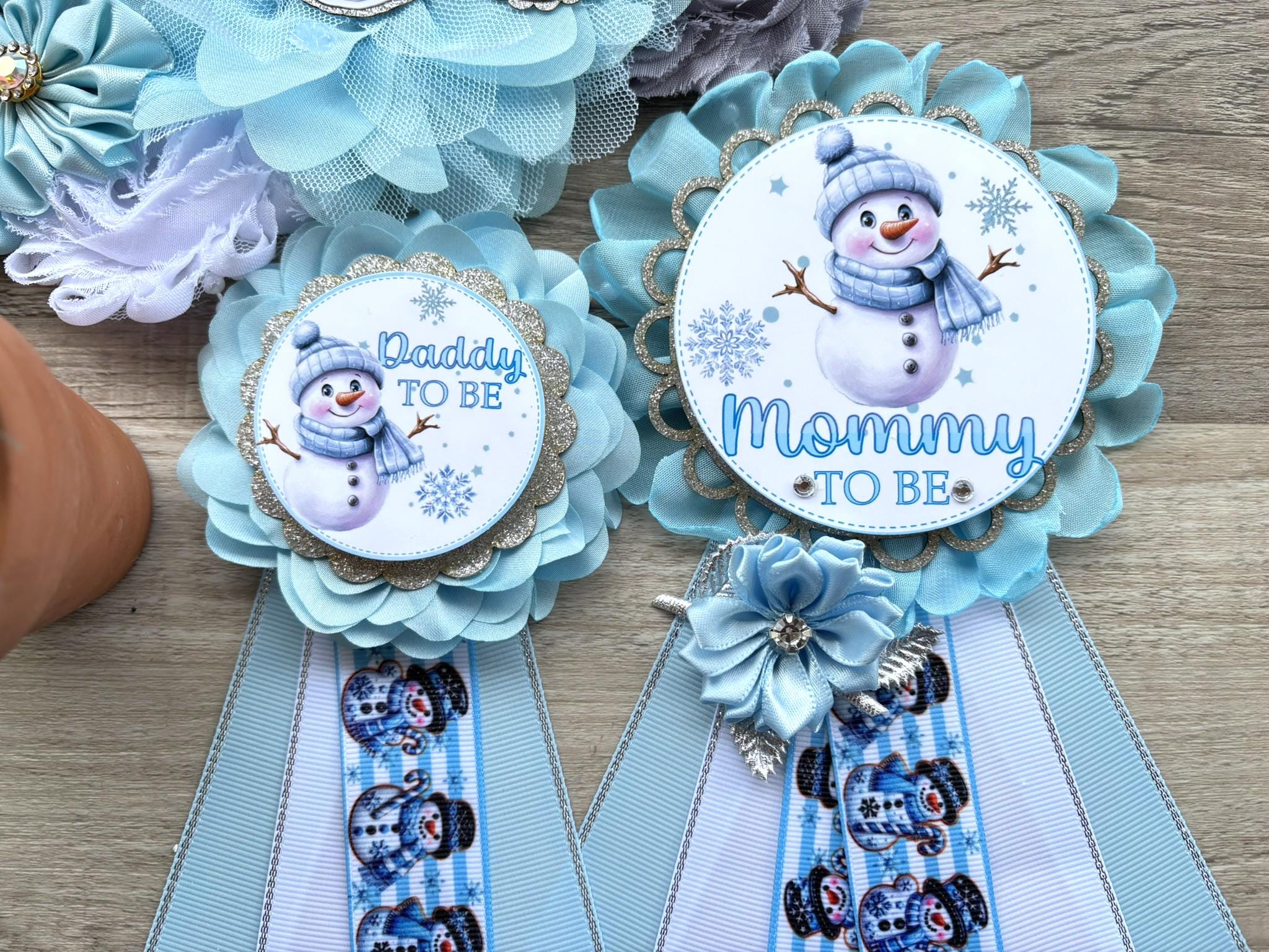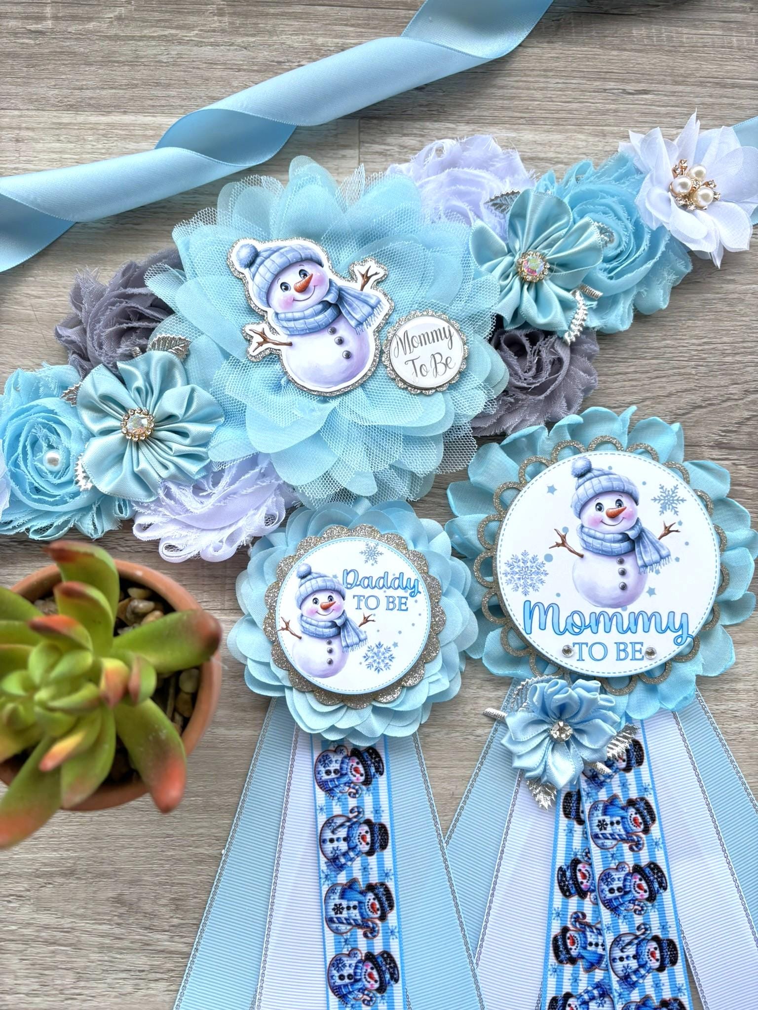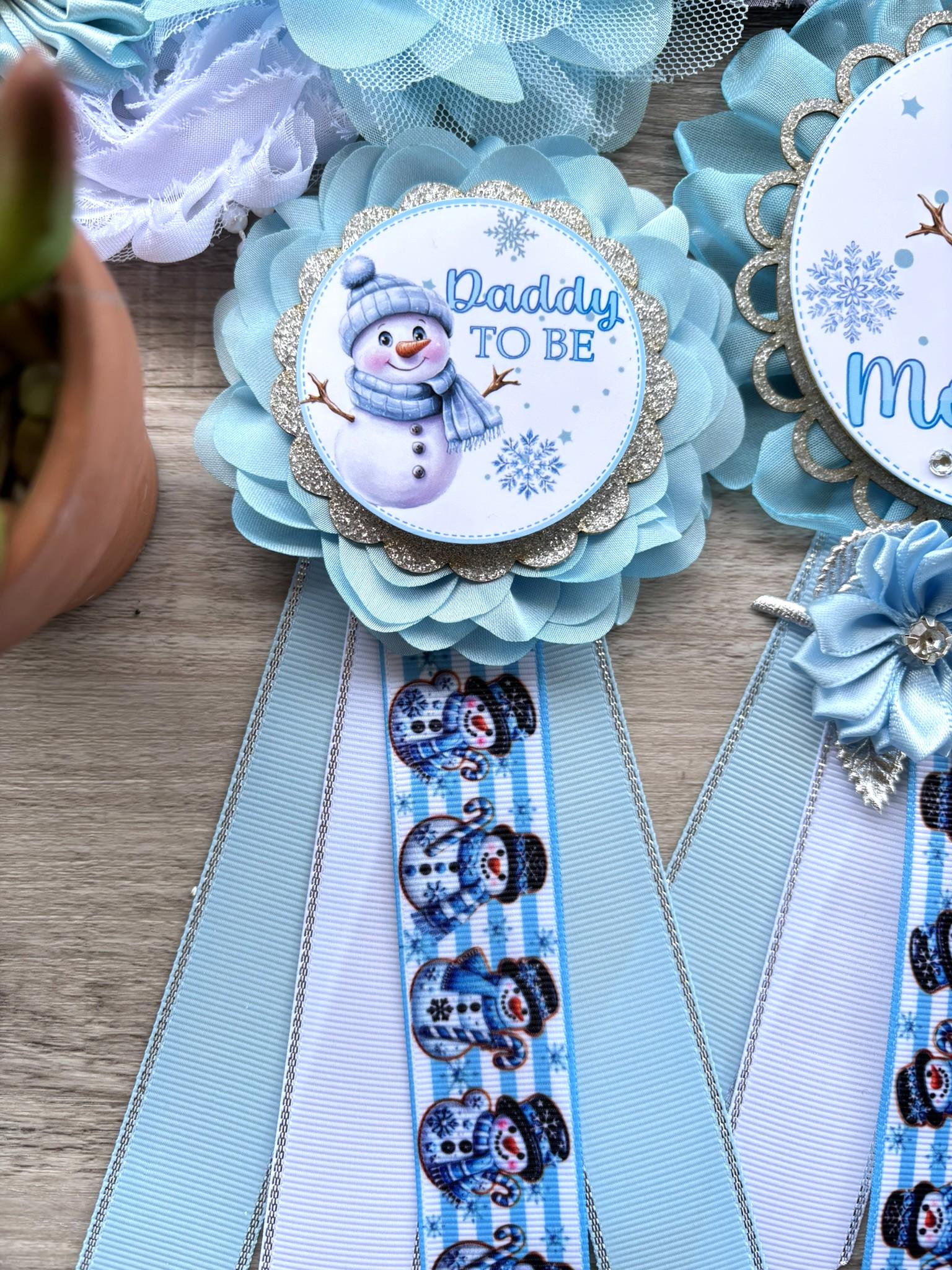 Boy Snowman Baby Shower Pins, Blue Snowman Maternity Sash, Mommy To Be Pin, Snowman Daddy To Be Pin, Baby Shower Gift, Custom Order Welcome