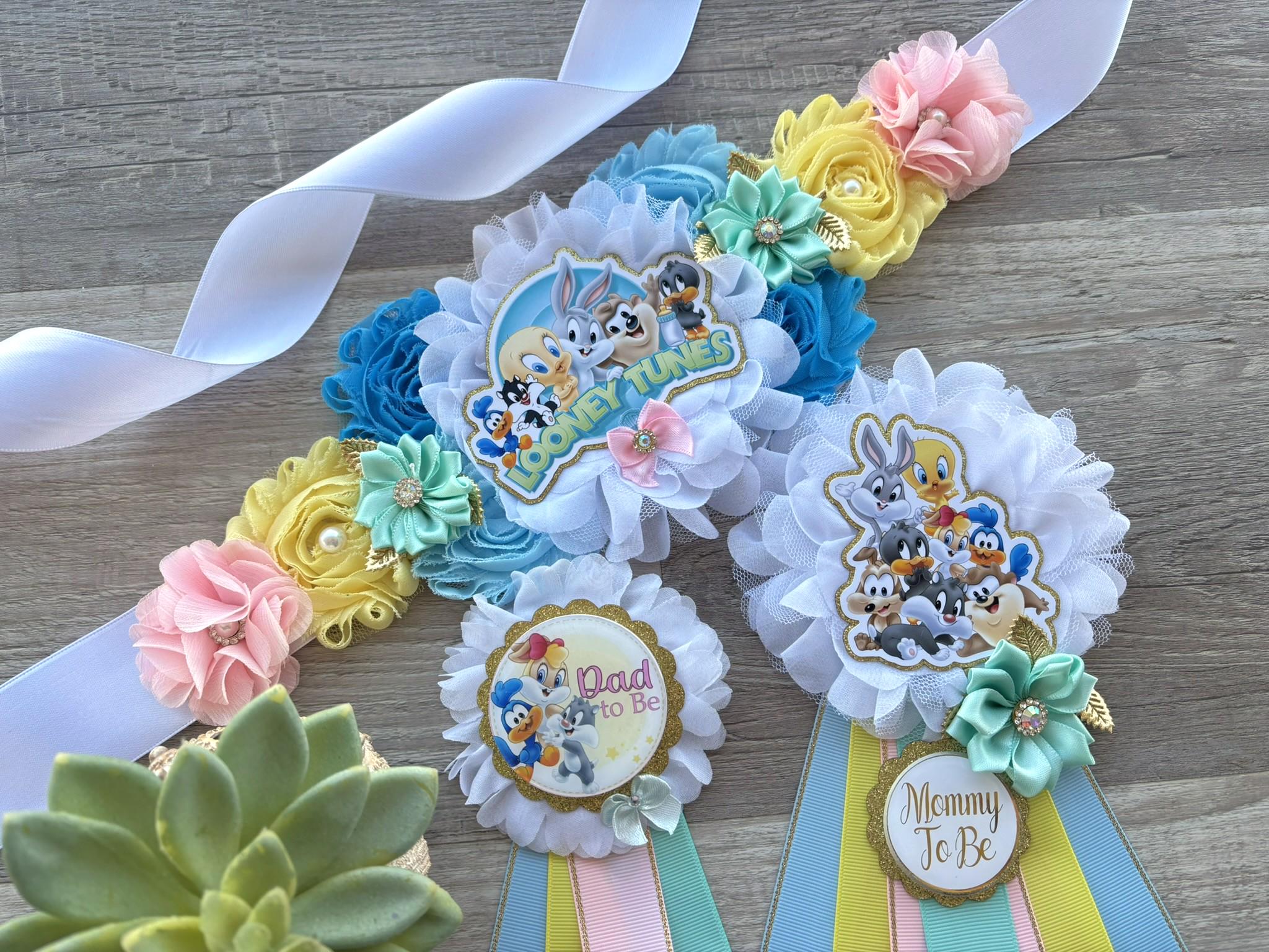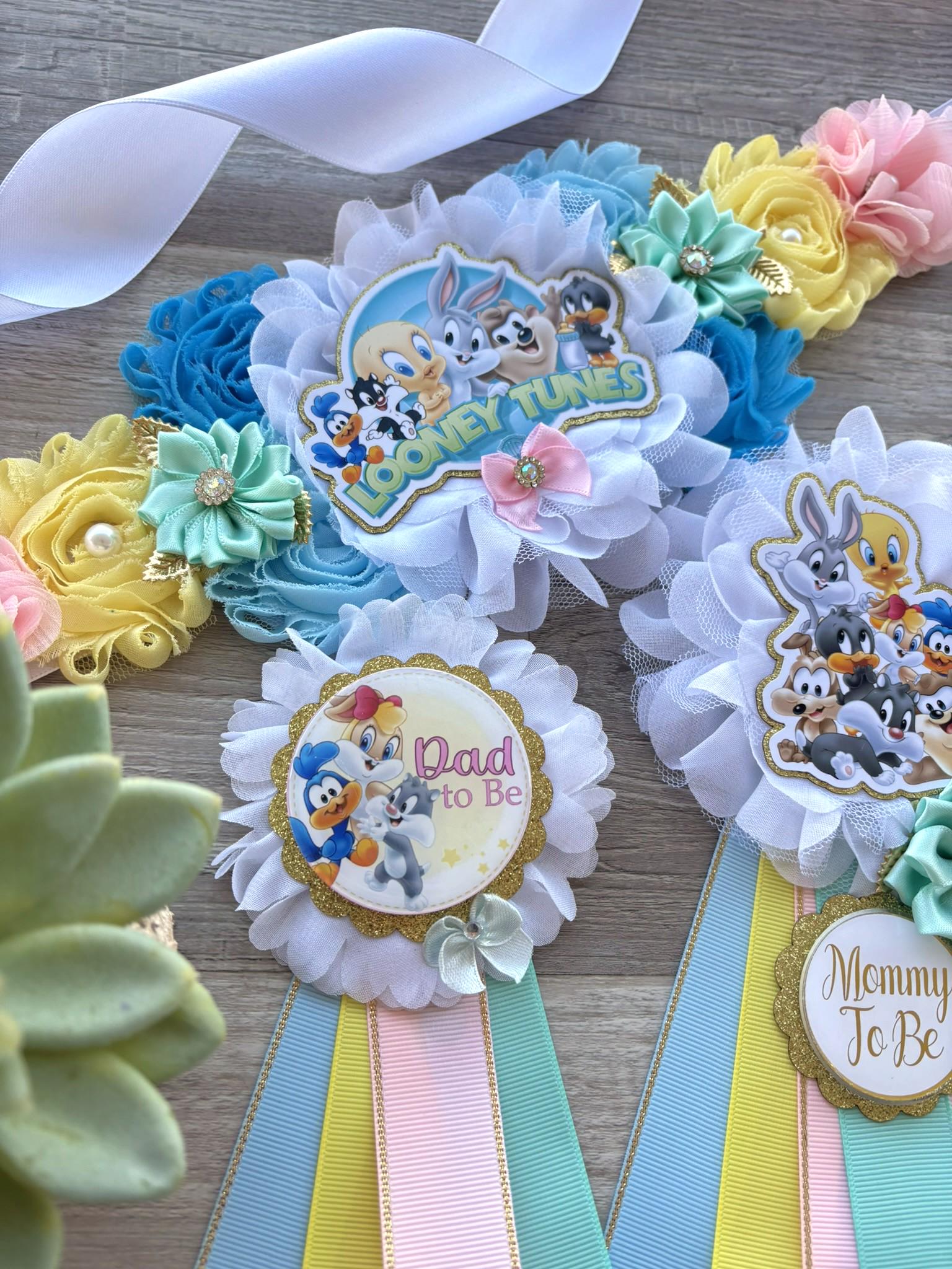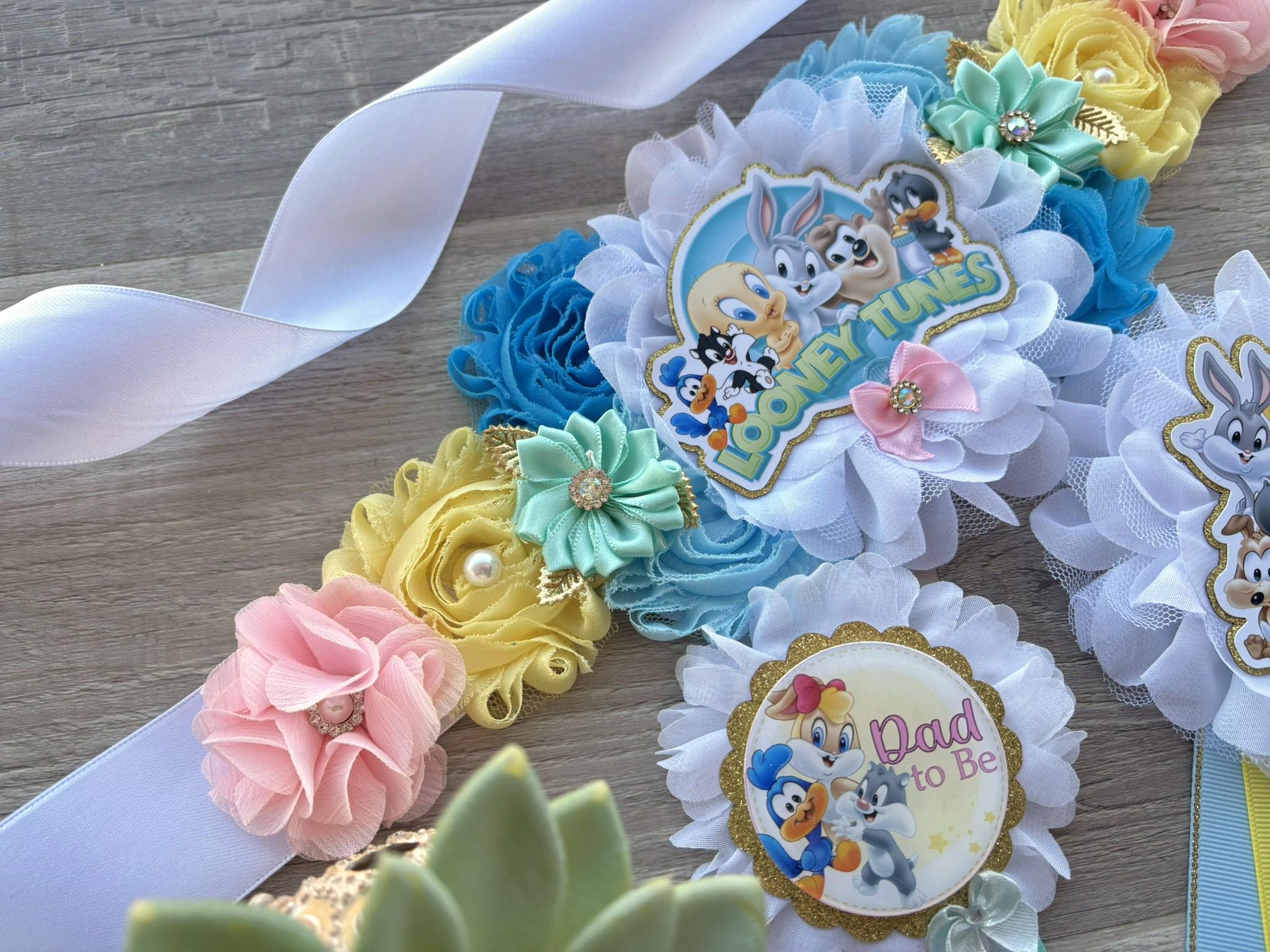 Gender Reveal Looney Baby Shower Set, Blue Aqua Yellow Maternity Sash, Mommy To Be Pin, Daddy To Be Pin, Custom Order Welcome