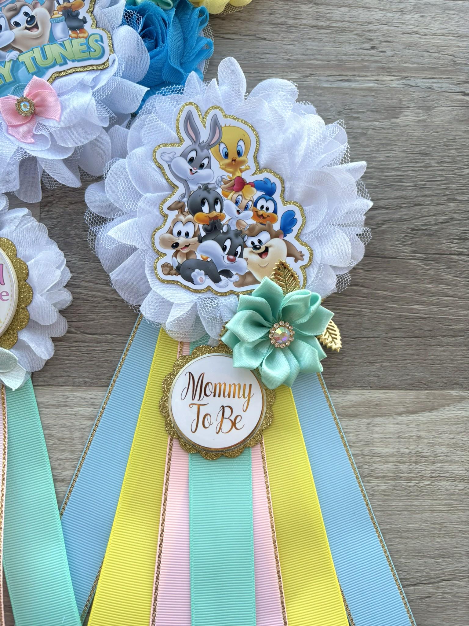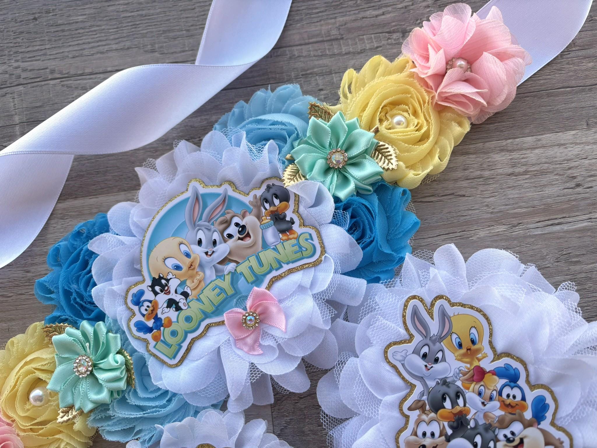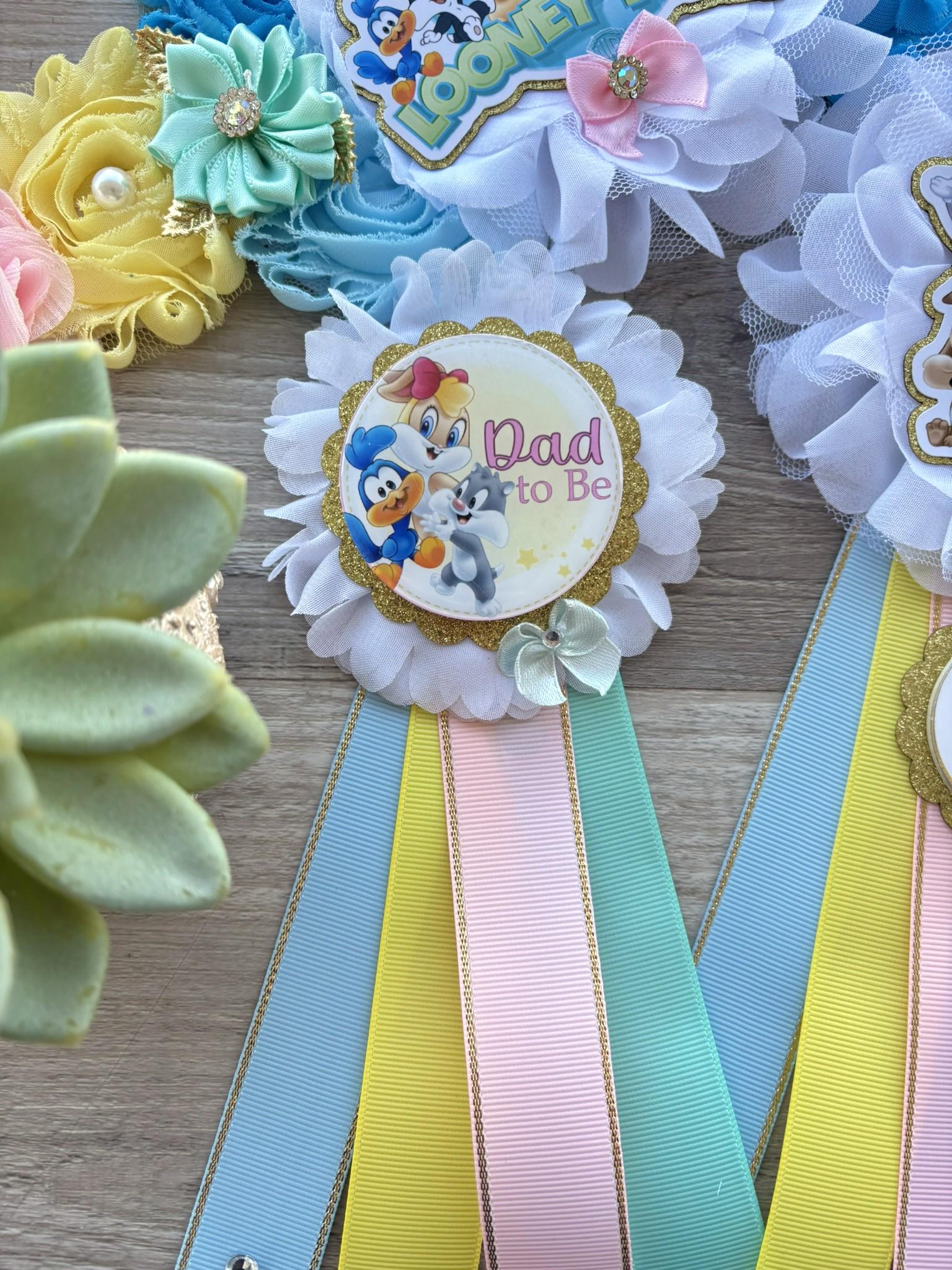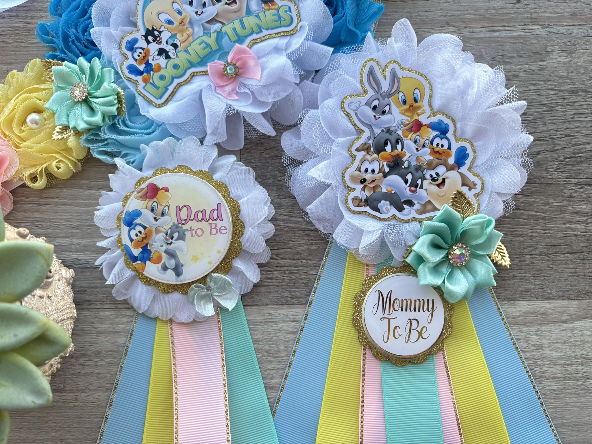 Gender Reveal Looney Baby Shower Set, Blue Aqua Yellow Maternity Sash, Mommy To Be Pin, Daddy To Be Pin, Custom Order Welcome