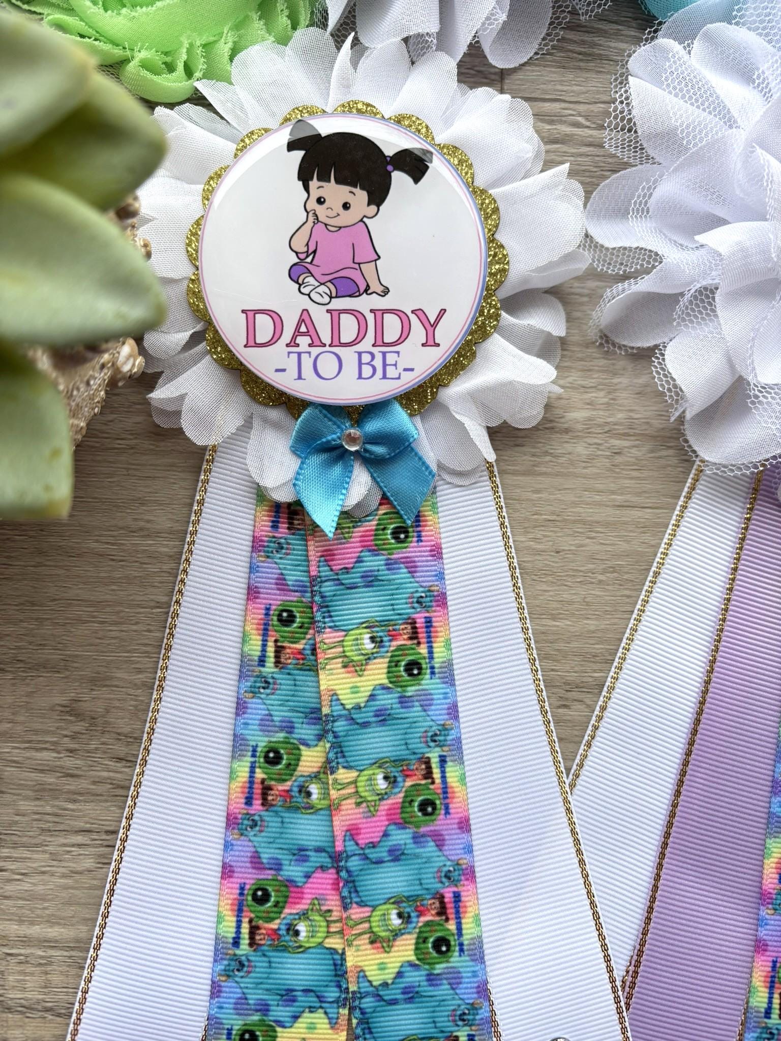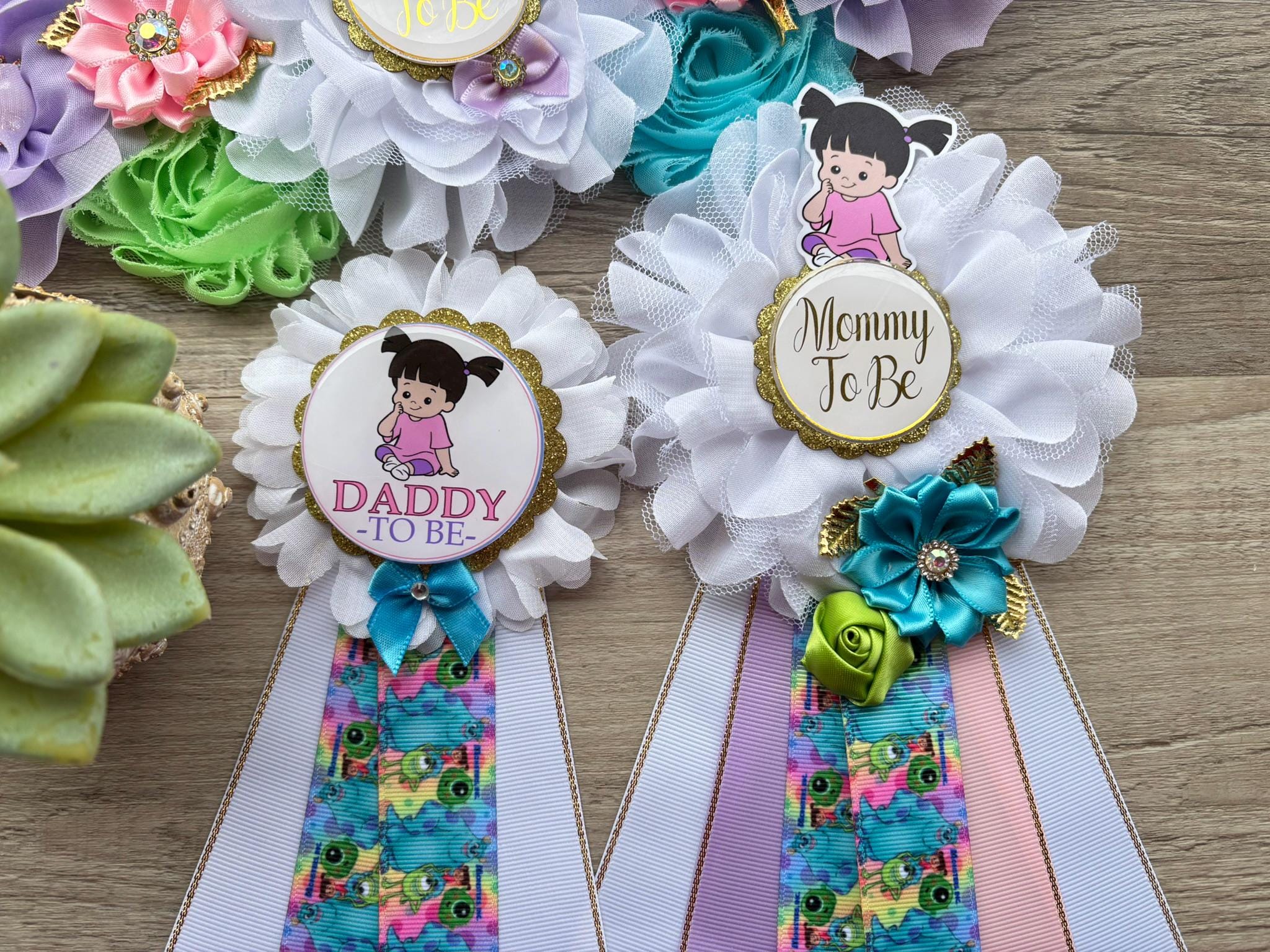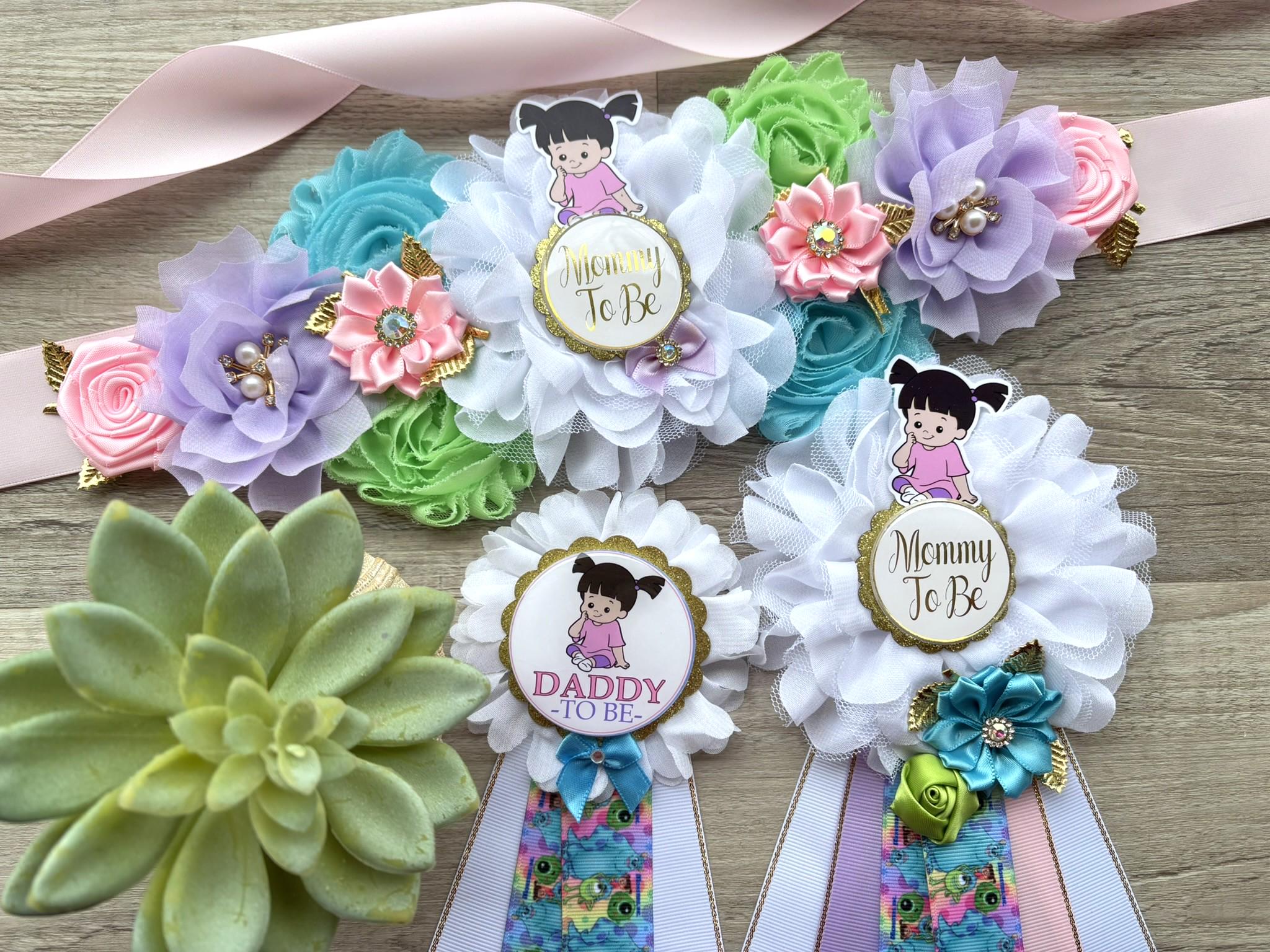 Little Boo Monster Baby Shower, Purple Green Blue Pink Maternity Sash, Mommy To Be Pin Ribbon, Daddy To Be Pin, Baby Shower Gift, Custom