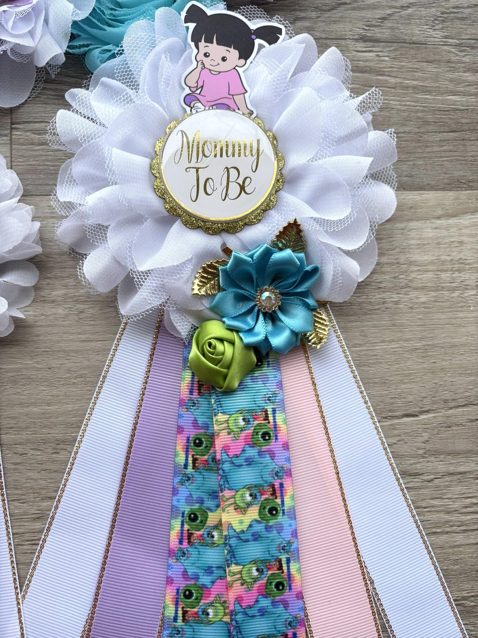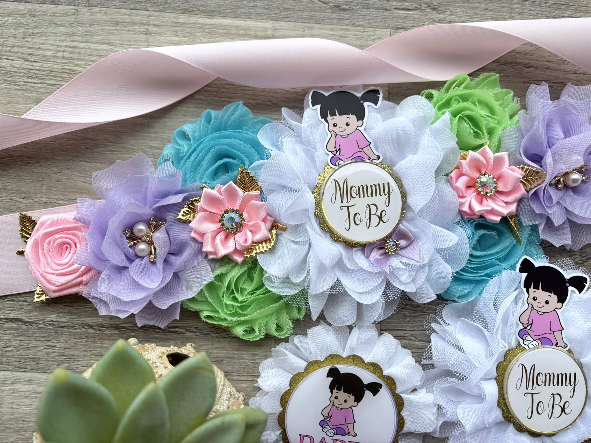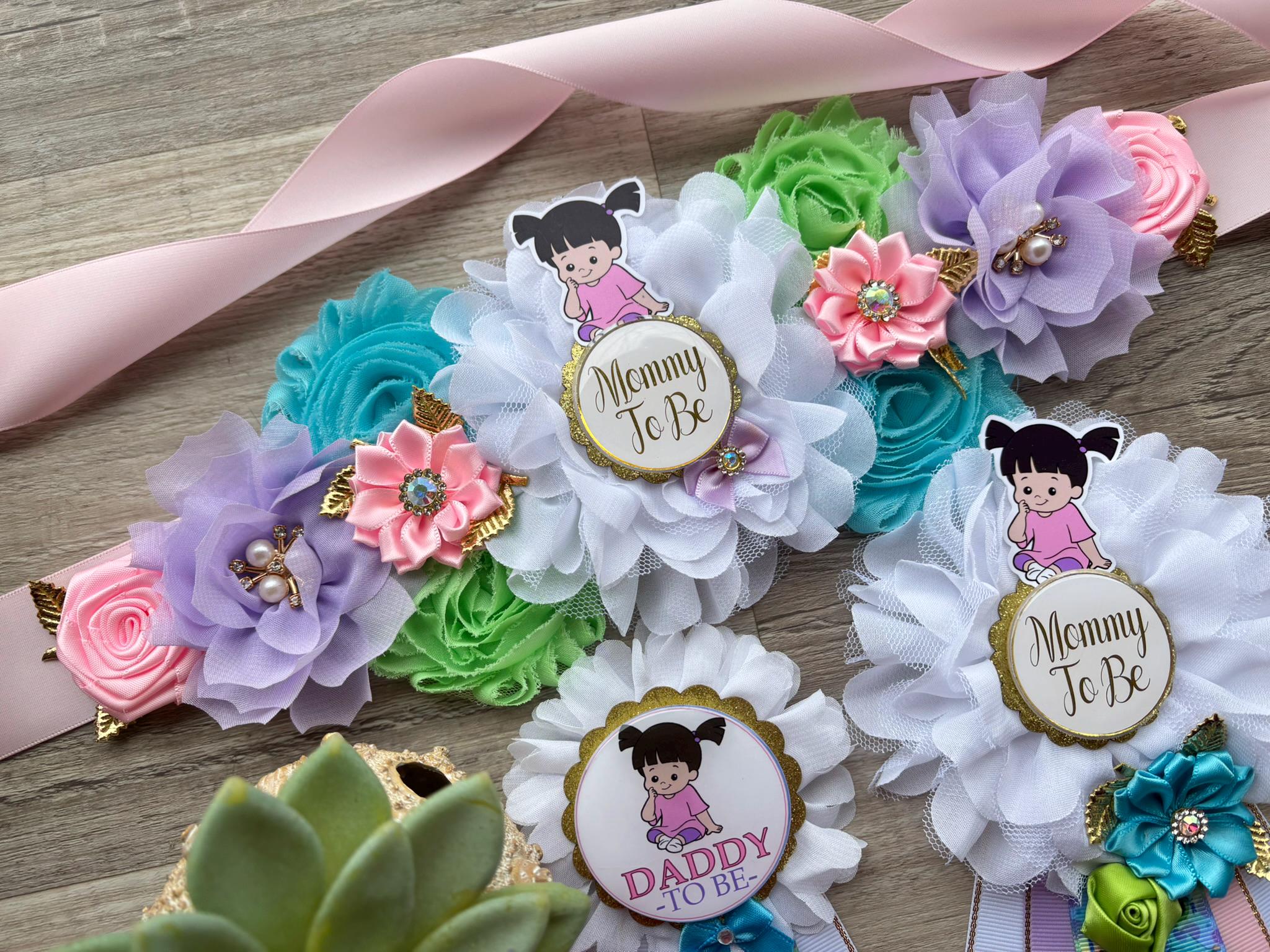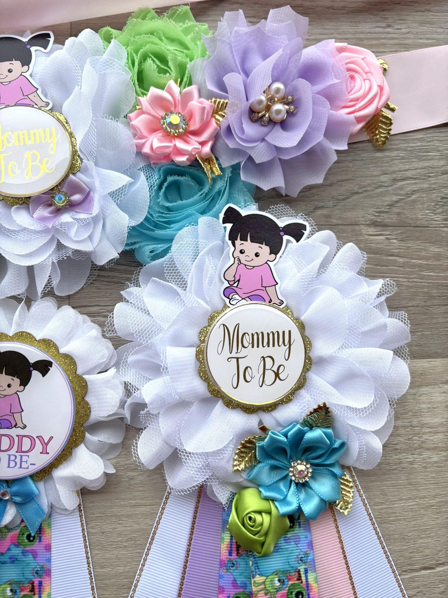 Little Boo Monster Baby Shower, Purple Green Blue Pink Maternity Sash, Mommy To Be Pin Ribbon, Daddy To Be Pin, Baby Shower Gift, Custom