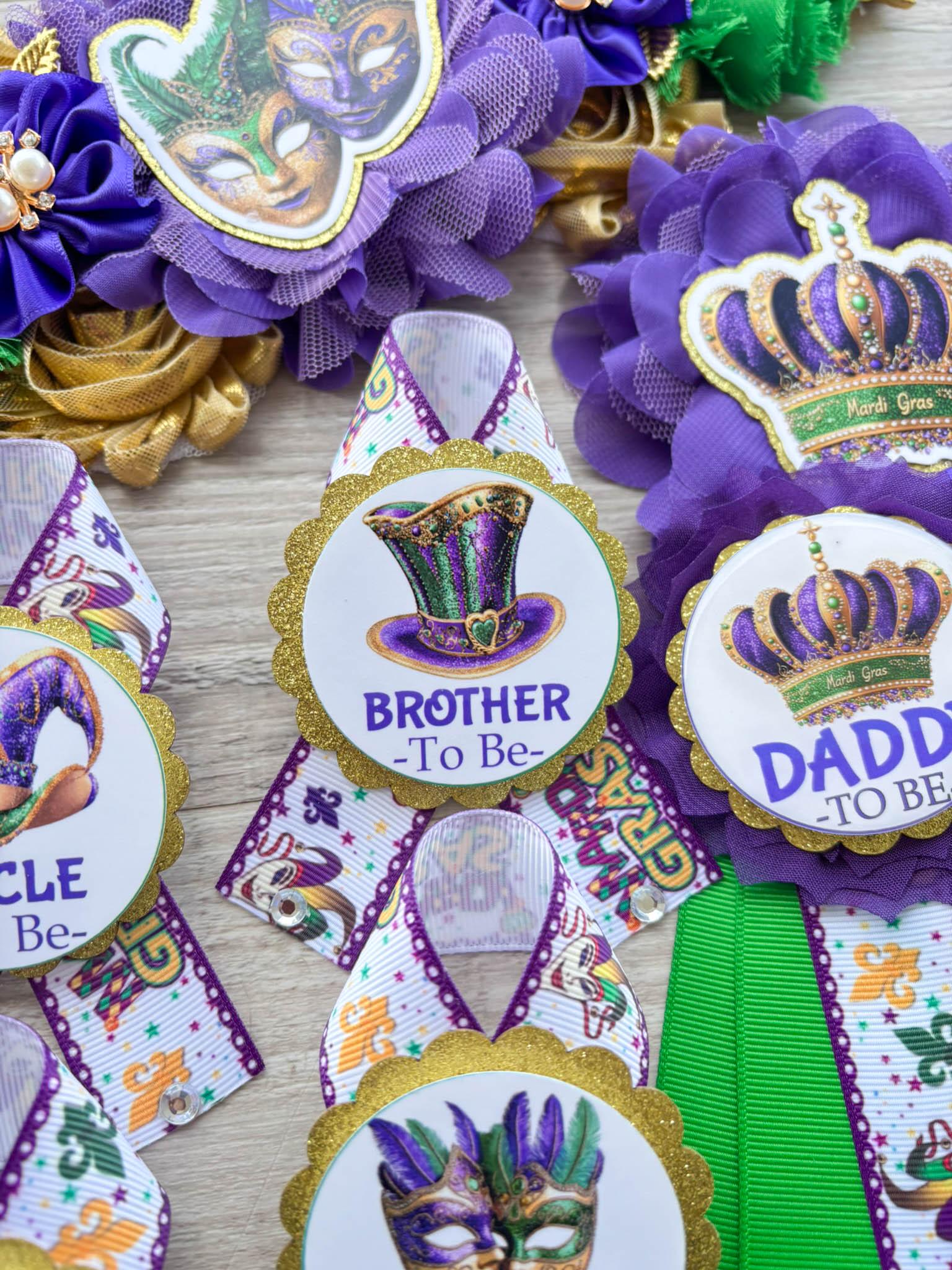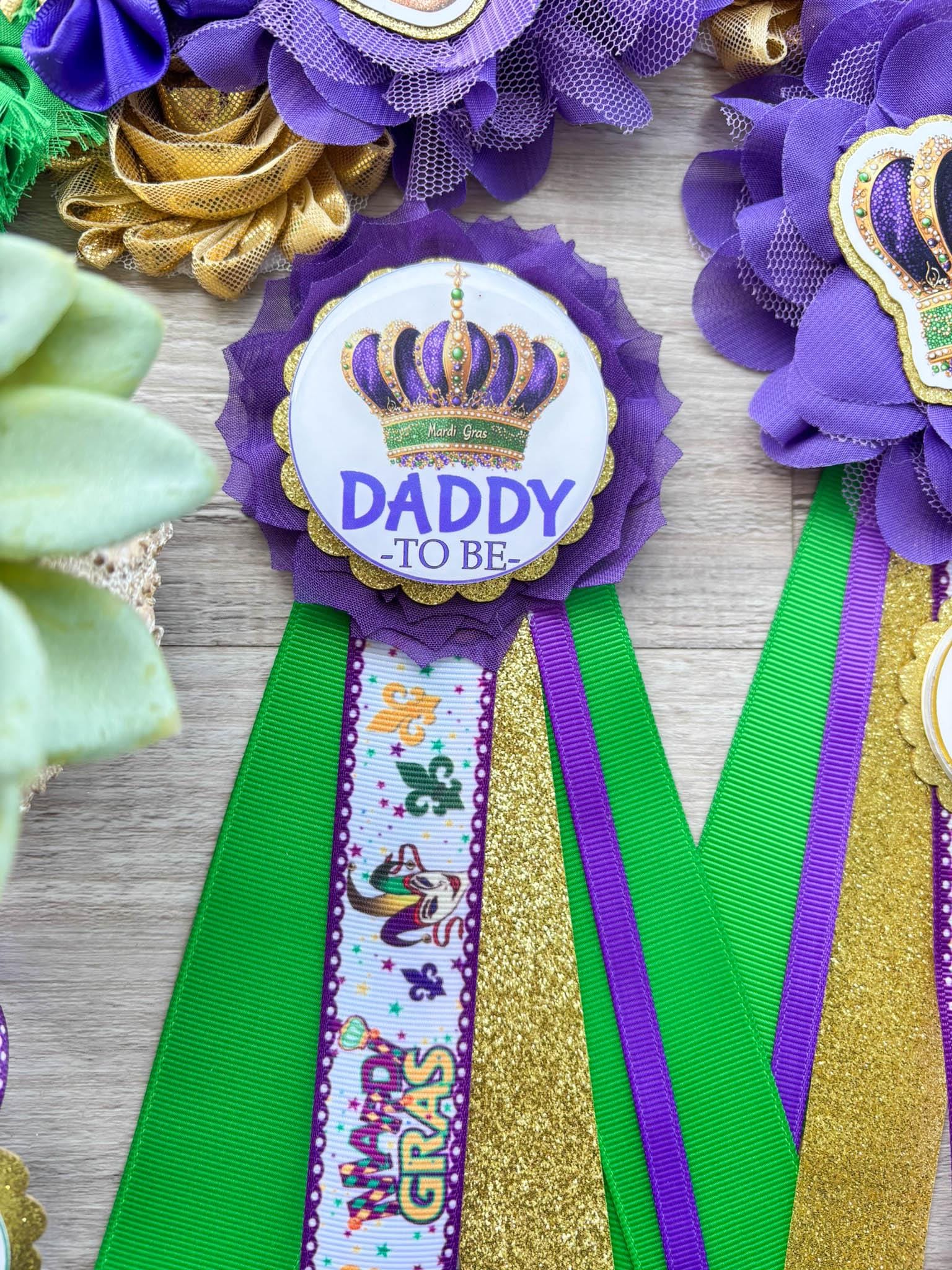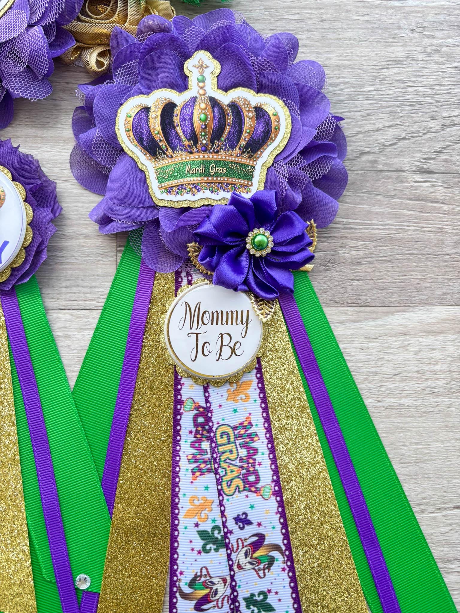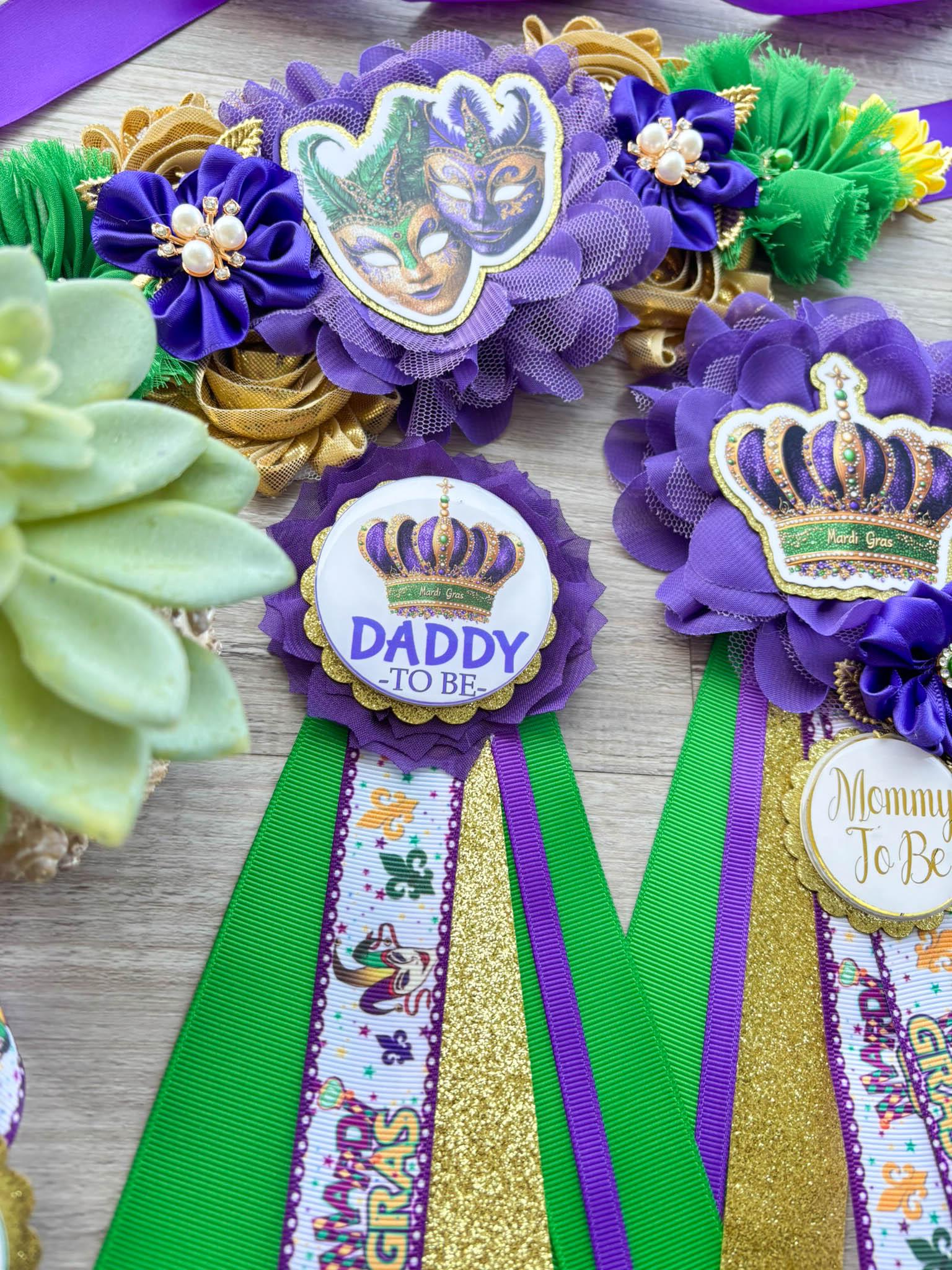Mardi Gras Baby Shower, Maternity Sash, Mardi Gras Mommy To Be Ribbon, Carnival Daddy To Be Pin, Green Yellow Purple, Custom