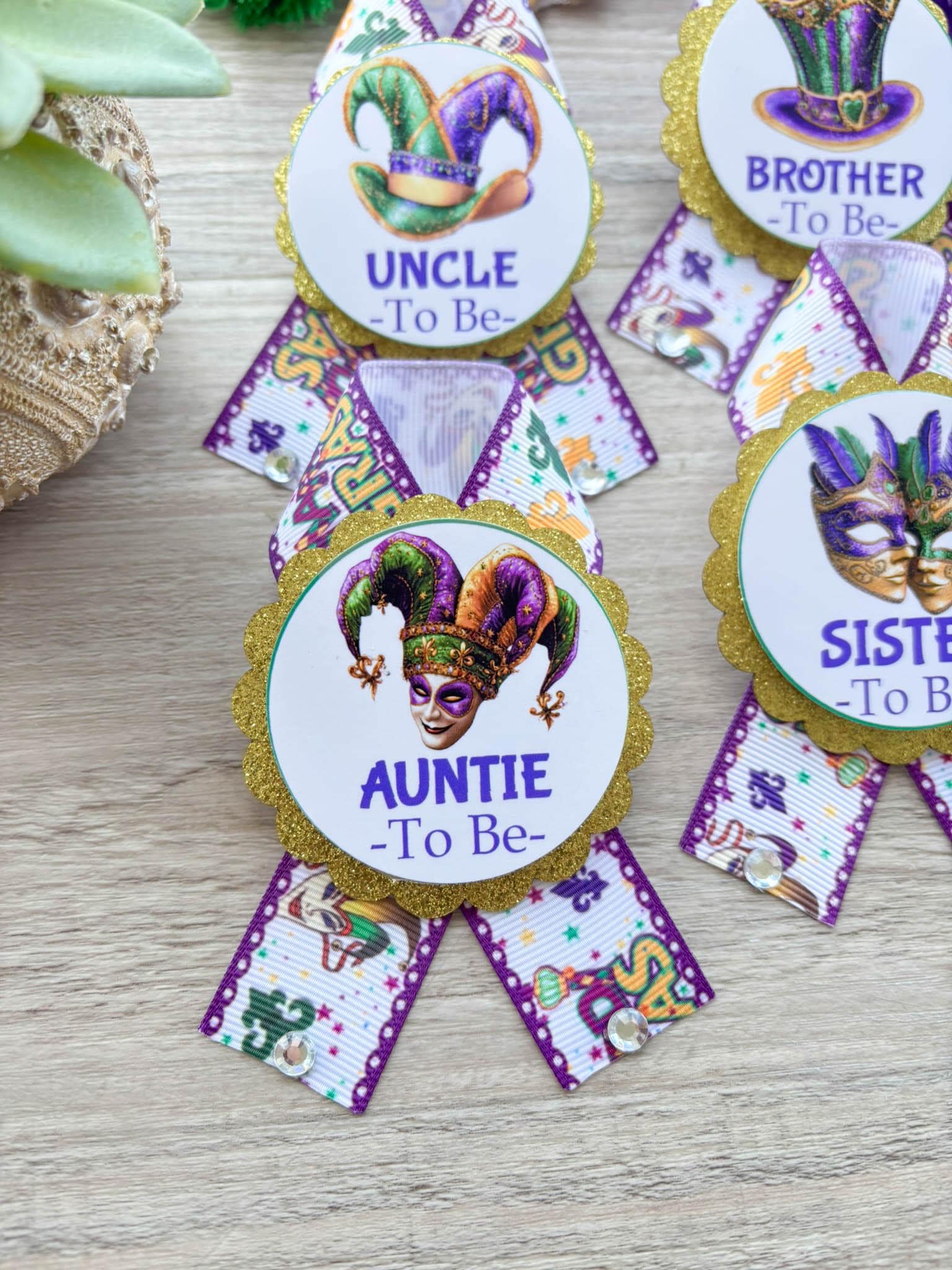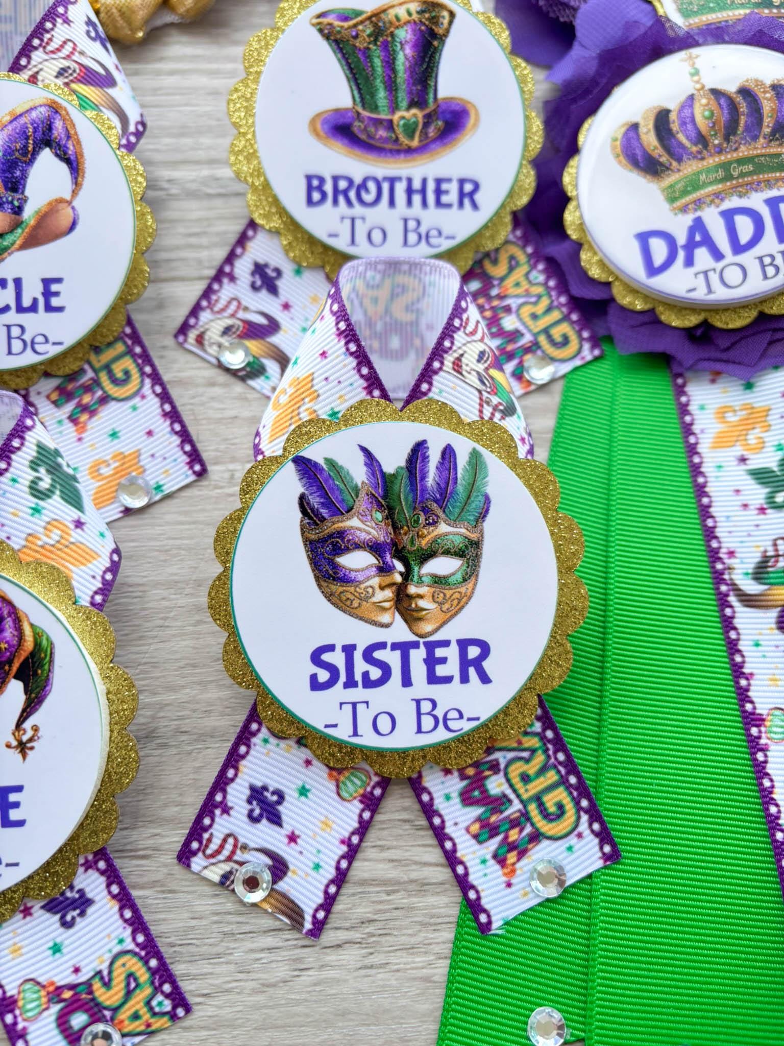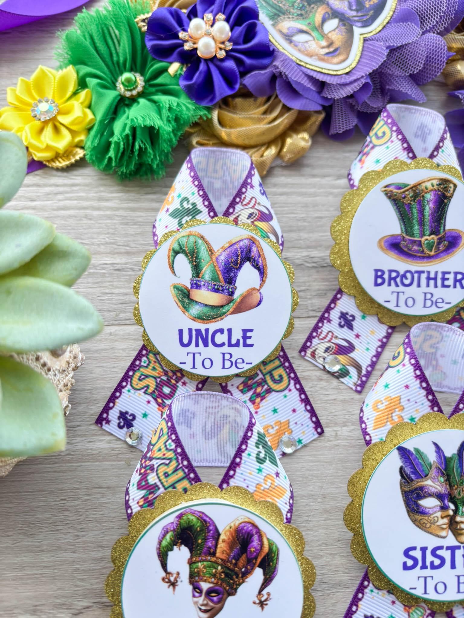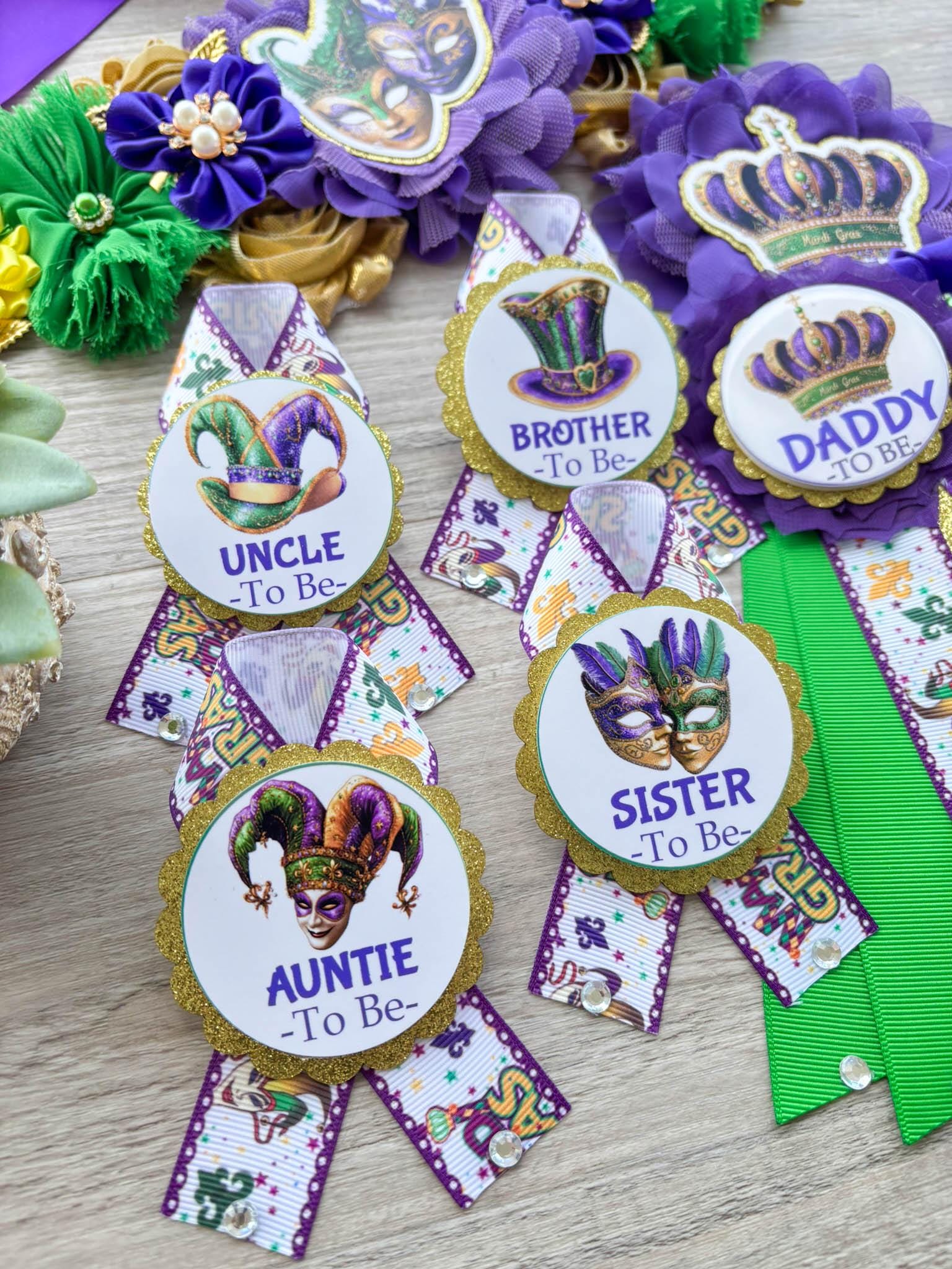 Mardi Gras Baby Shower, Maternity Sash, Mardi Gras Mommy To Be Ribbon, Carnival Daddy To Be Pin, Green Yellow Purple, Custom