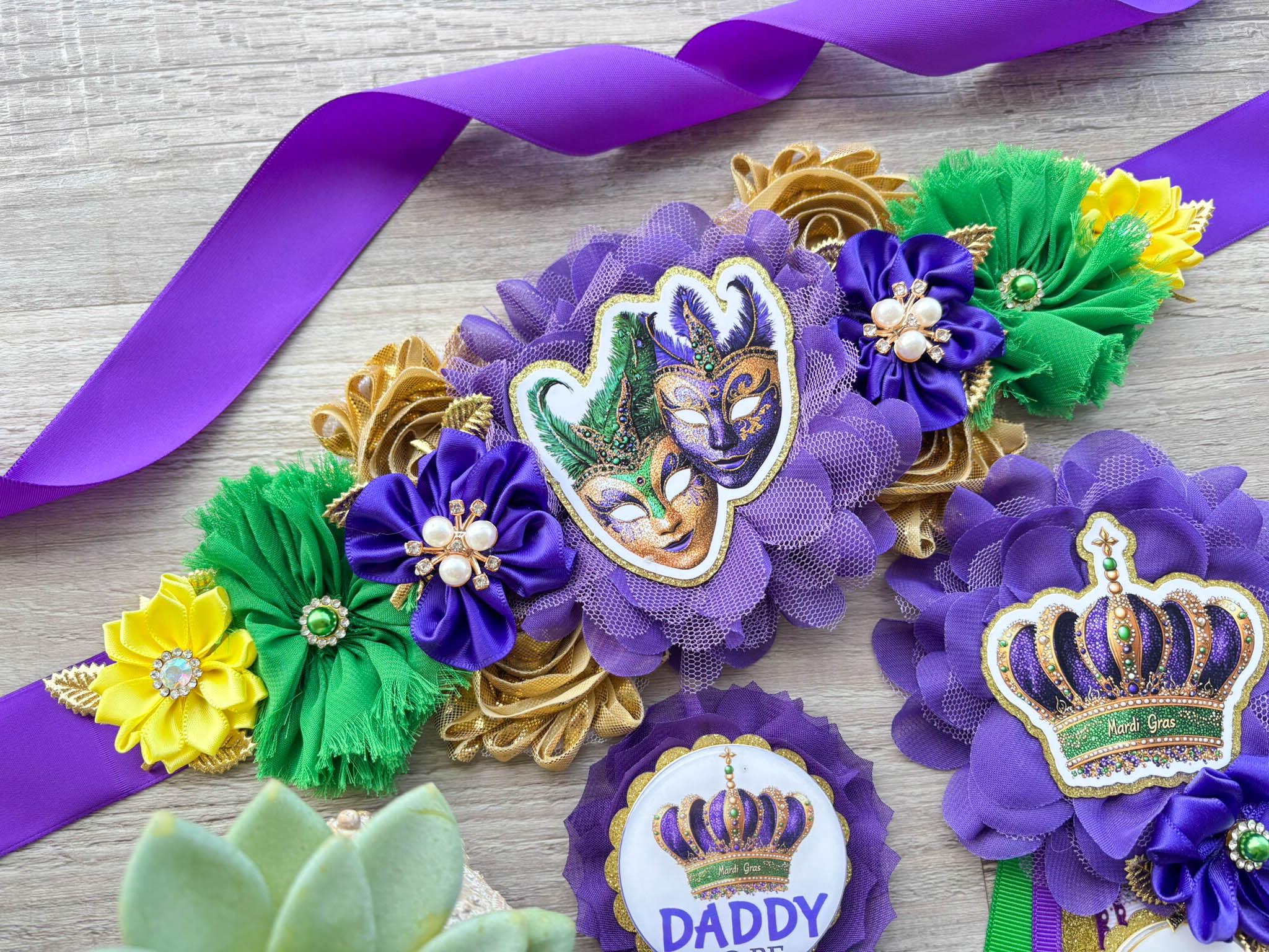 This Mardi Gras Sash & Pins Set was made especially for a Baby Shower or a Photo Prop.