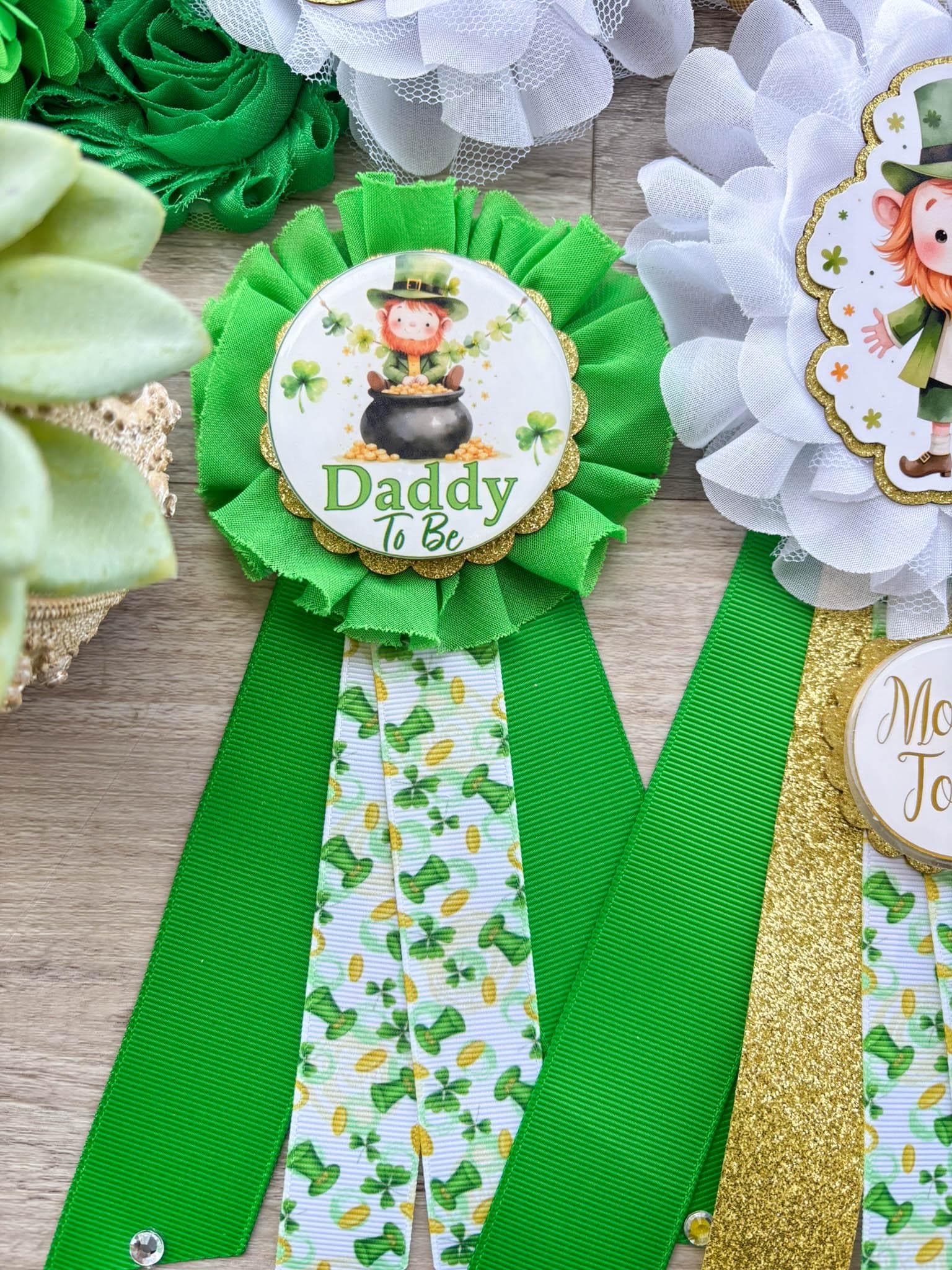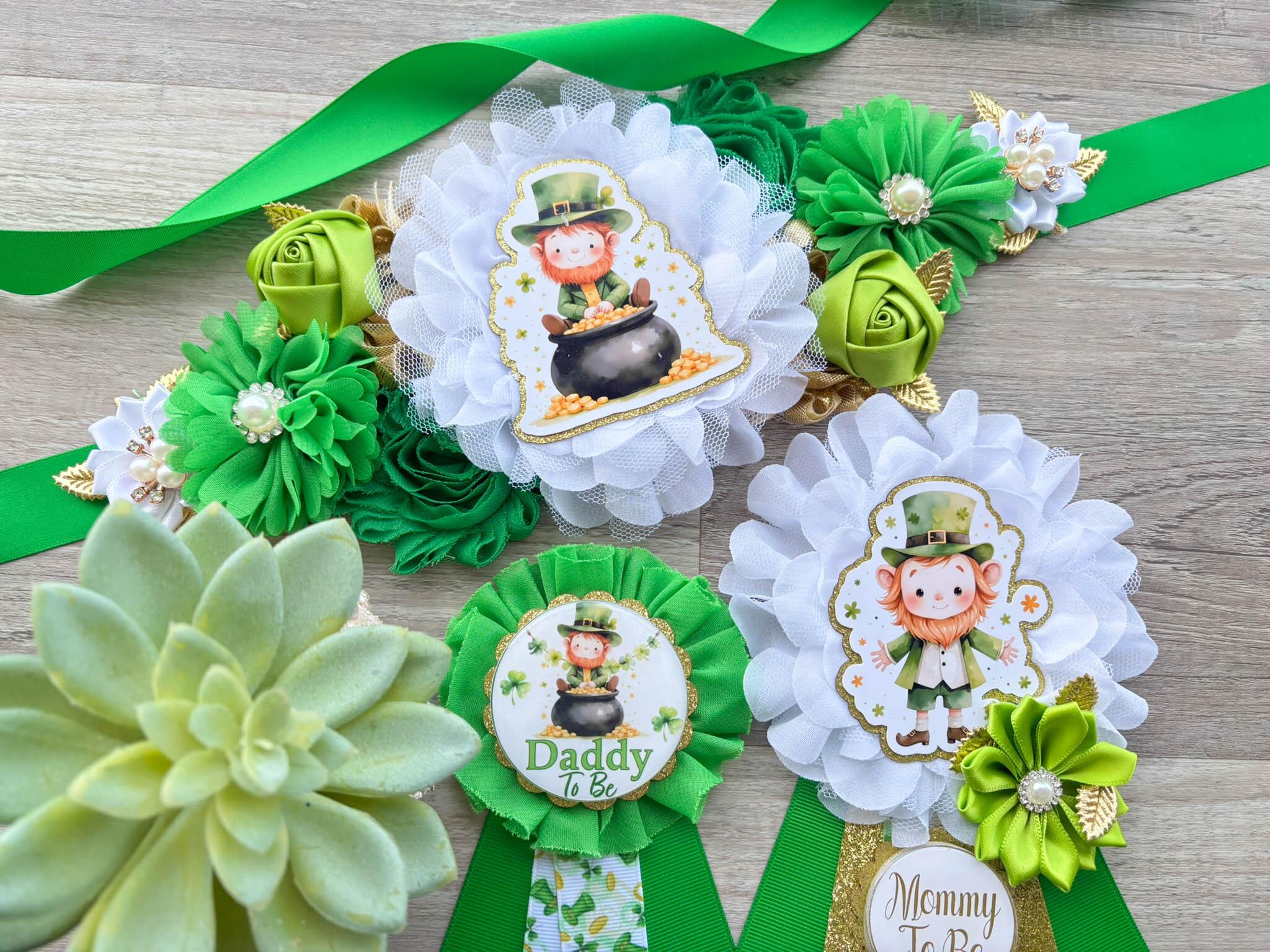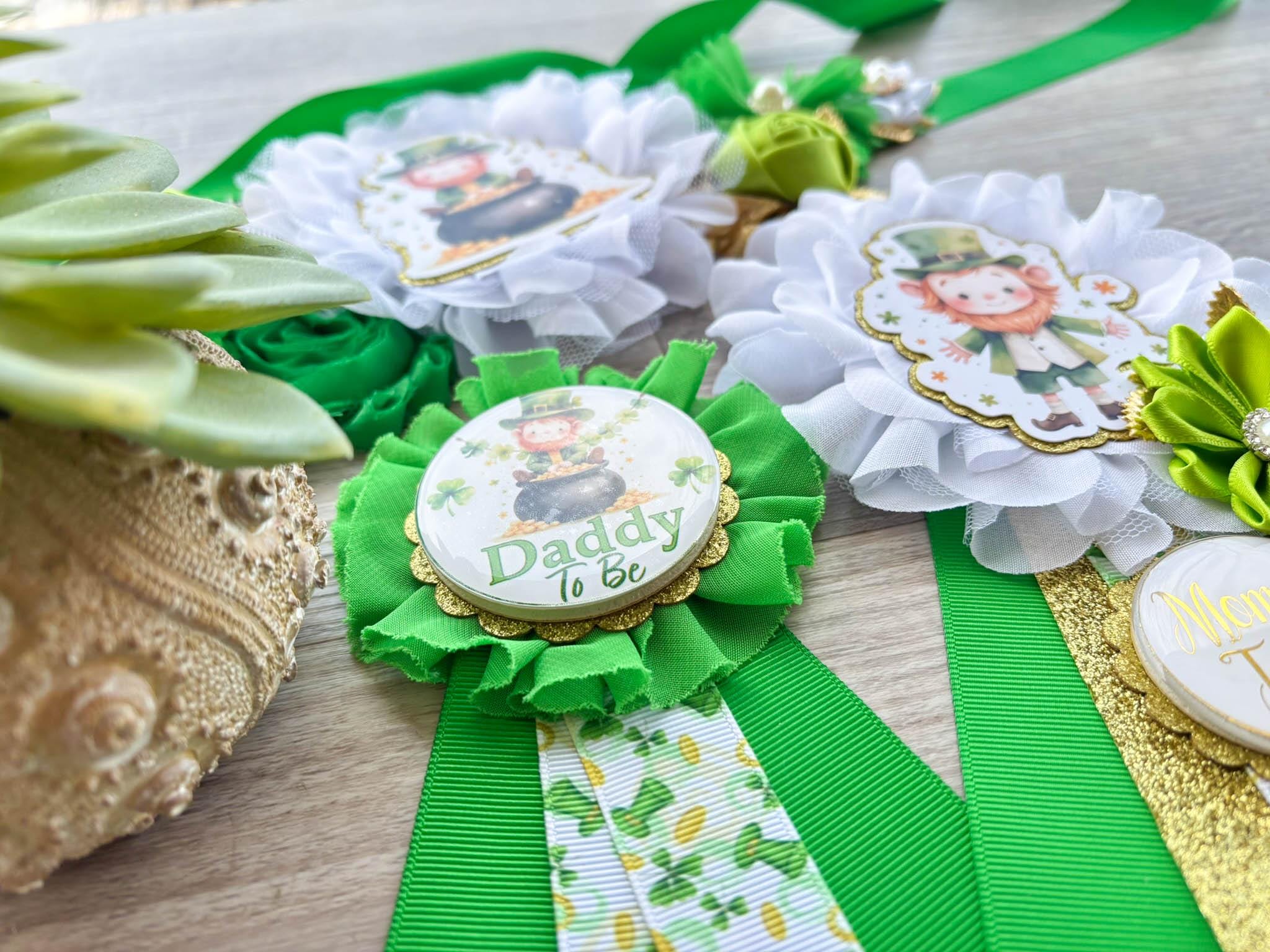 Saint Patrick Baby Shower, Maternity Sash, Clover Mommy To Be Pin, Green Daddy To Be Pin, St. Patrick's Day Baby Shower, New Parents Pin