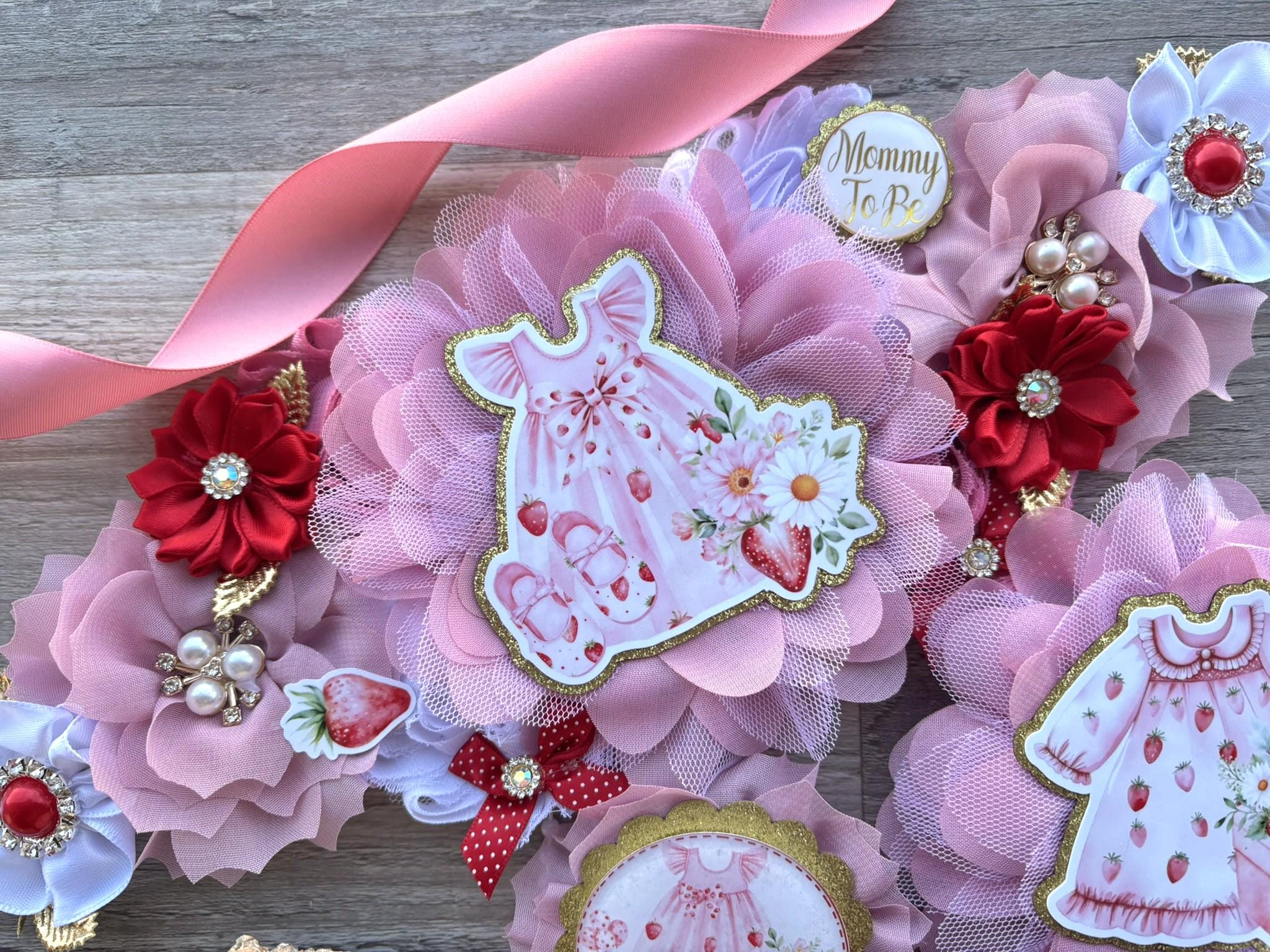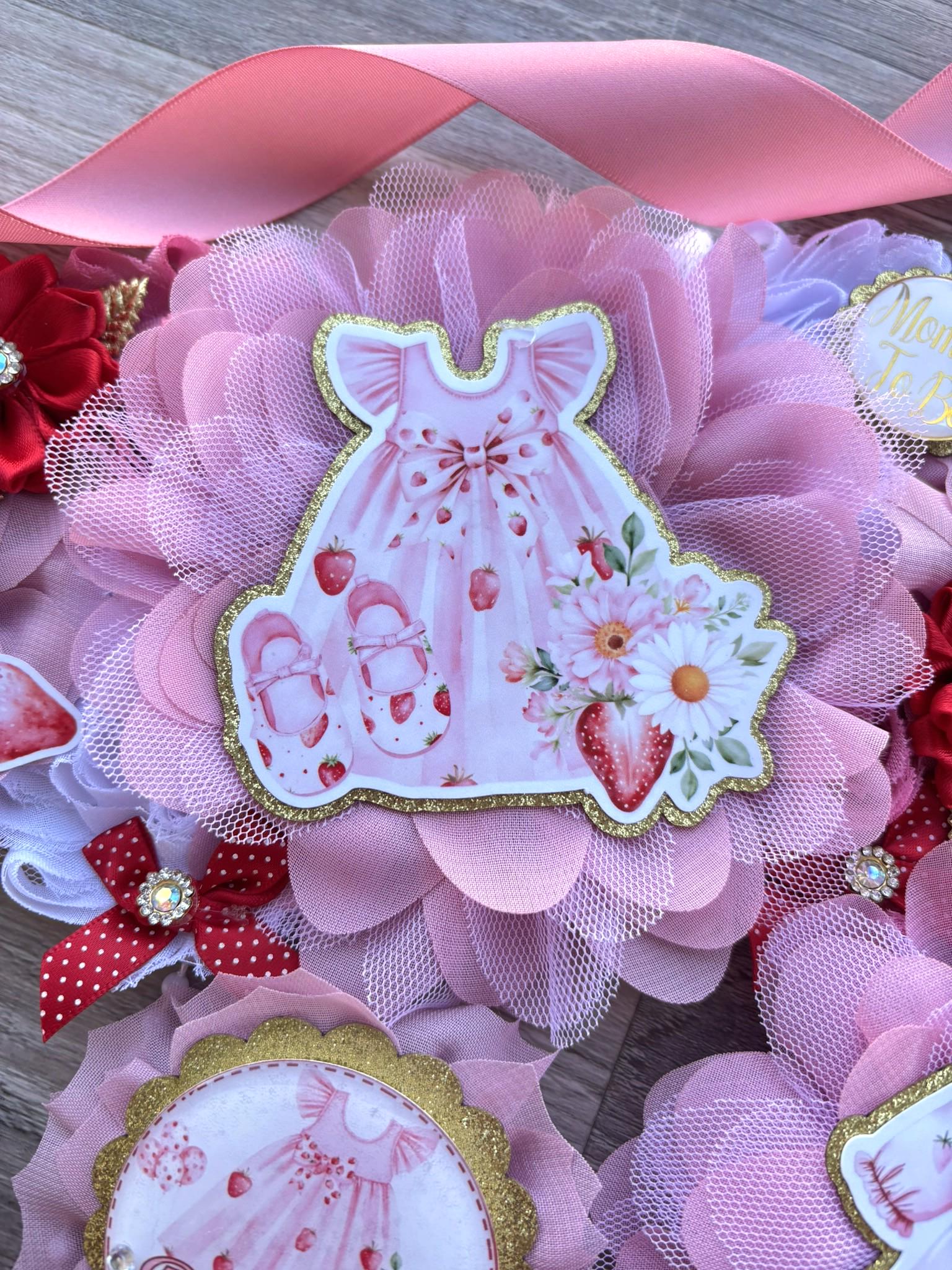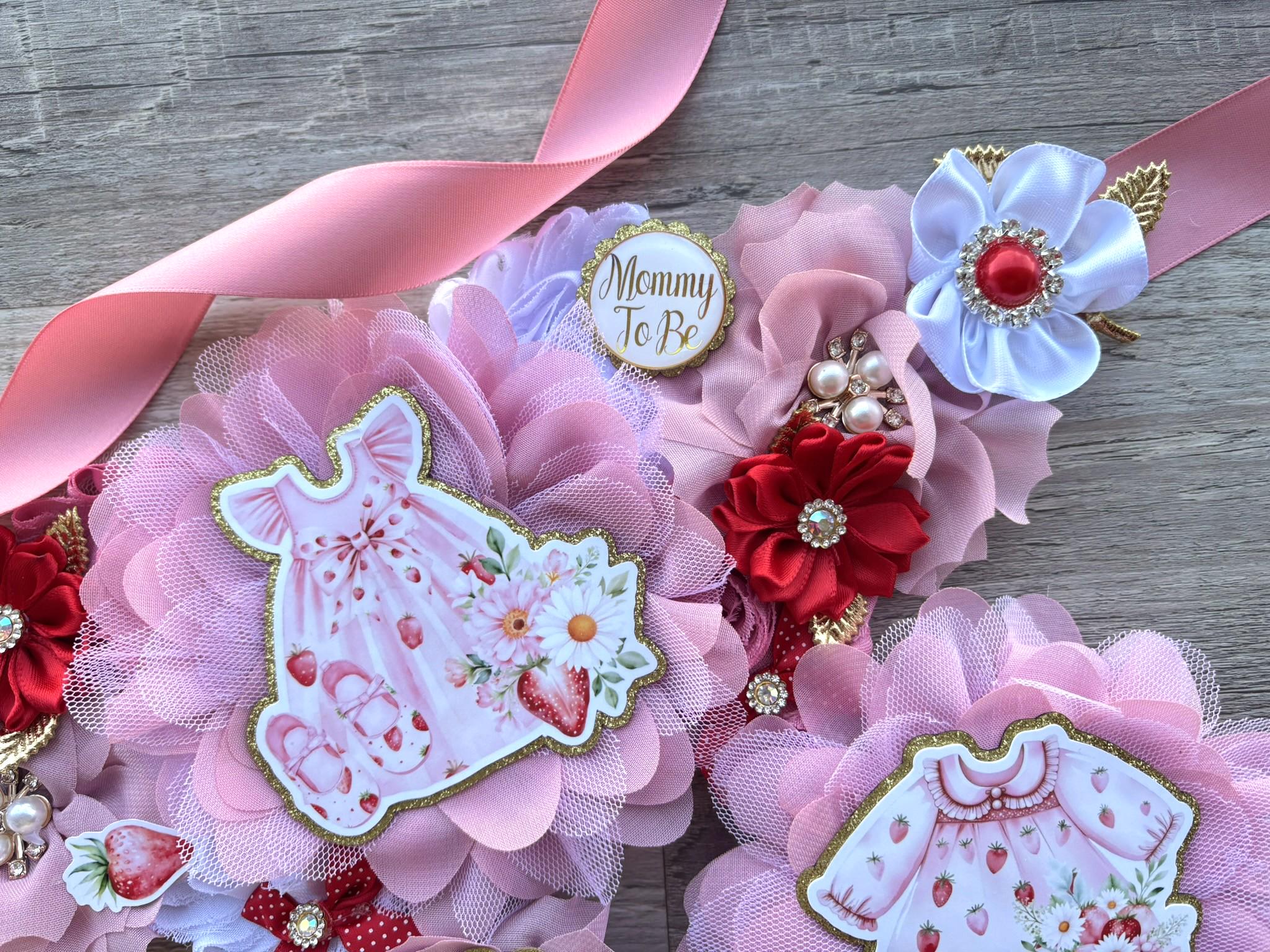 This Strawberry Sash & Pin Set was made especially for a Baby Shower or a Photo Prop.