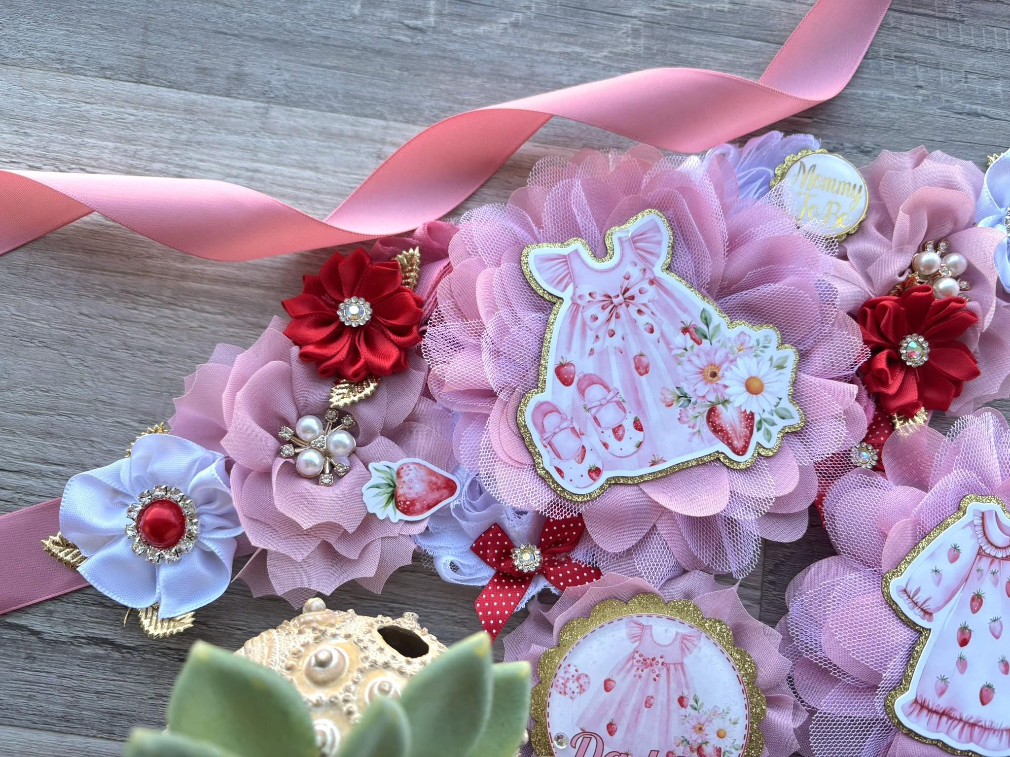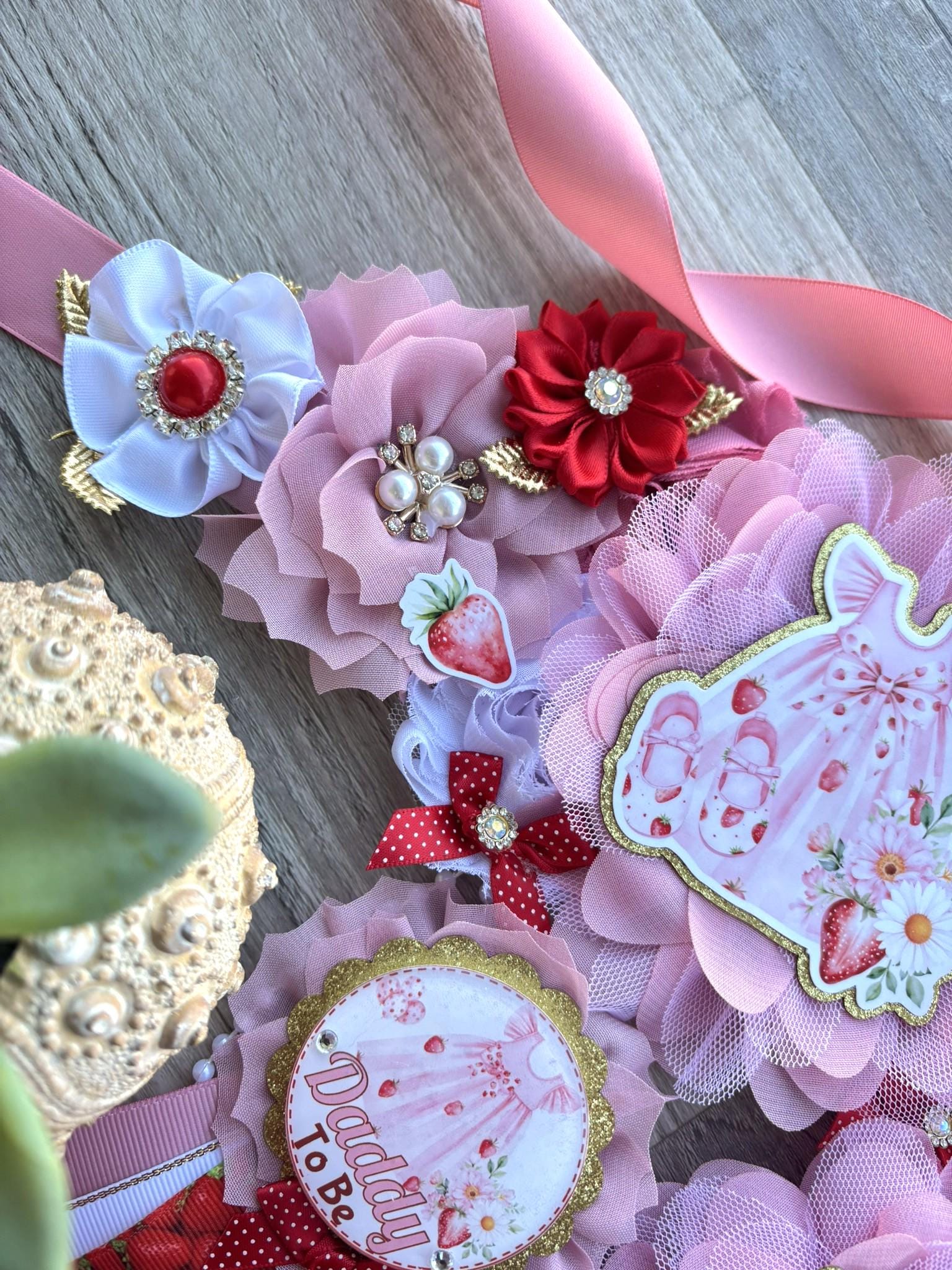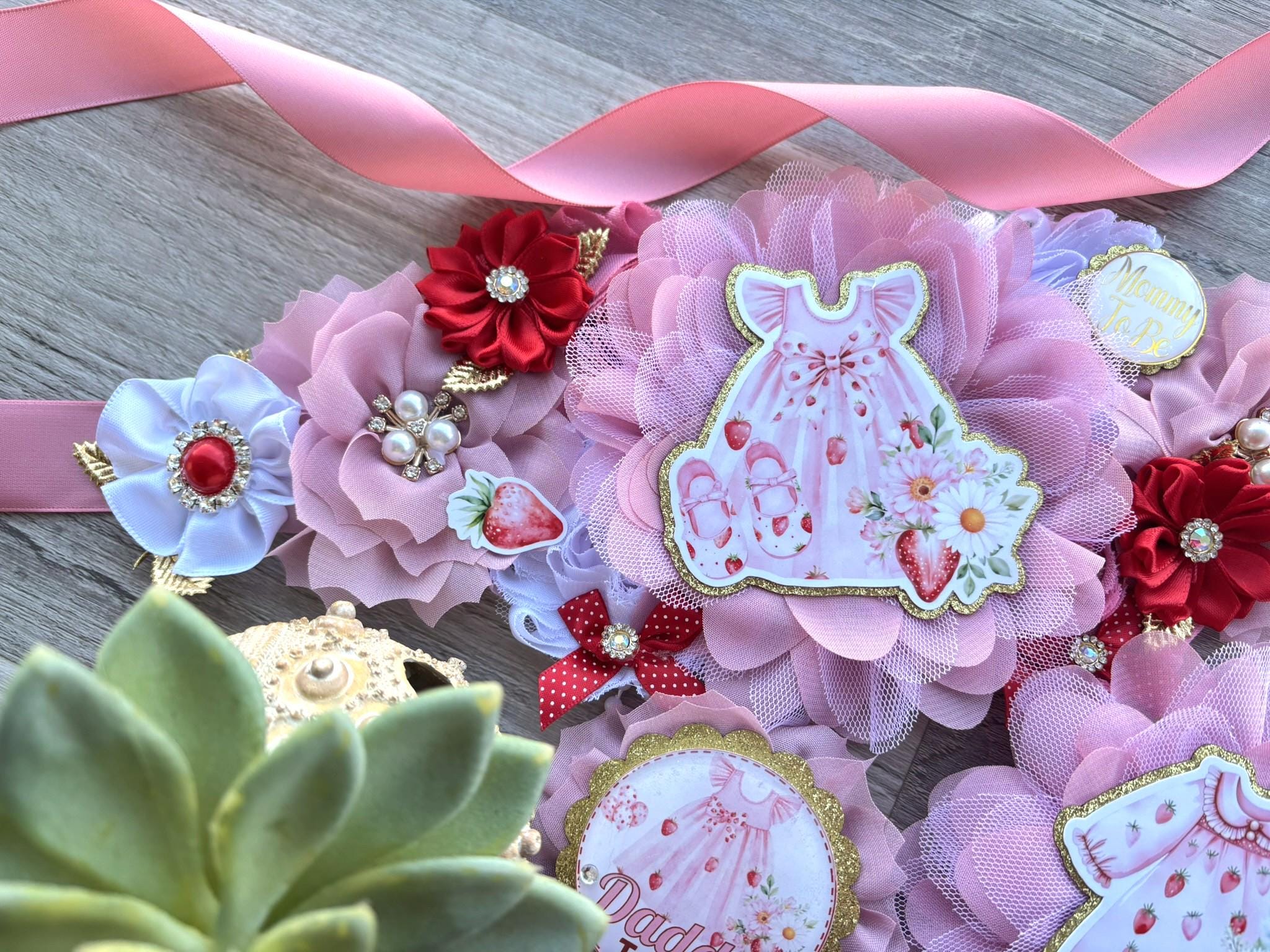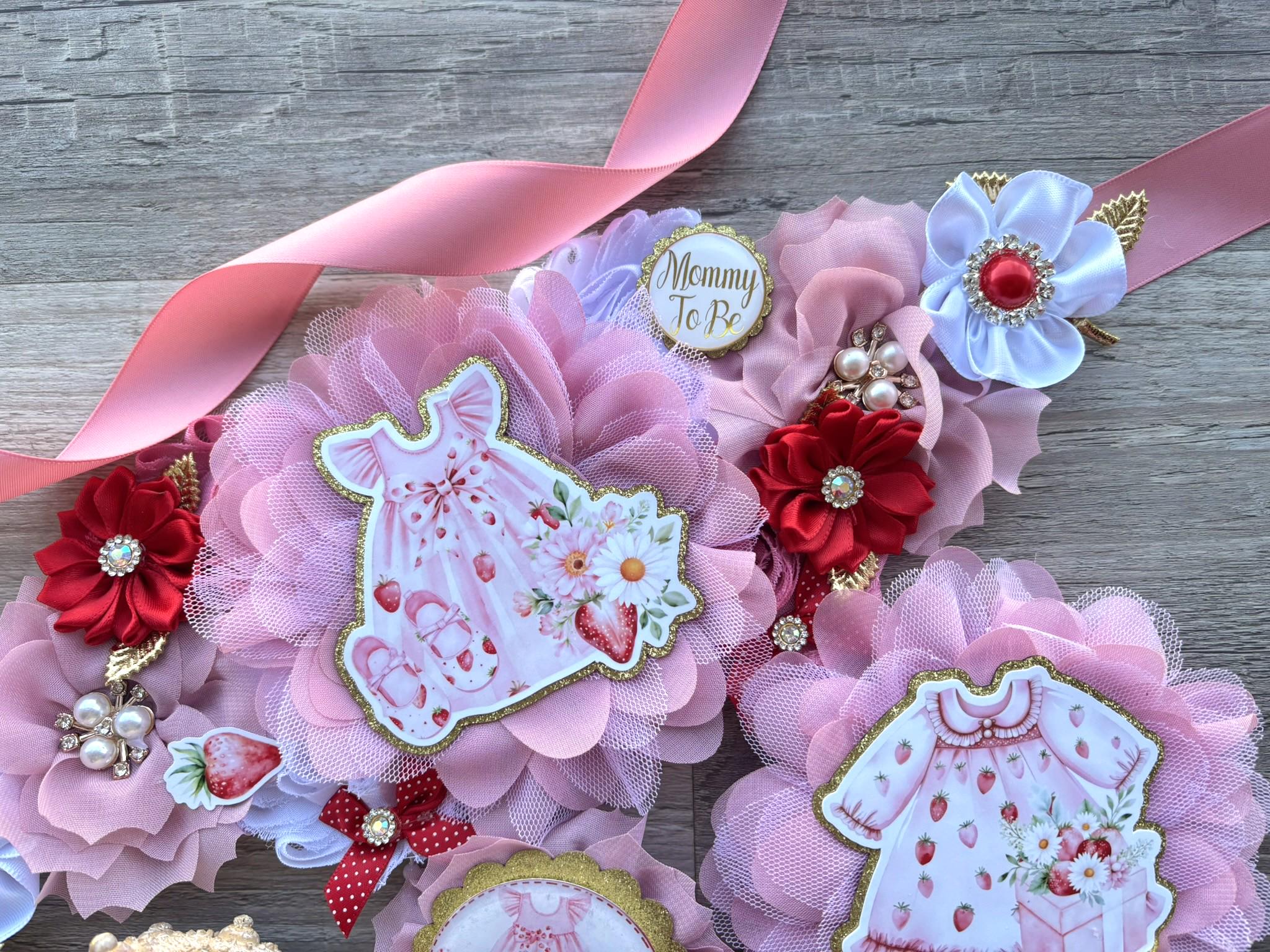 This Strawberry Sash & Pin Set was made especially for a Baby Shower or a Photo Prop.