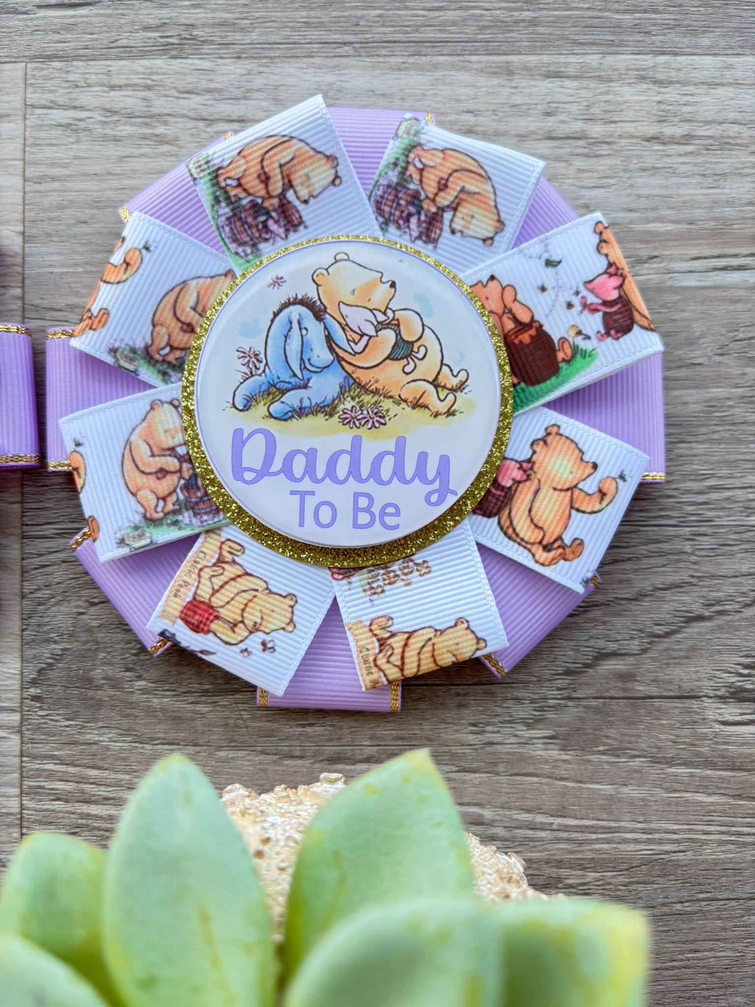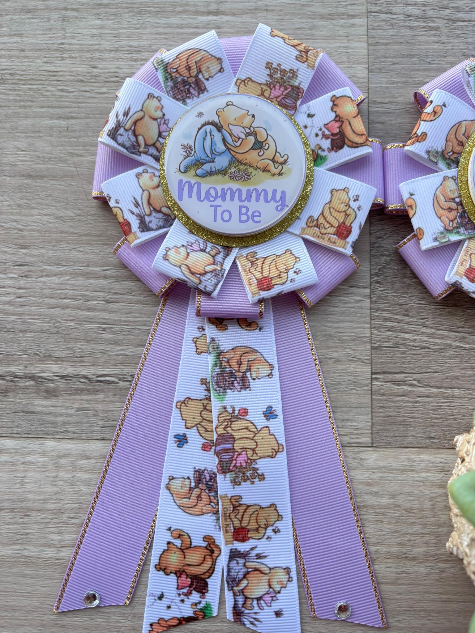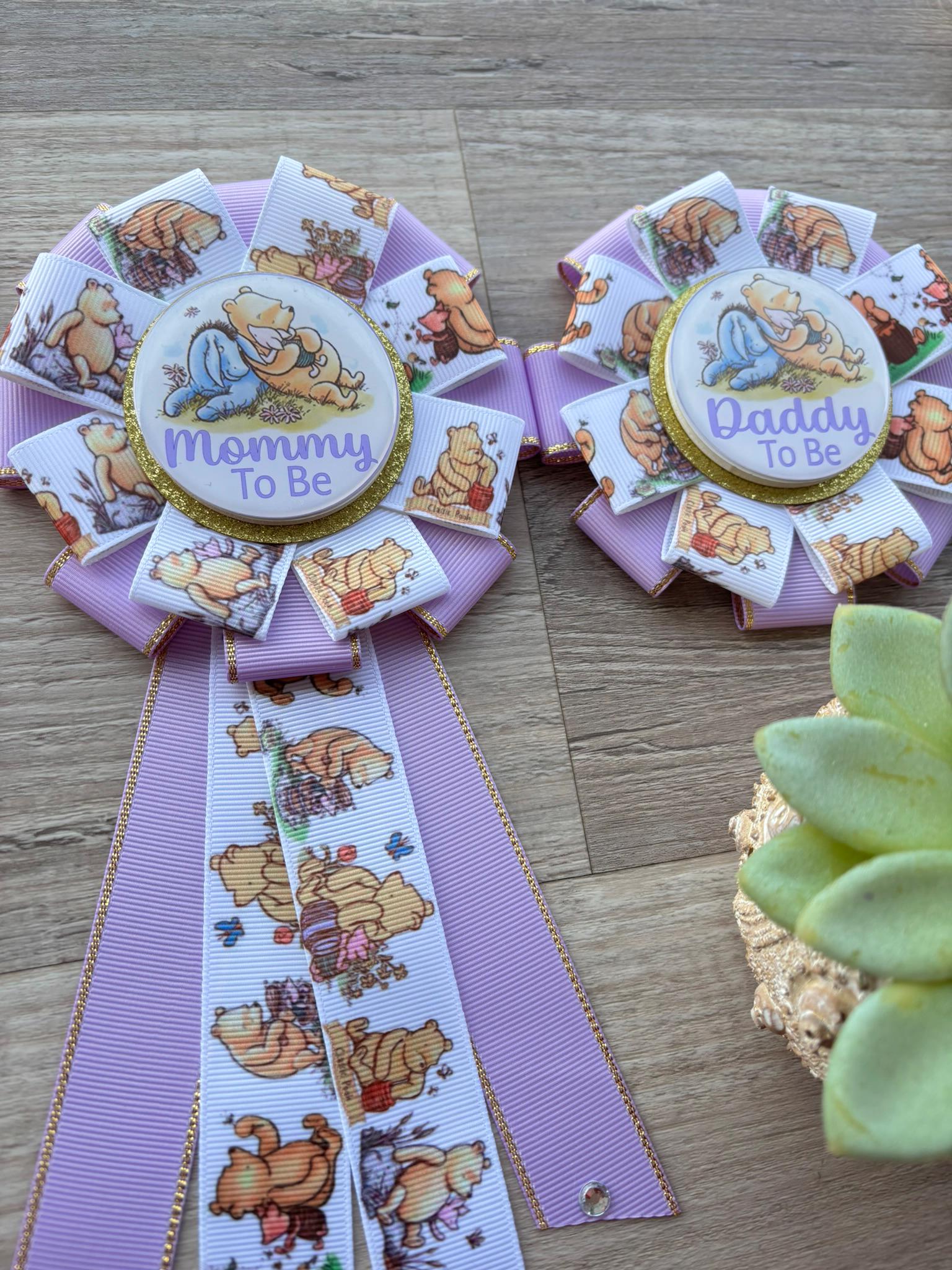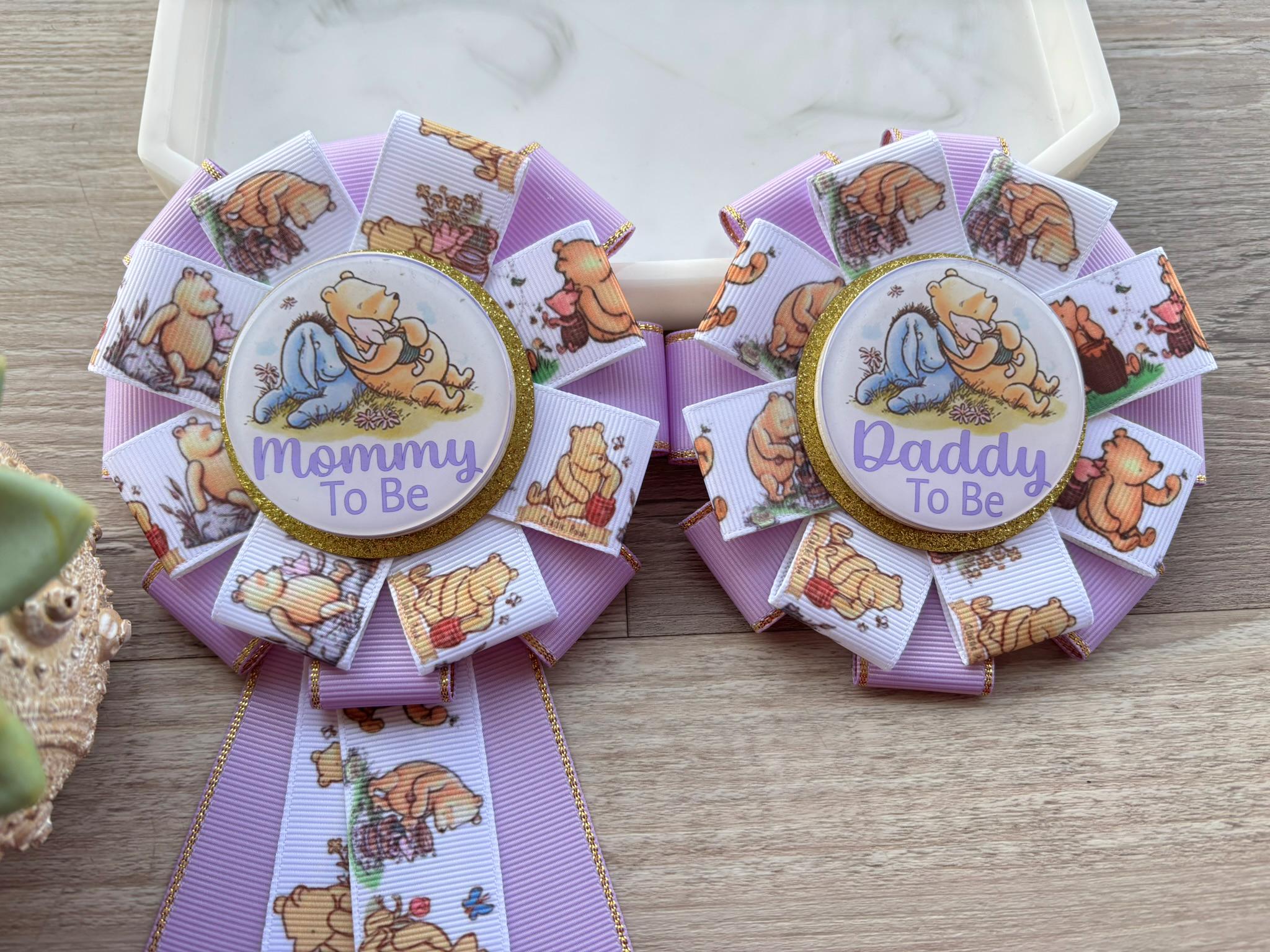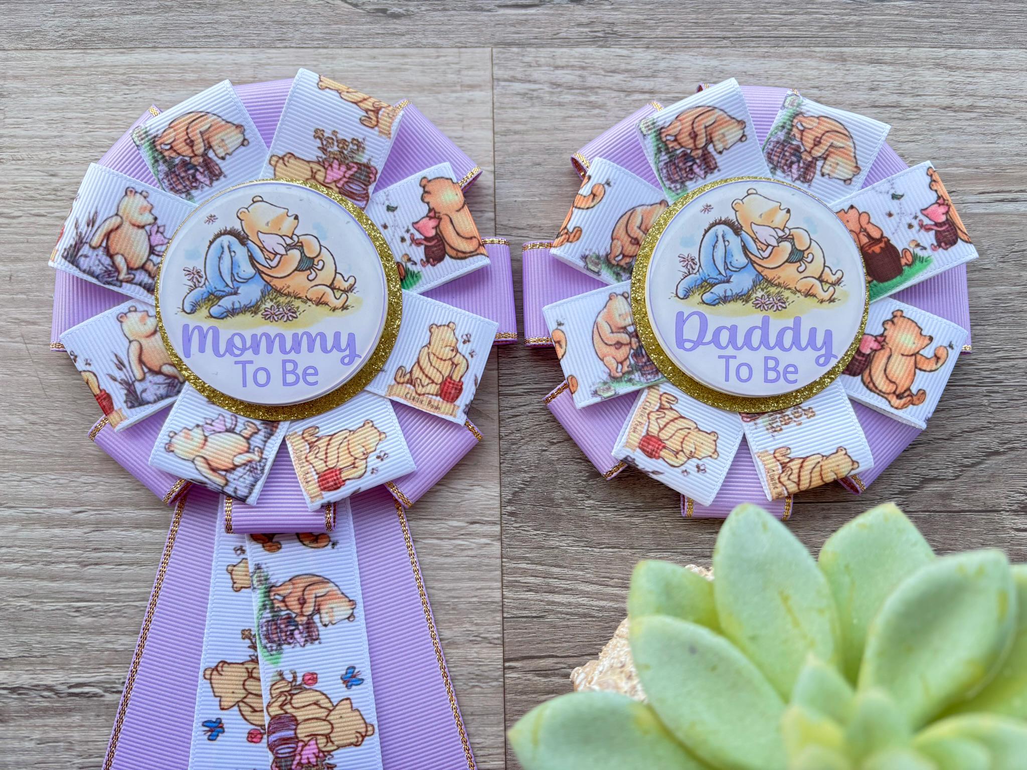 Lavender Winnie Mom & Dad Pins, Winnie The Pooh Baby Shower, Girl Mommy To Be Ribbon, Daddy To Be Pin, Parent's To Be Pins