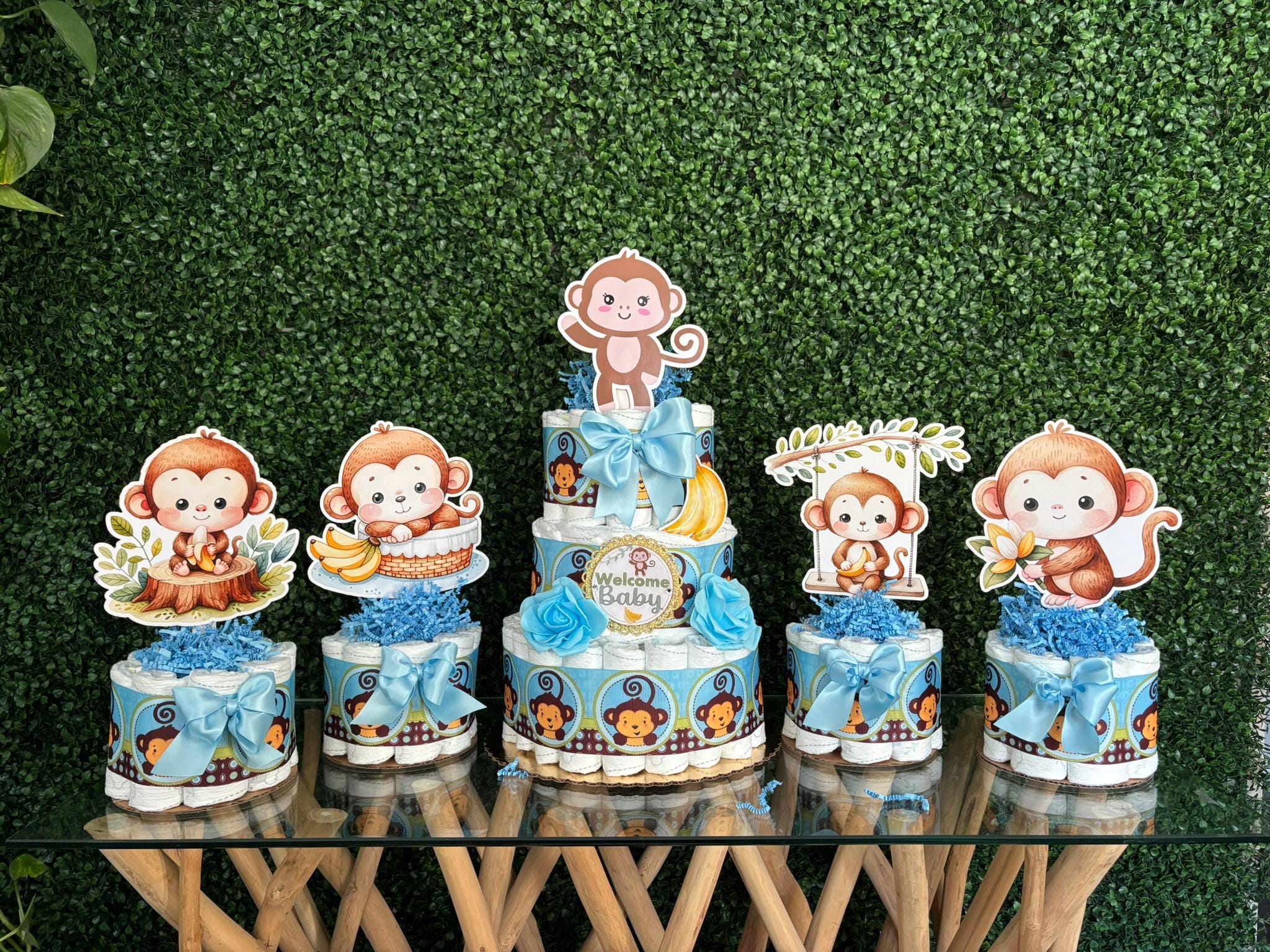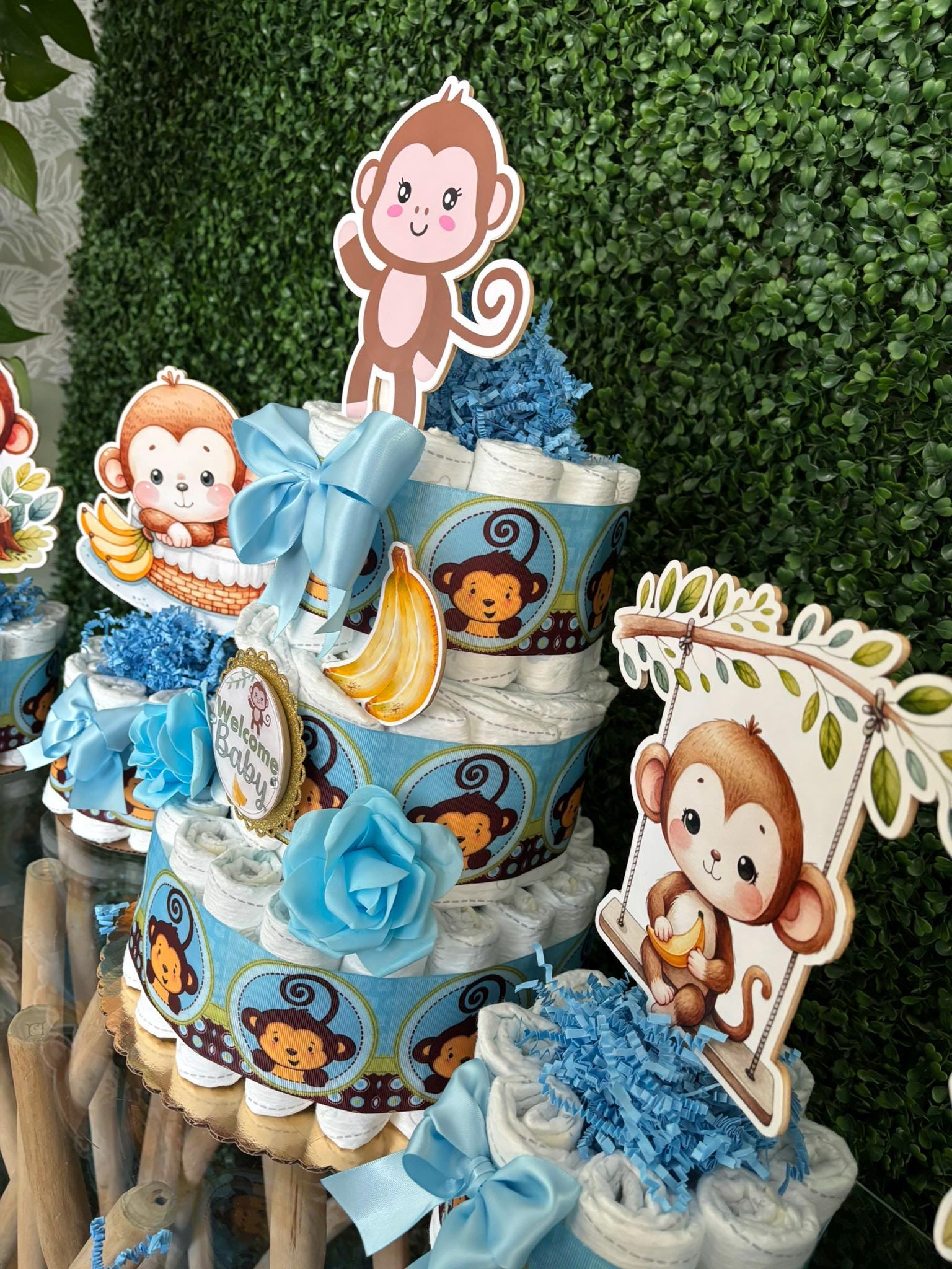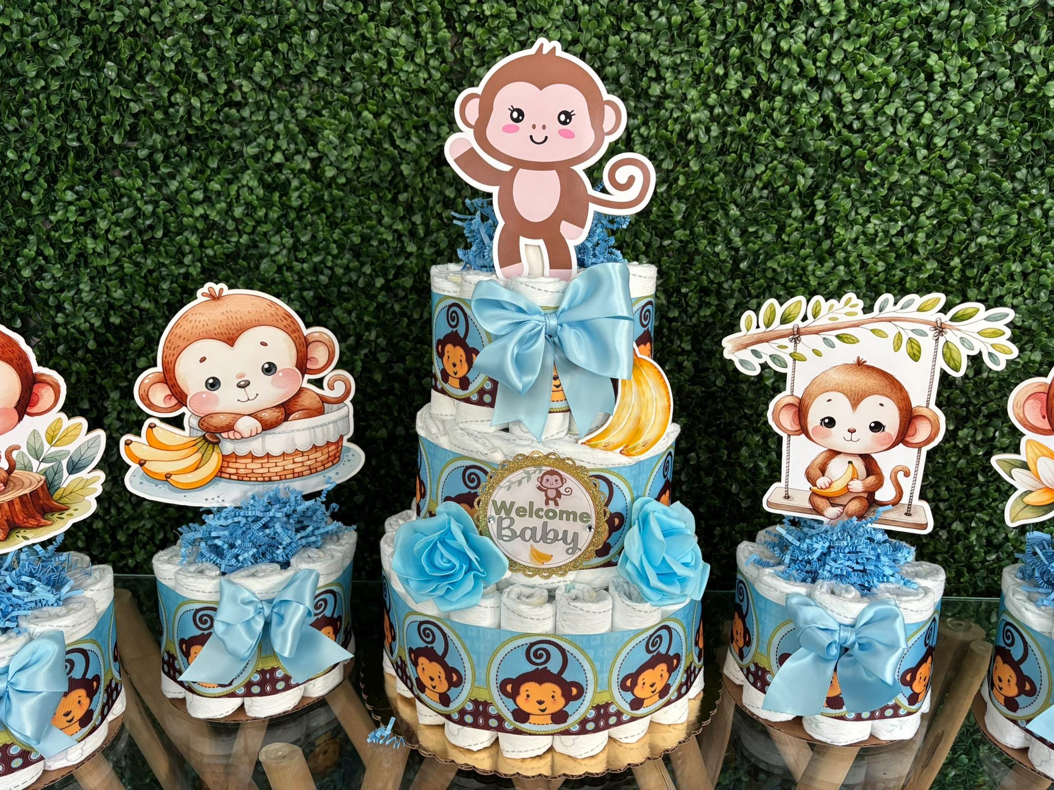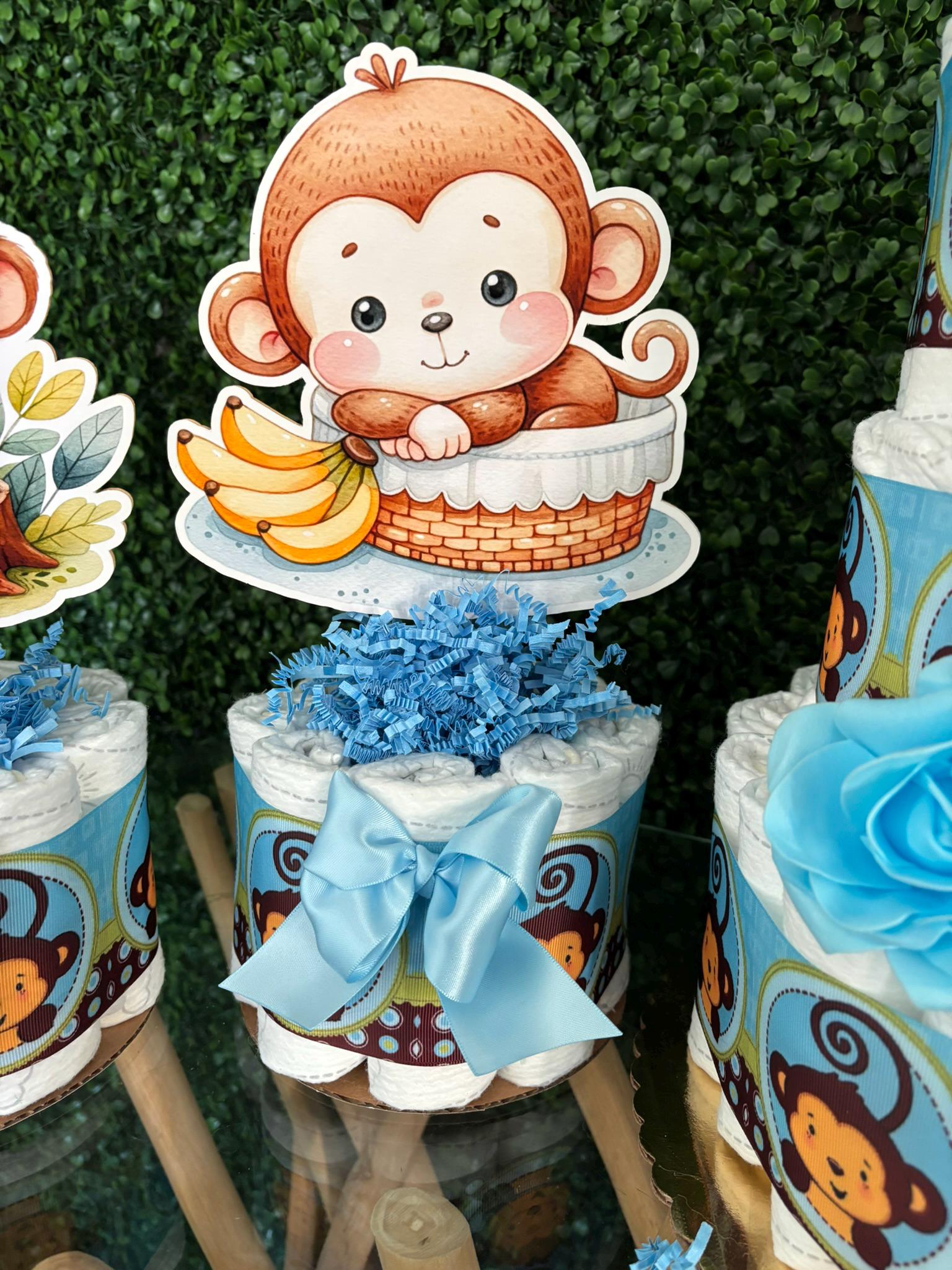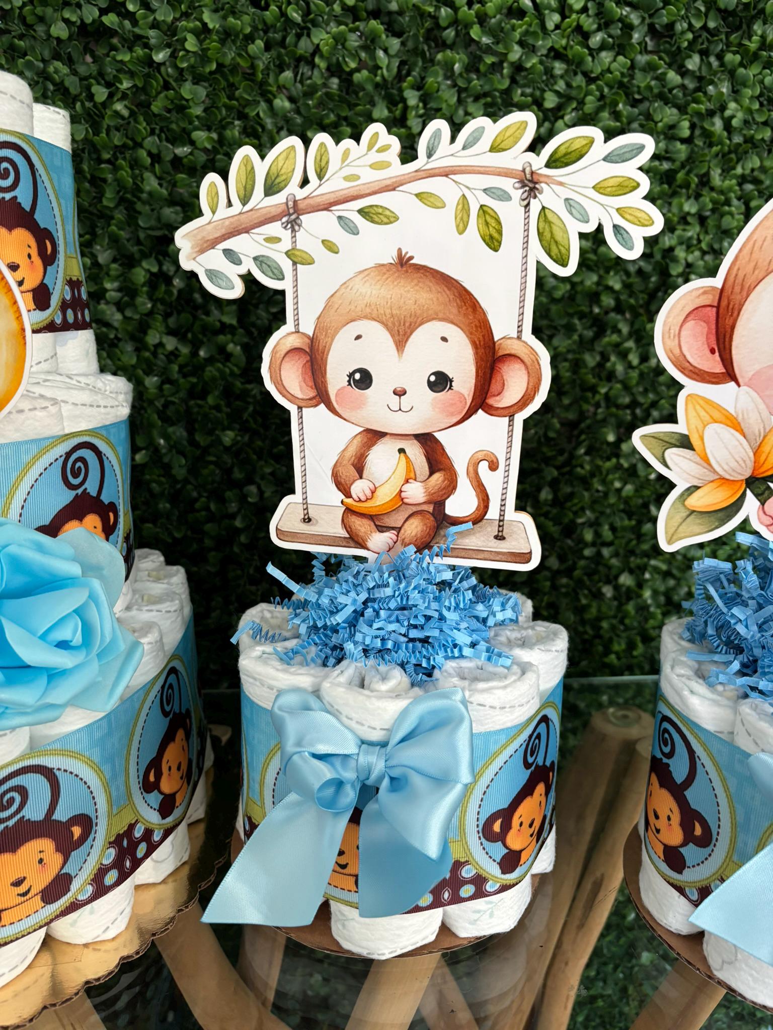Boy Monkey Diaper Cake Baby Shower, Diaper Cake Centerpieces, Monkey Table Decor for Baby Shower, New Mom Gift II 3 Tier Cake & Mini Diapers