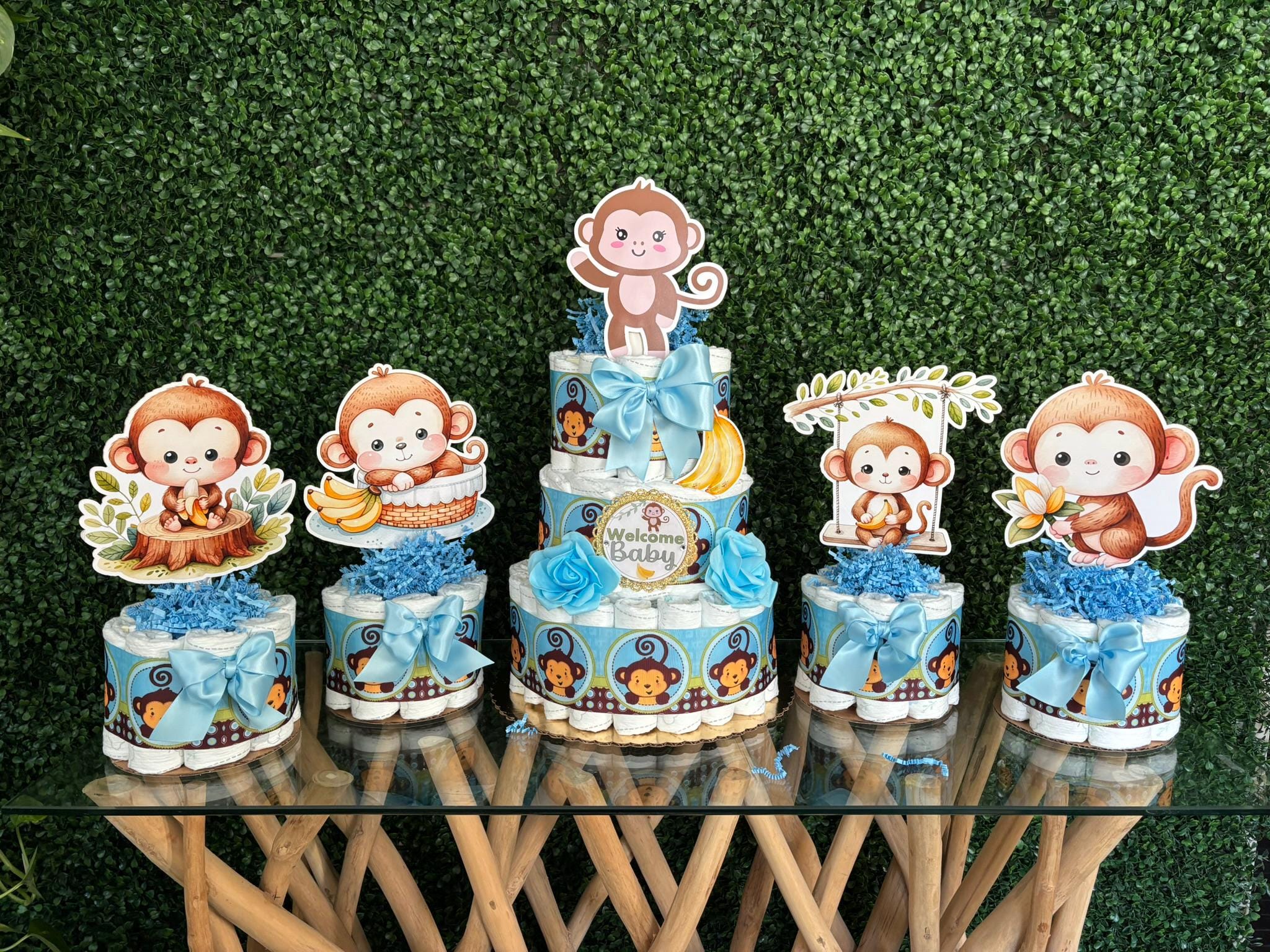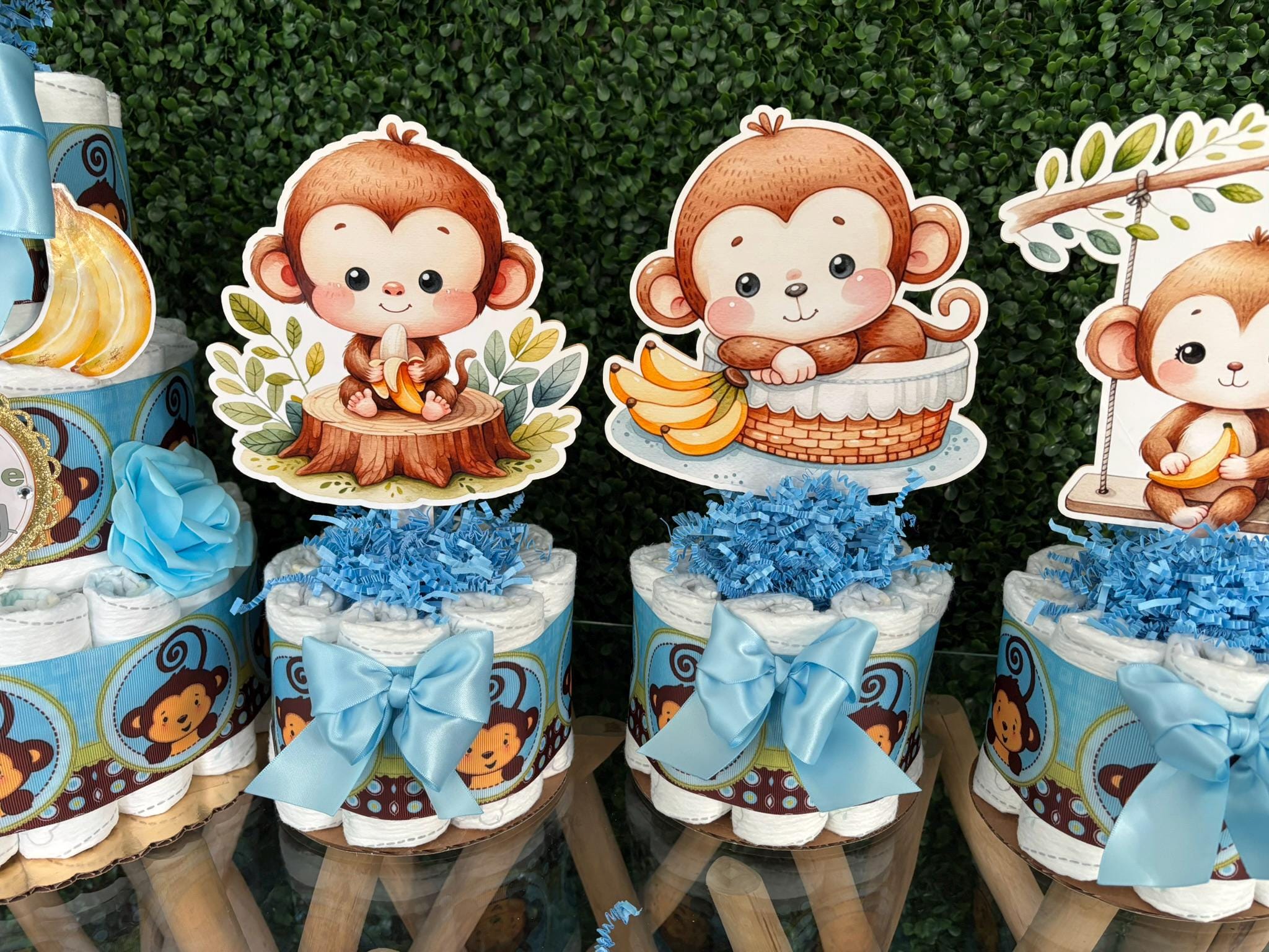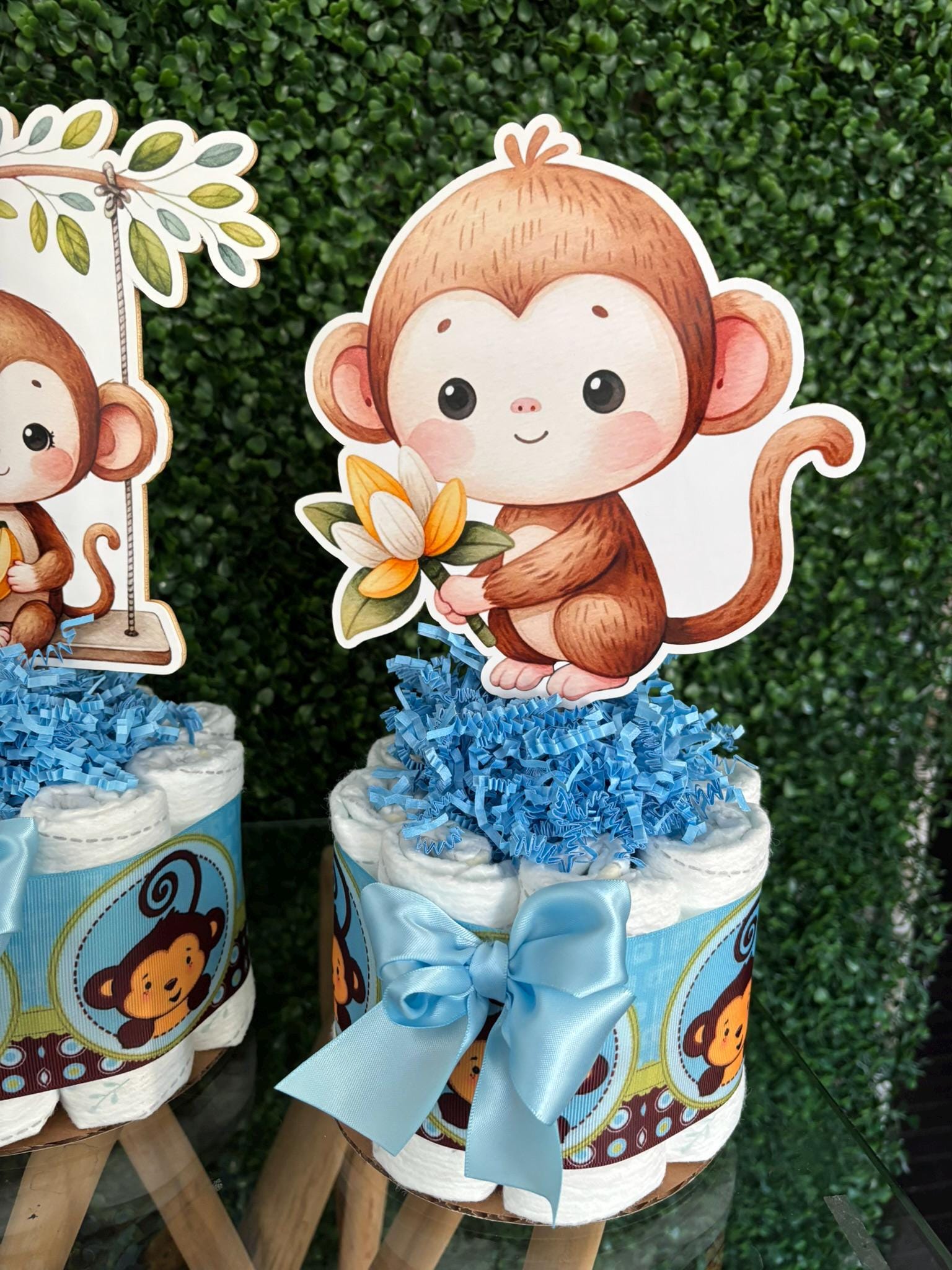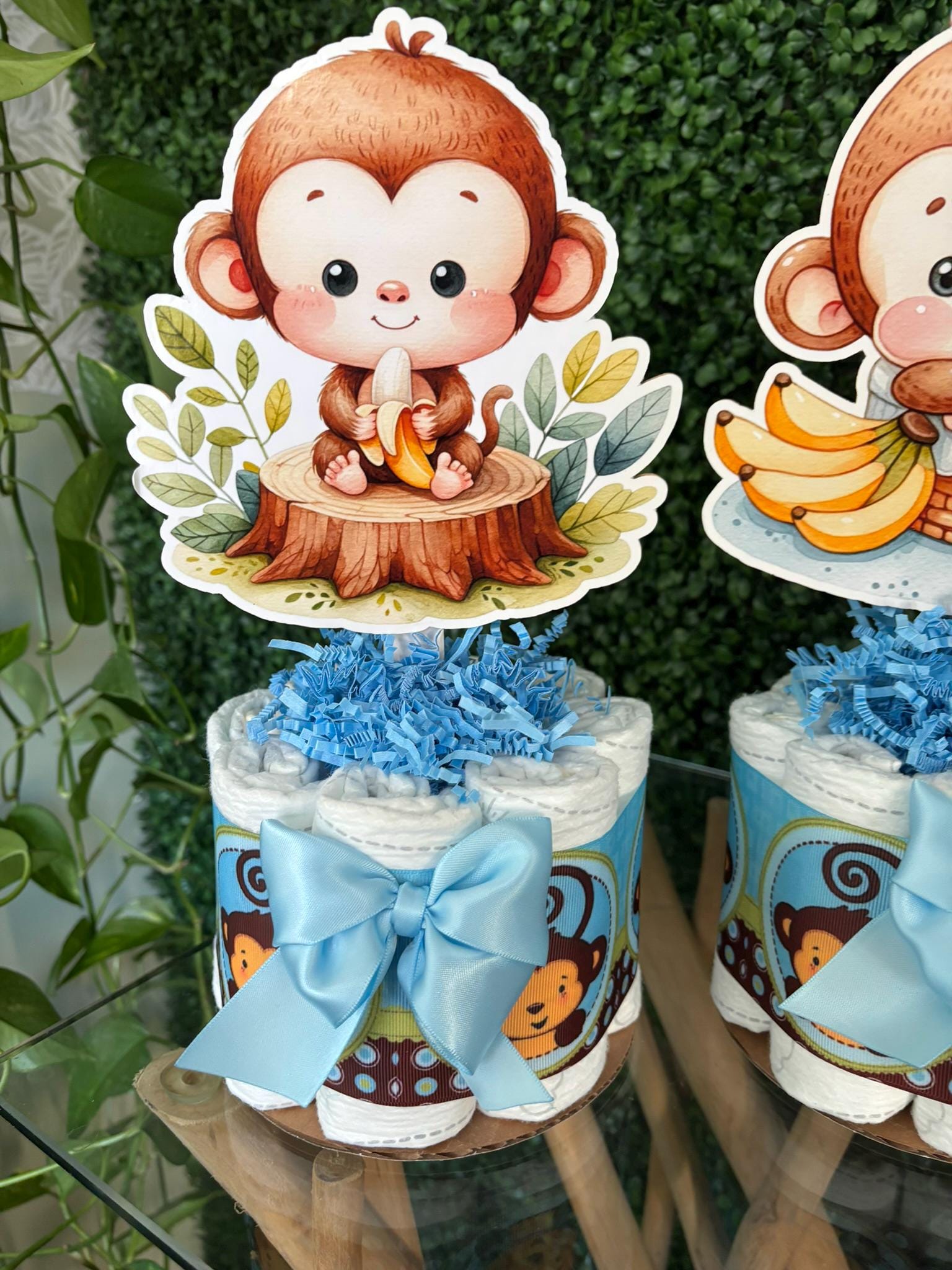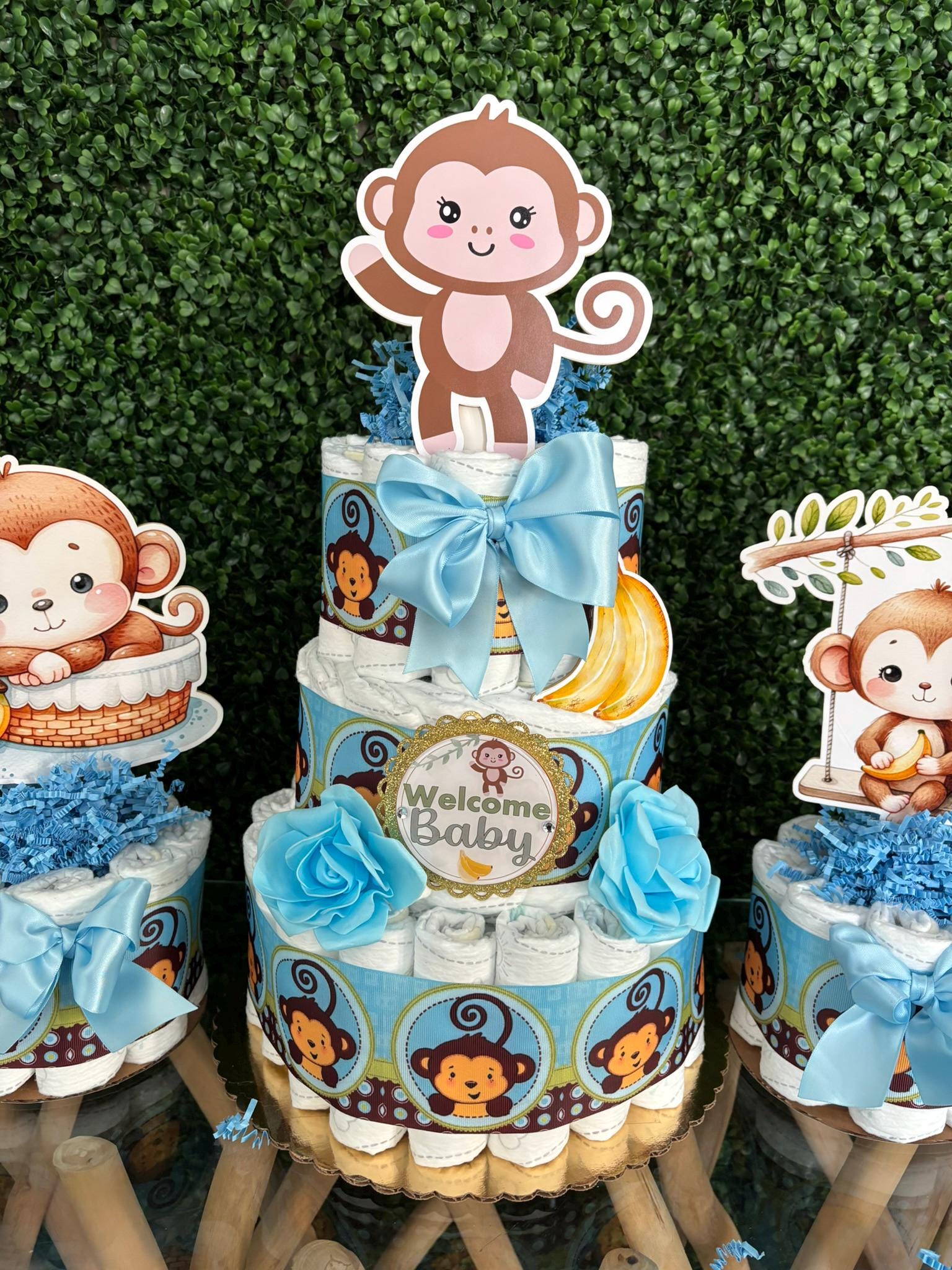 This Gorgeous Monkey Diaper Cake is the perfect centerpieces for your baby shower. We can match any shower theme.