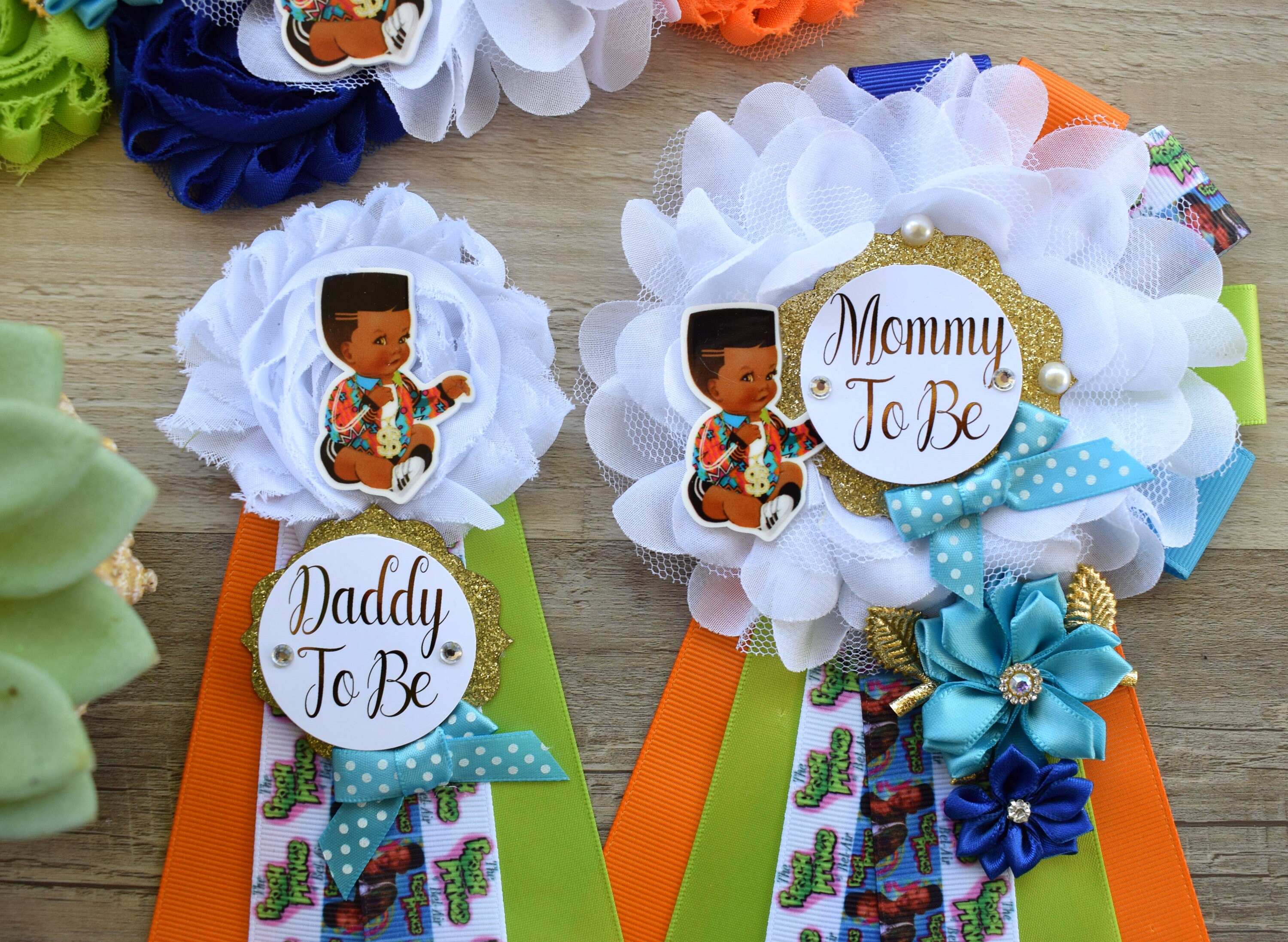 Baby Boy Prince Fresh Baby Shower, Prince Maternity Sash, Mommy To Be Ribbon Pin, Daddy To Be Ribbon, Orange Green Blue, Baby Shower Gift