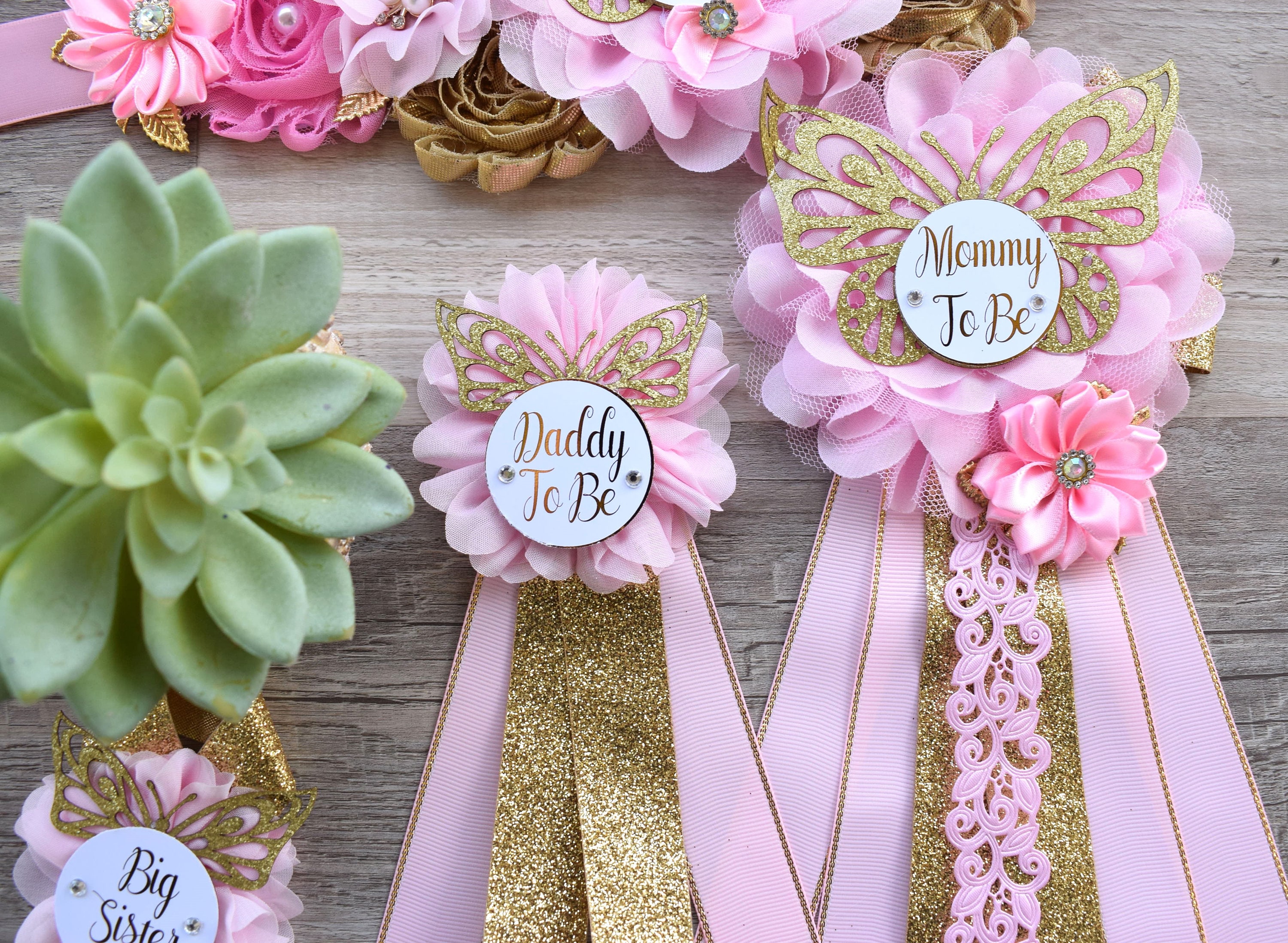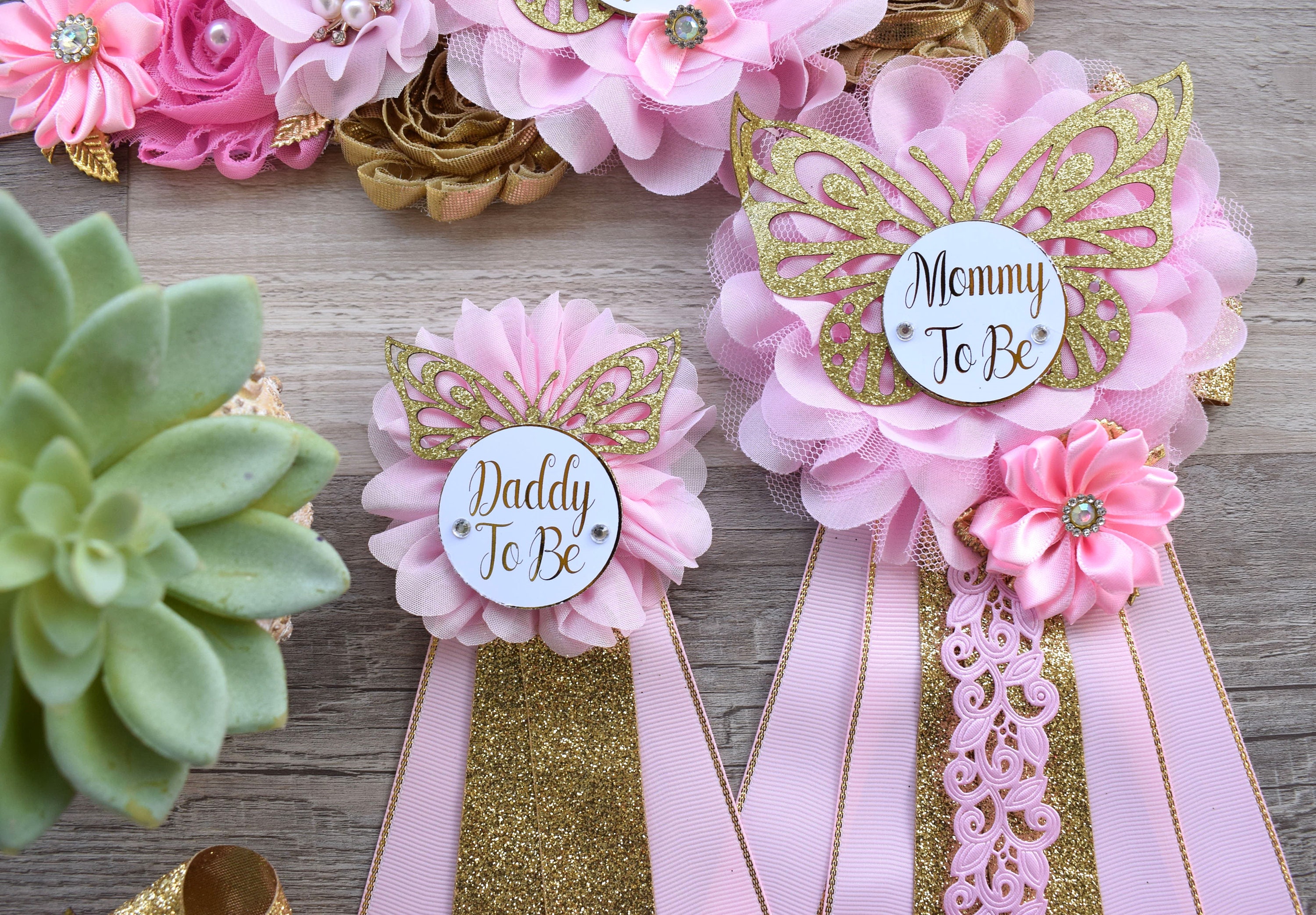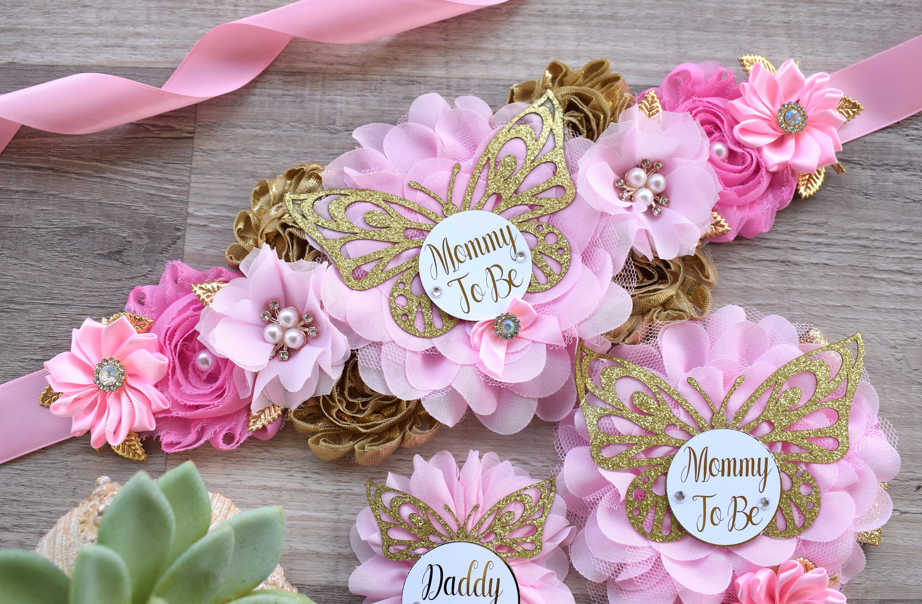 Pink Butterfly Baby Shower, Butterfly Maternity Belly Sash, Pink Gold Butterfly Mommy To Be Ribbon, Butterfly Daddy To Be Pin, Custom