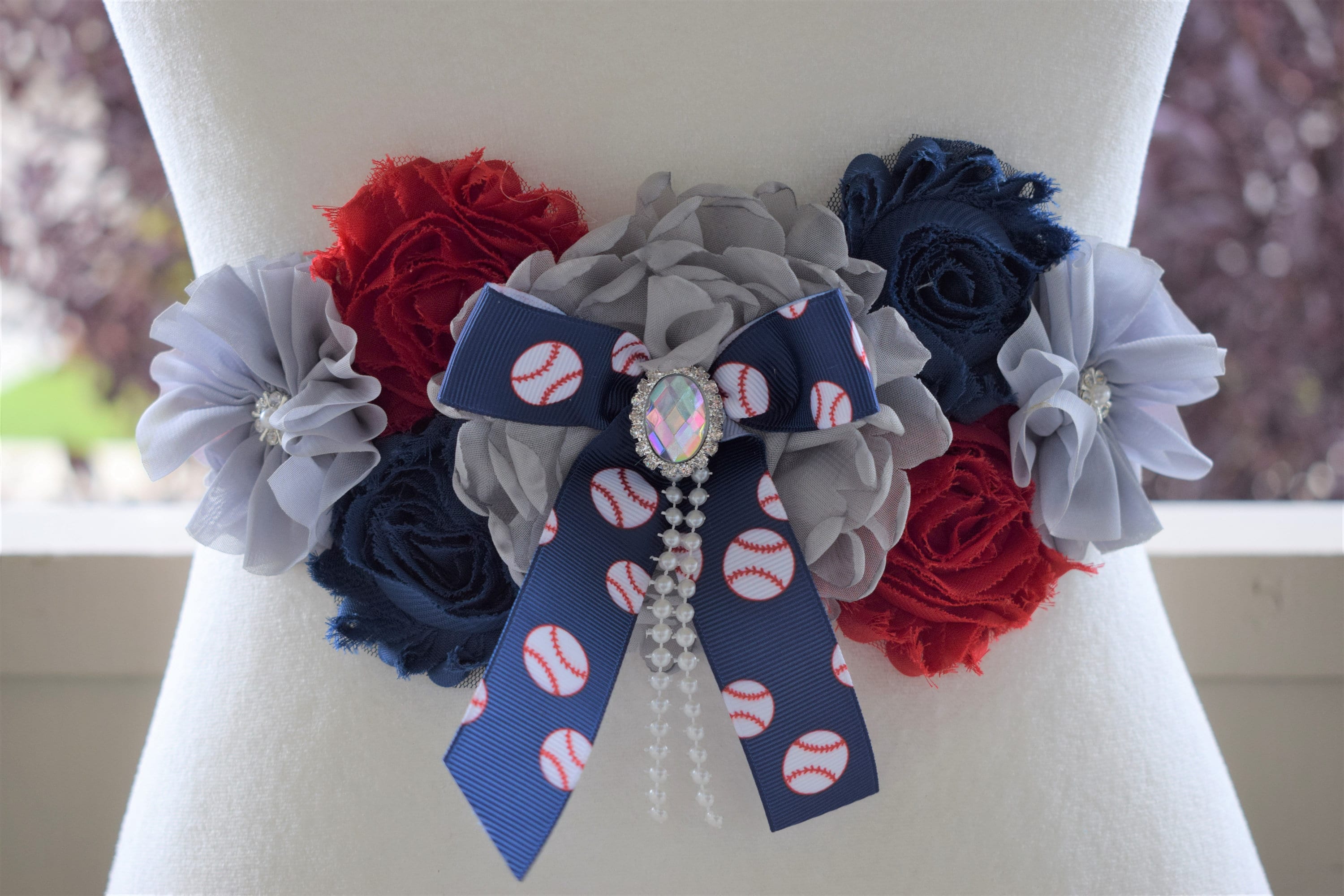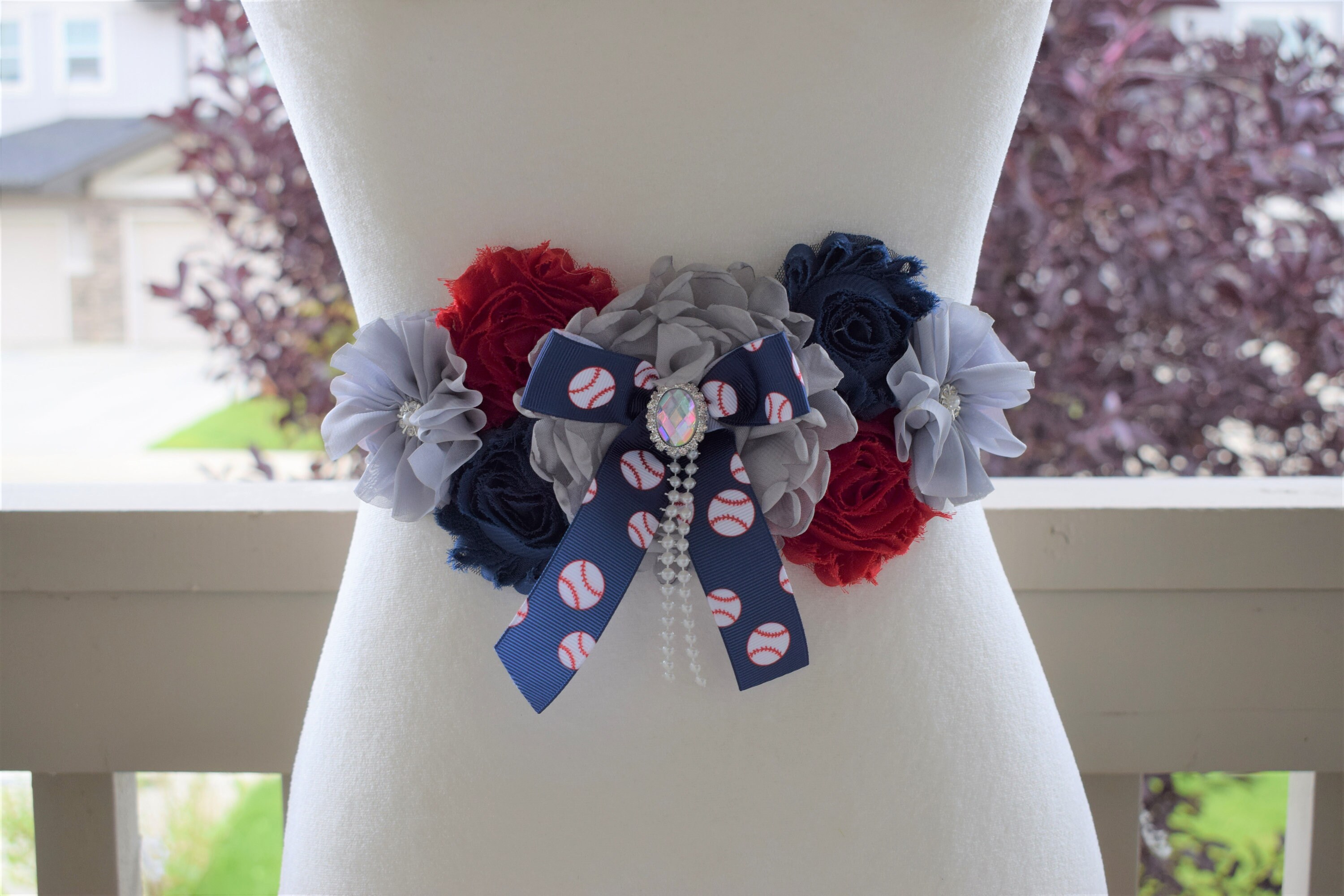Baseball Maternity Sash, Sport Red Blue Flower Sash, Royal Blue Red Grey Pregnant Sash, Sport Baby Shower, Baseball Baby Shower, Custom Sash