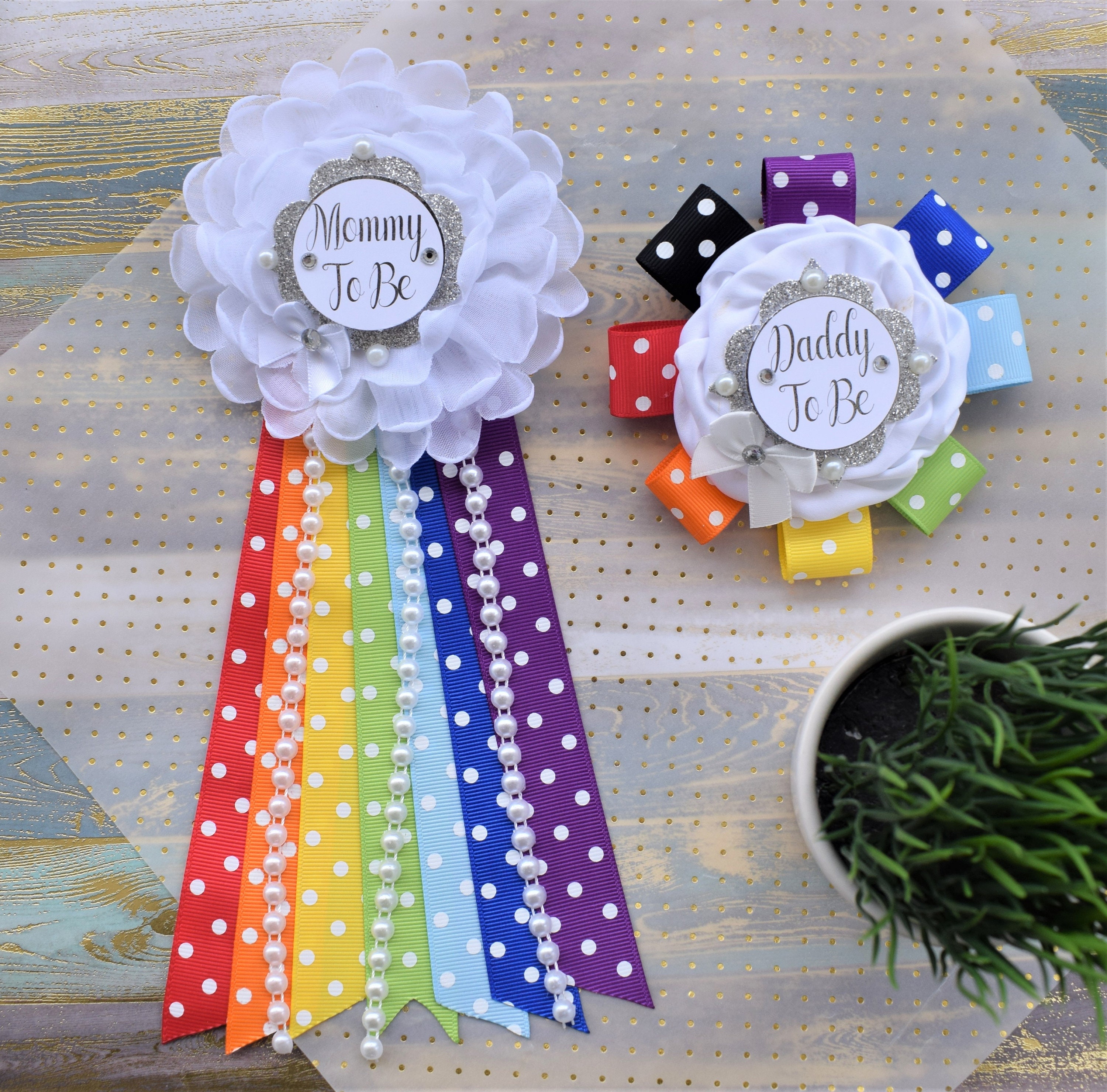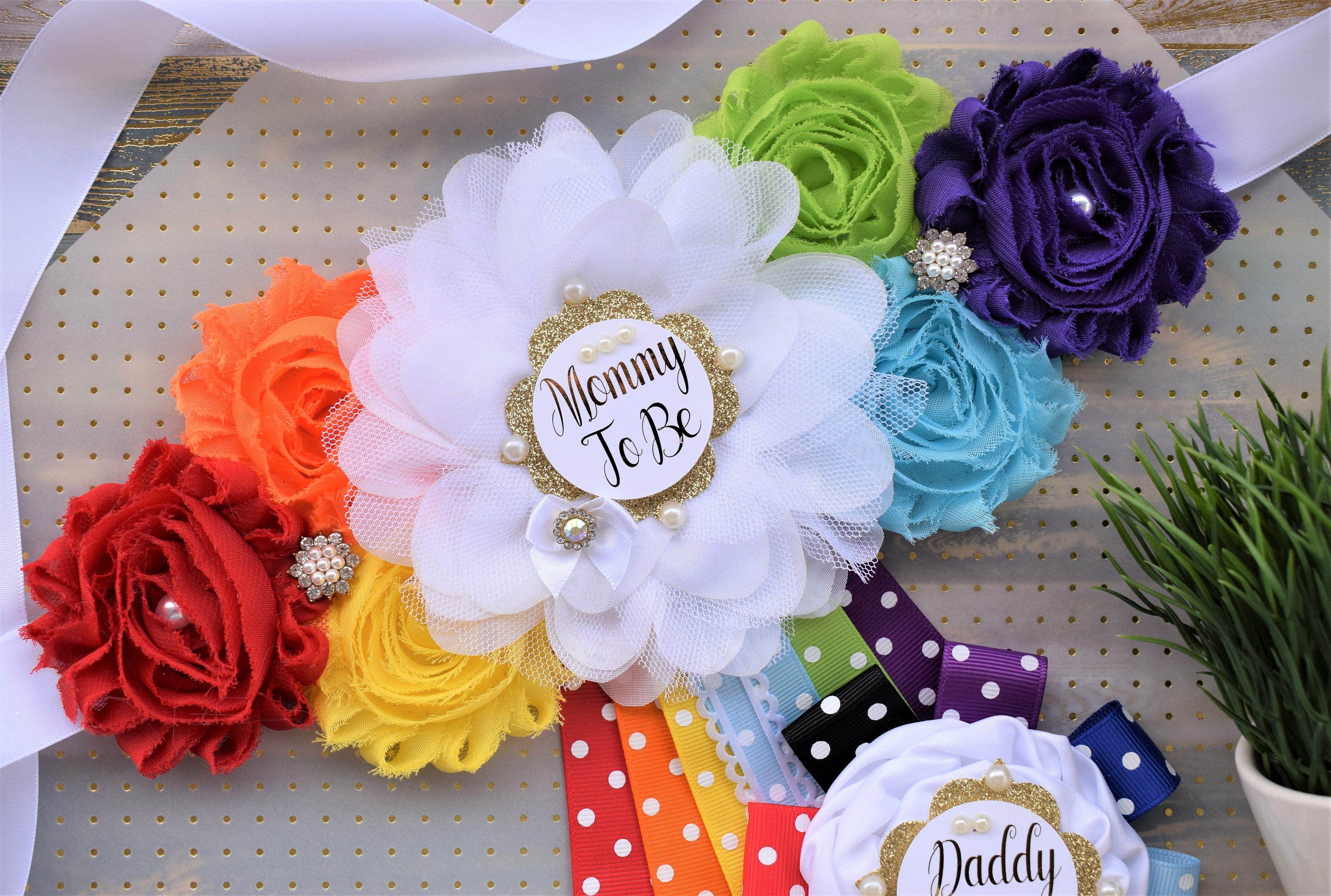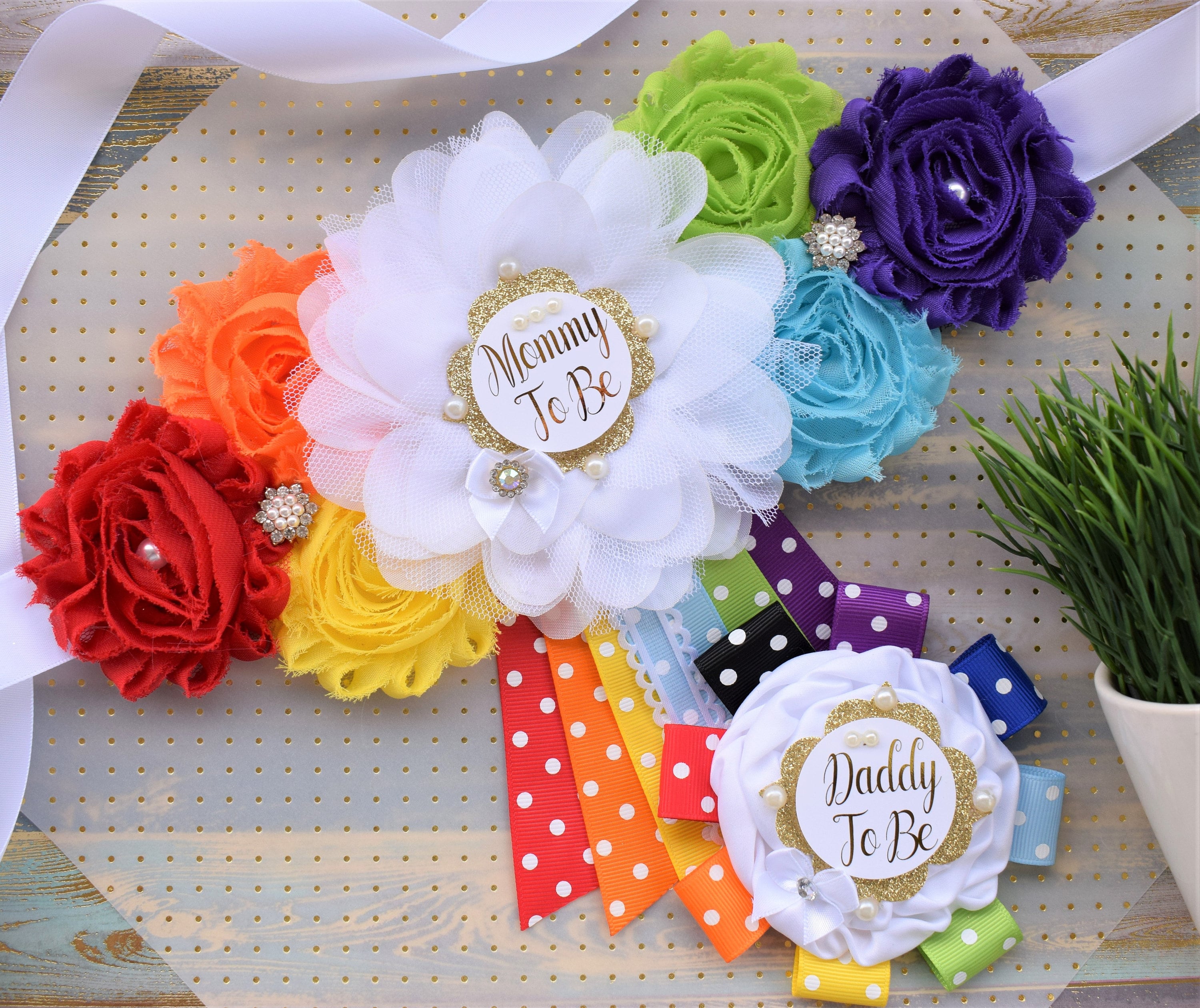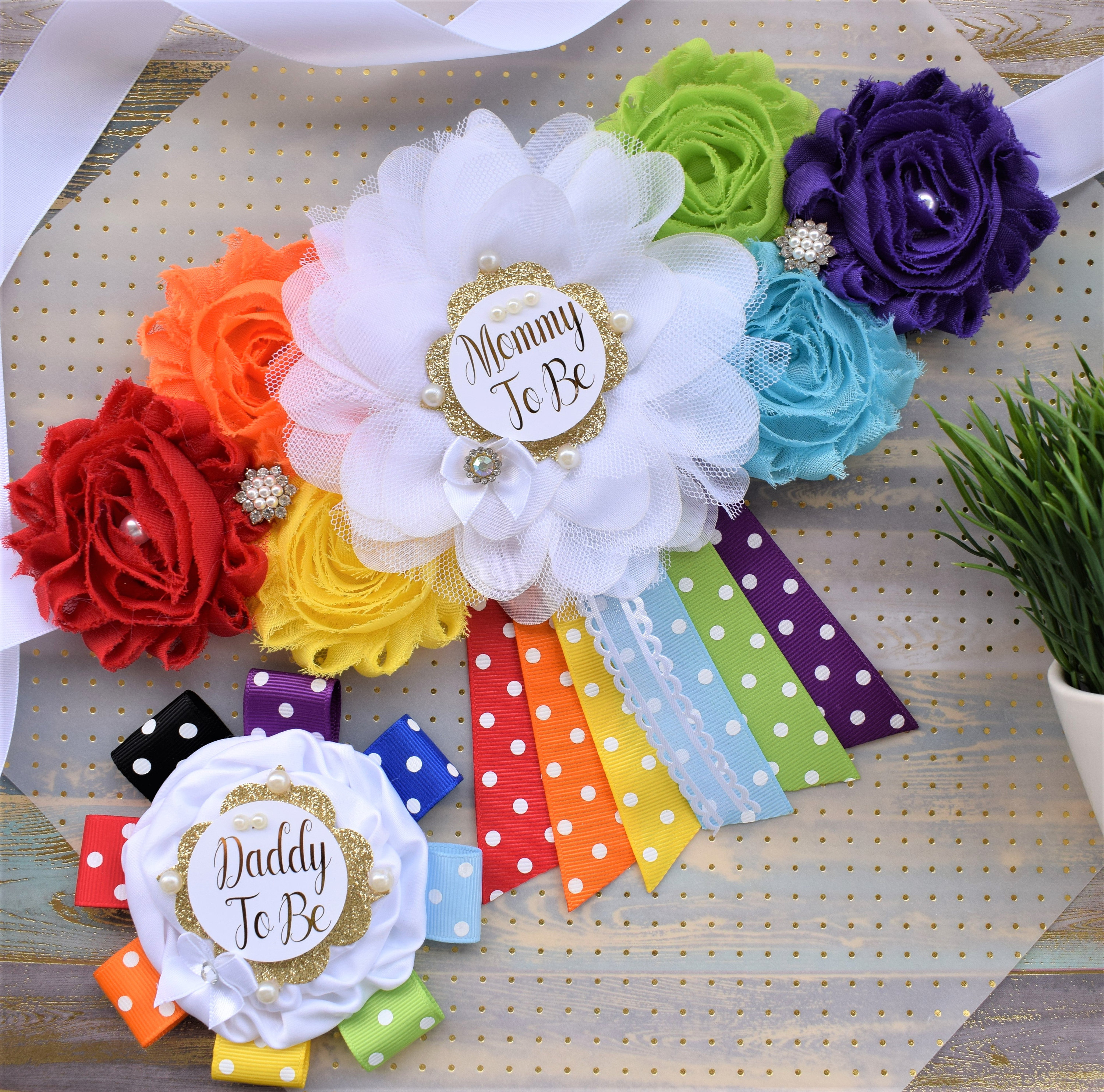 This Rainbow Sash & Pin Set were made especially for a Baby Shower or a Photo Prop.