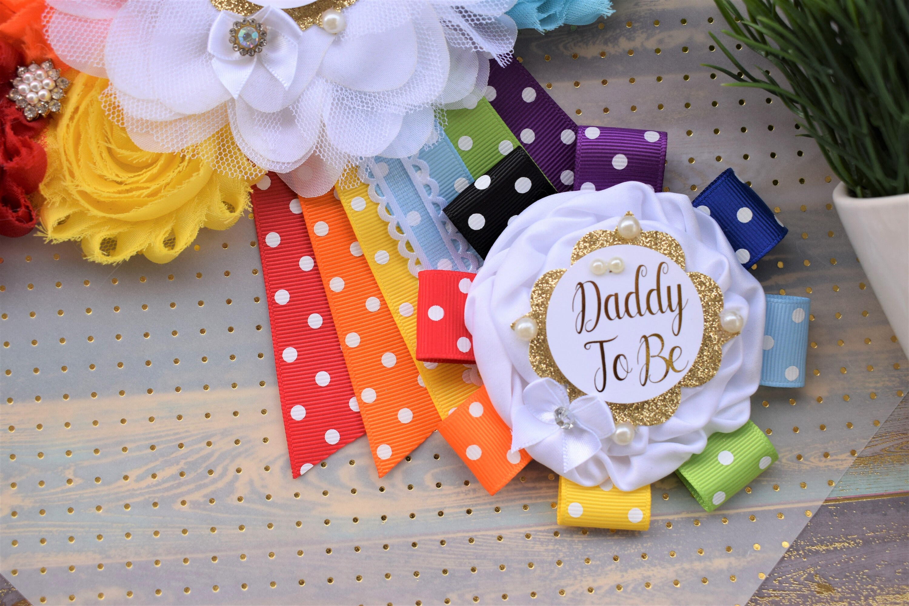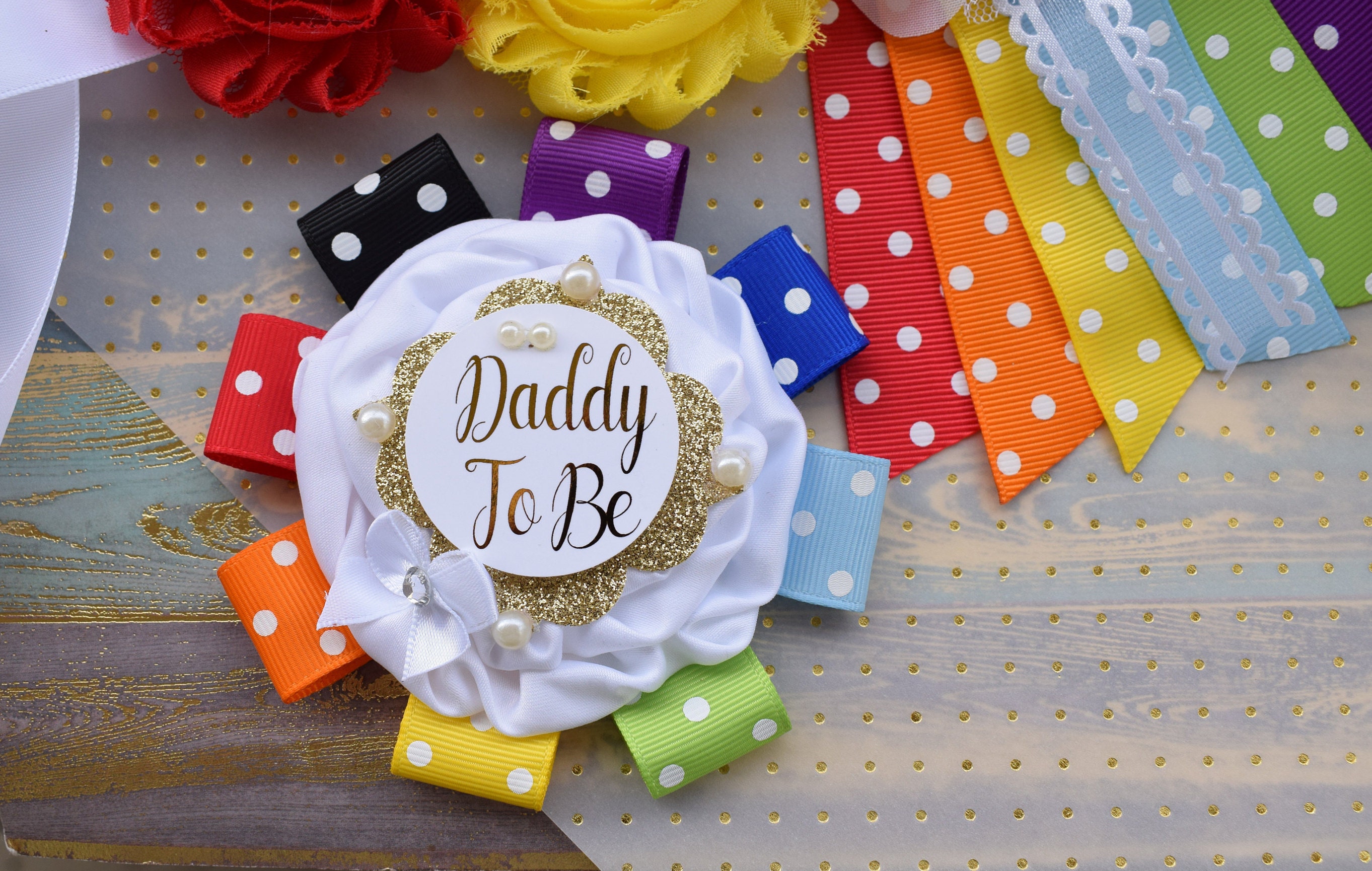 ☆Daddy to Be Pin: This pin measures approx. 7" from top of the flower to bottom of the ribbon.