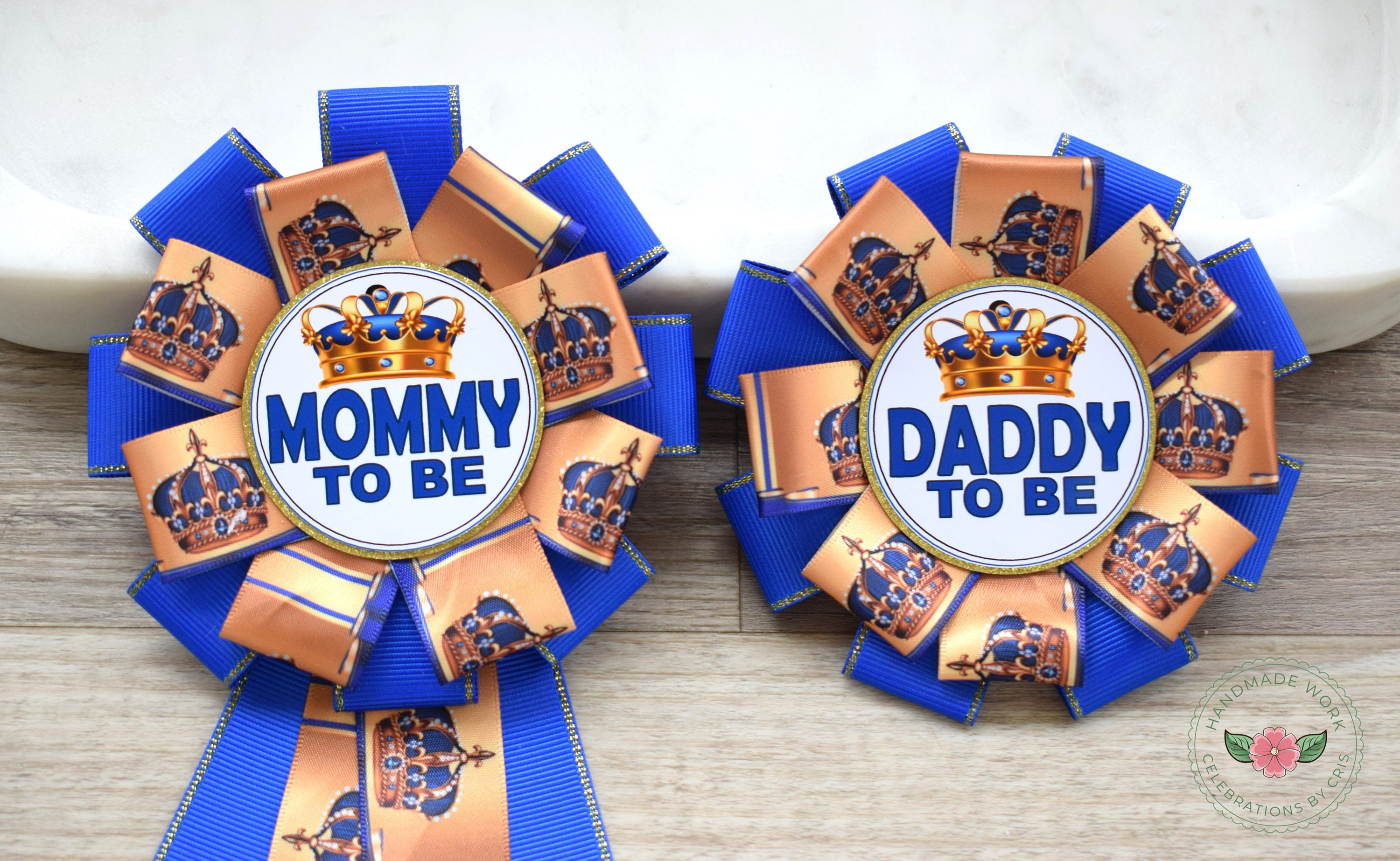 Royal Prince Corsage Pin, Royal Gold Corsage Pin, Mommy To Be Ribbon Pin, Daddy to Be Badge Pin