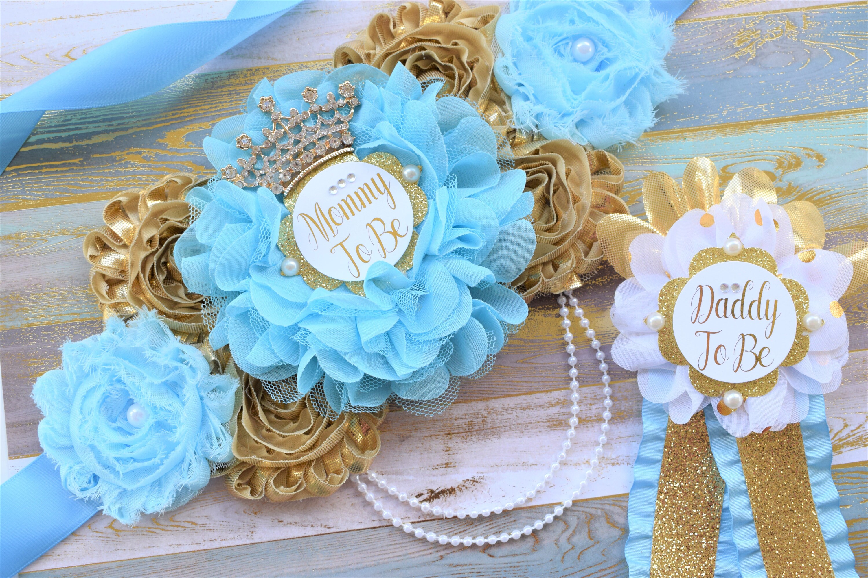 Baby Blue Royal Gold Prince Flower Sash, Baby Gold Maternity Sash, Blue Gold Pregnant Sash, Mommy & Daddy To Be, Prince Baby Shower, Custom