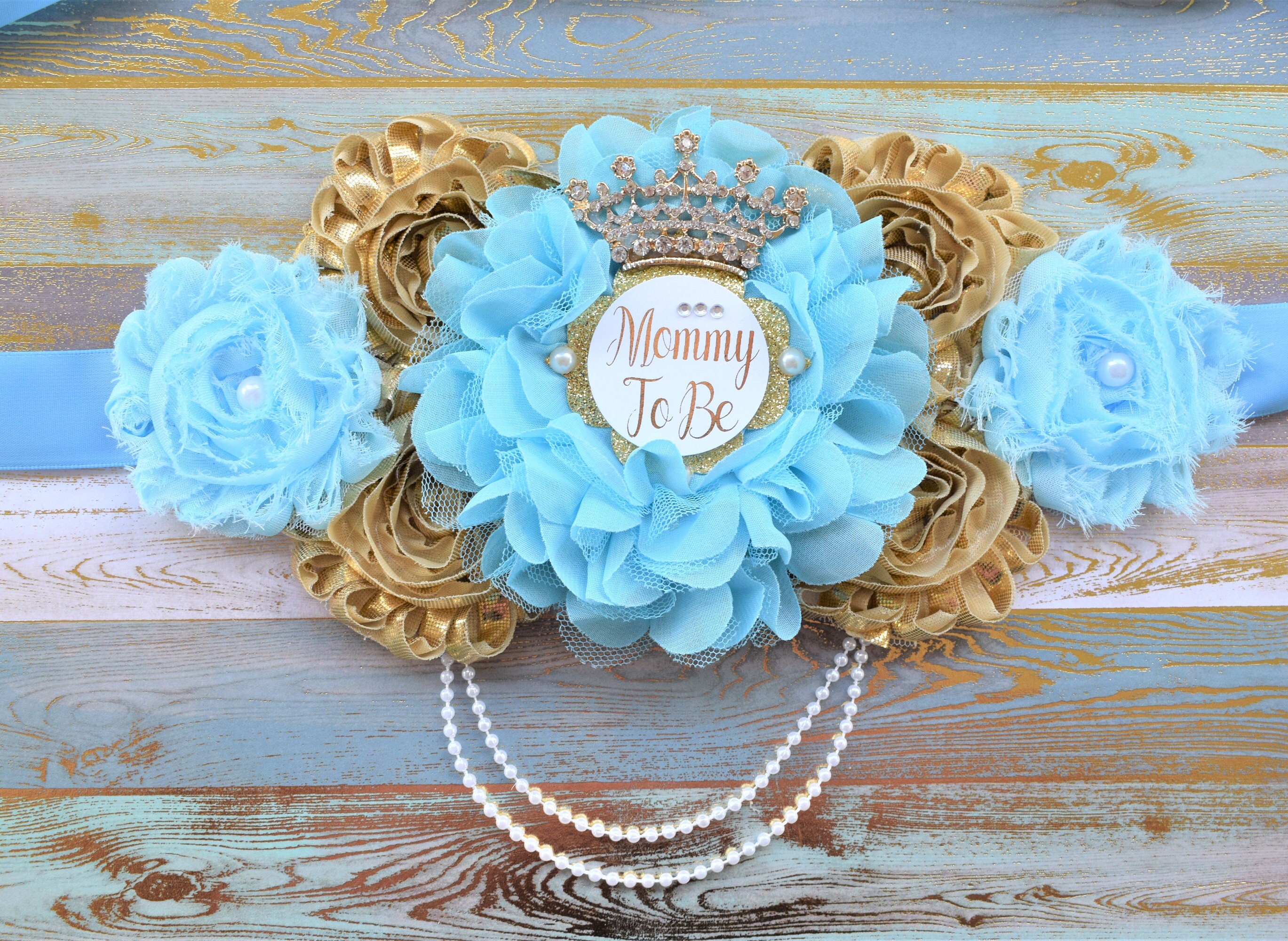 * Maternity Sash: It has seven beautiful flowers in baby blue & gold colors embellished with a gold crown and pearls. The ribbon sash is 80'' (2 meters) long.