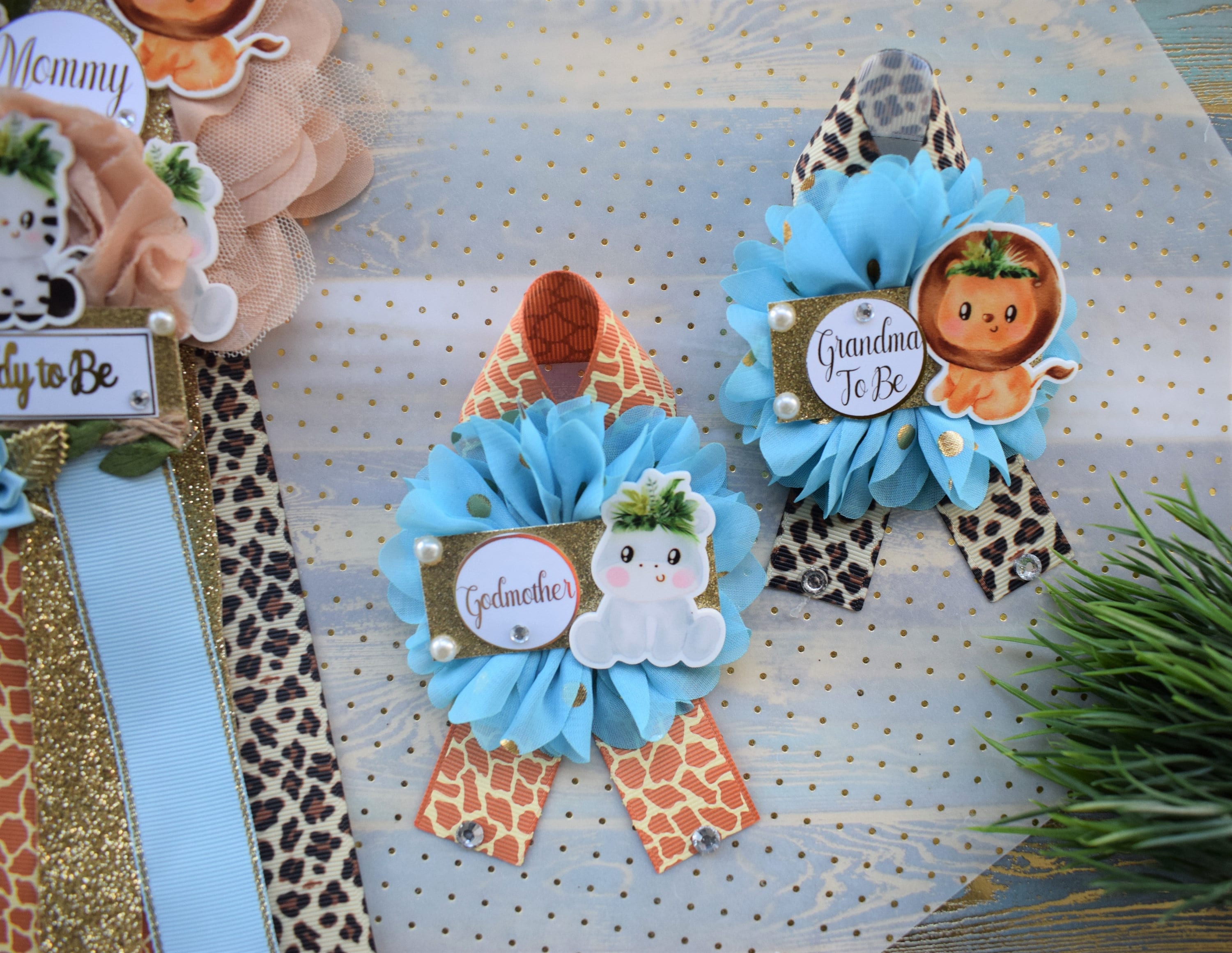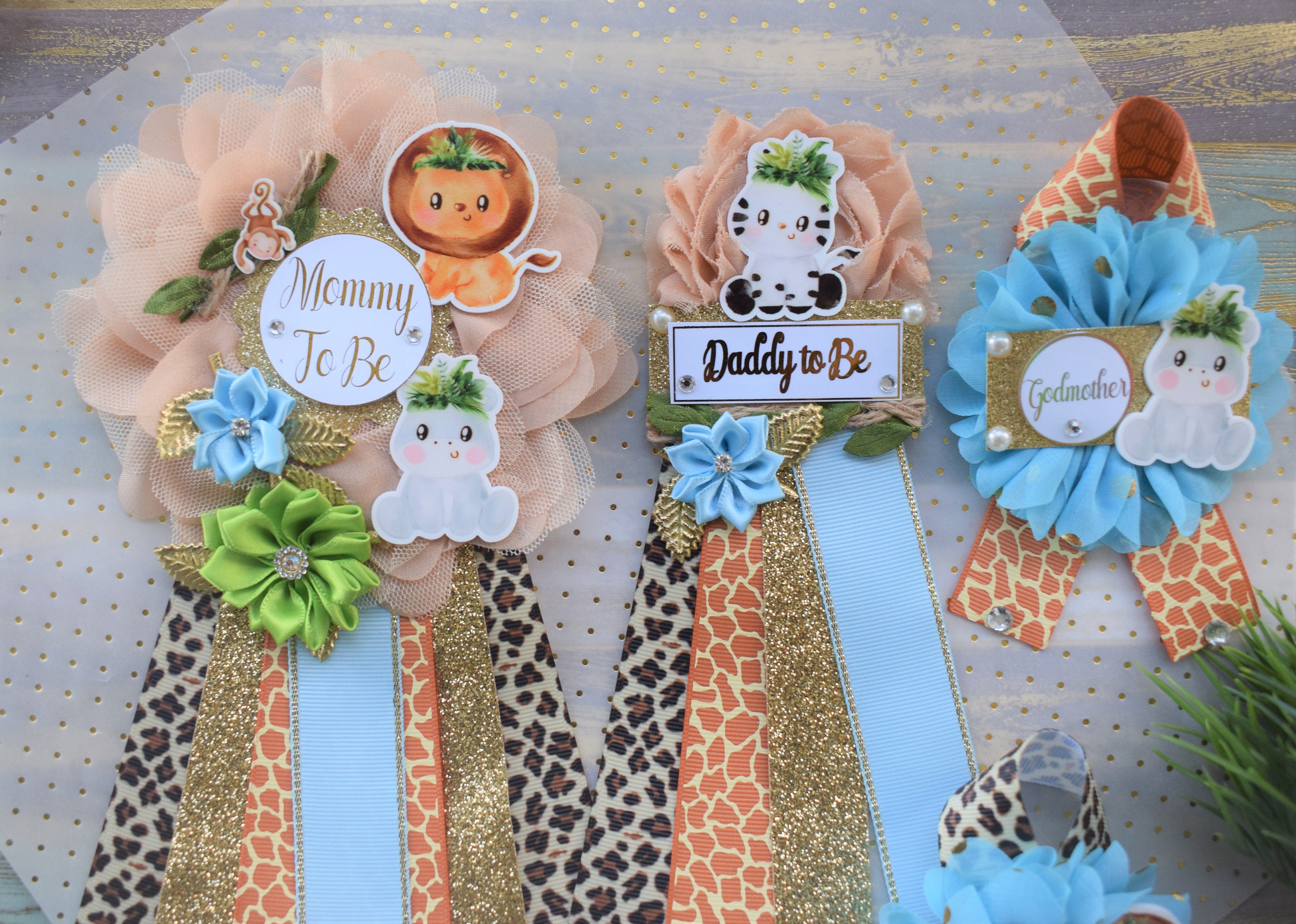 This Jungle Safari Sash & Pin Set were made especially for a Baby Shower or a Photo Prop. Details: