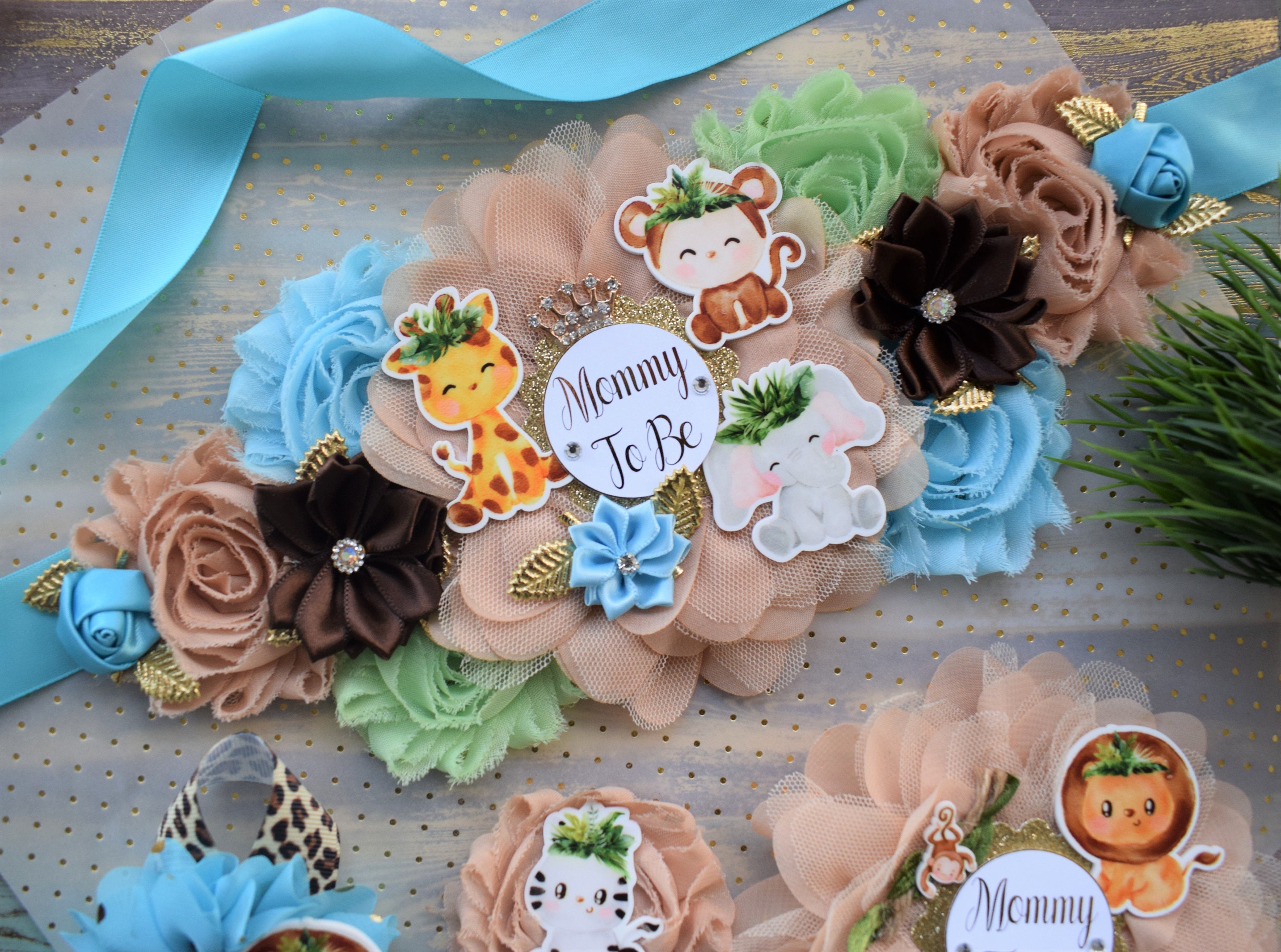 ☆ Maternity Sash: This has eleven flowers in safari theme colors embellished with rhinestones and pearls. Additionally, this sash is decorated with safari animals. The ribbon sash is 80'' (2 meters) long.