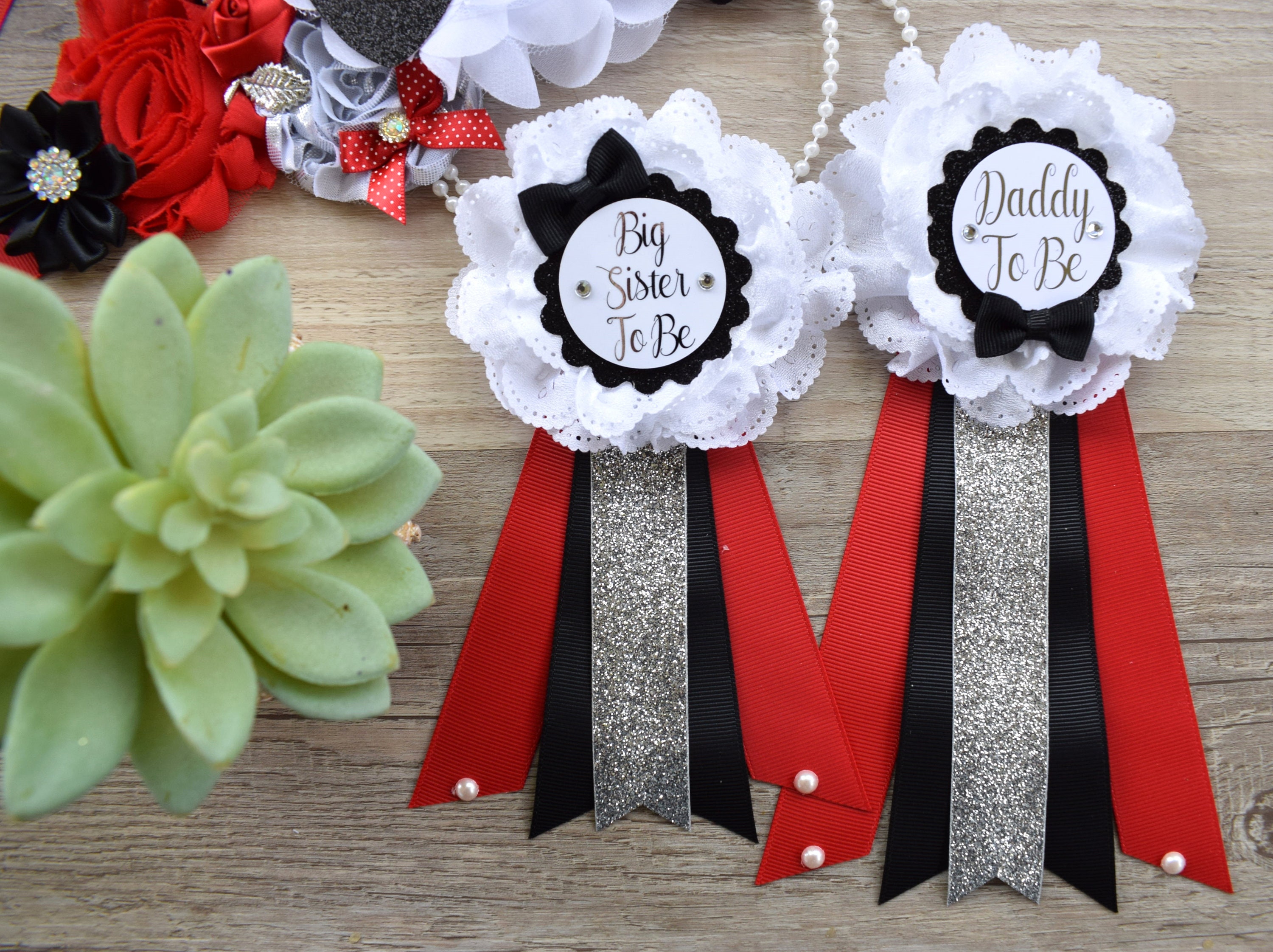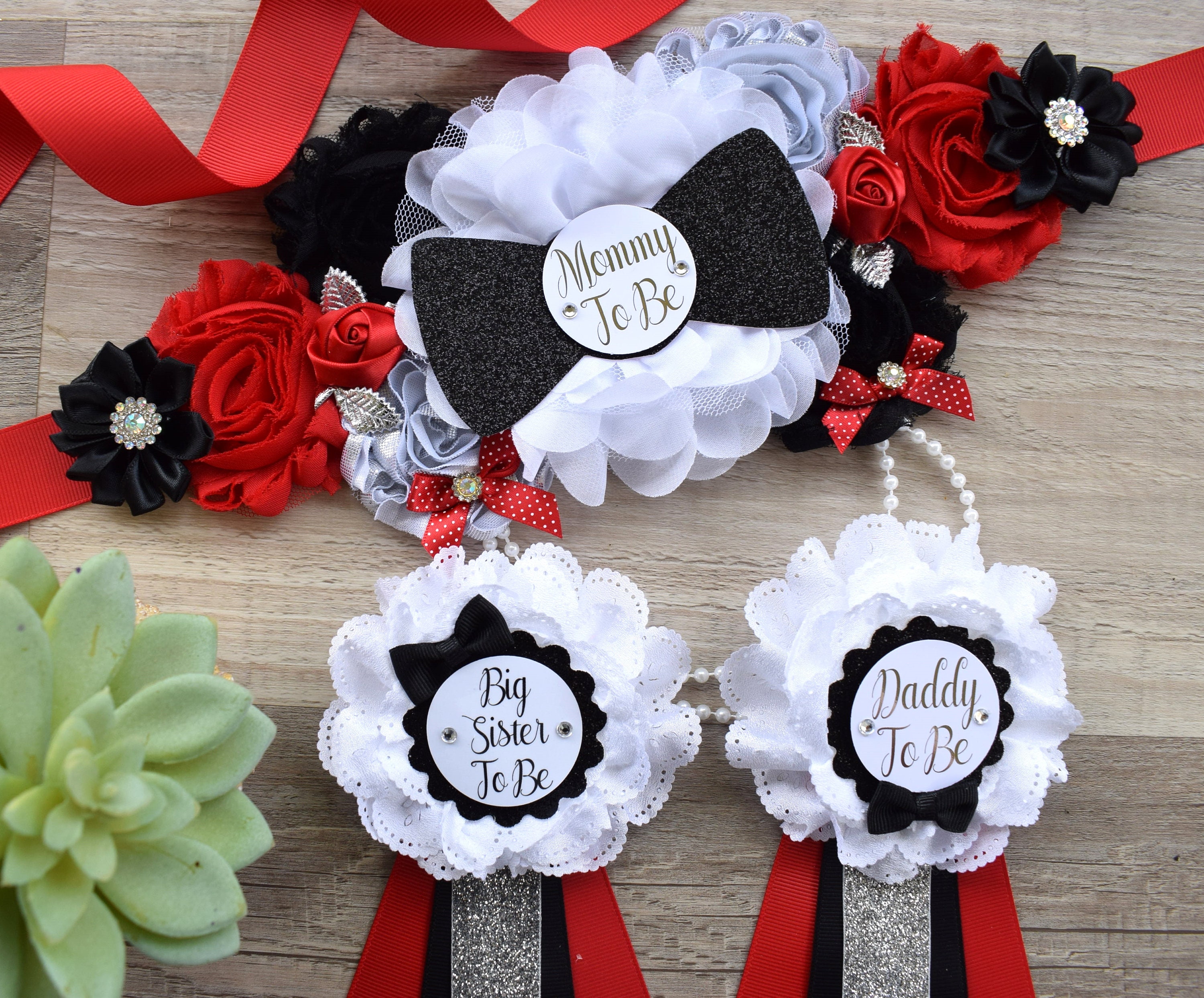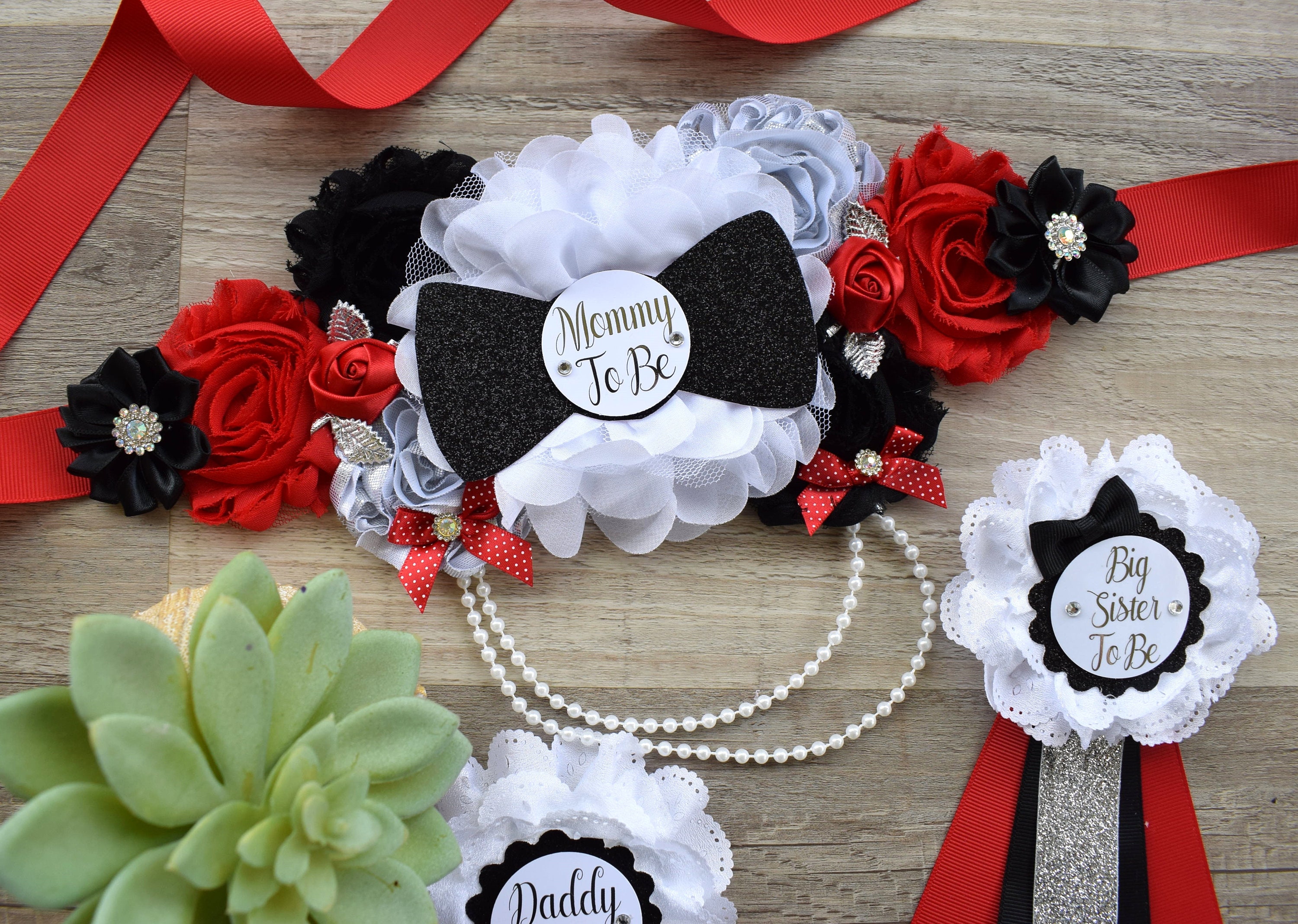 * Maternity Sash: It has eleven beautiful flowers in Red, Black & White colors embellished with rhinestones and pearls. The ribbon sash is 80'' (2 meters) long.