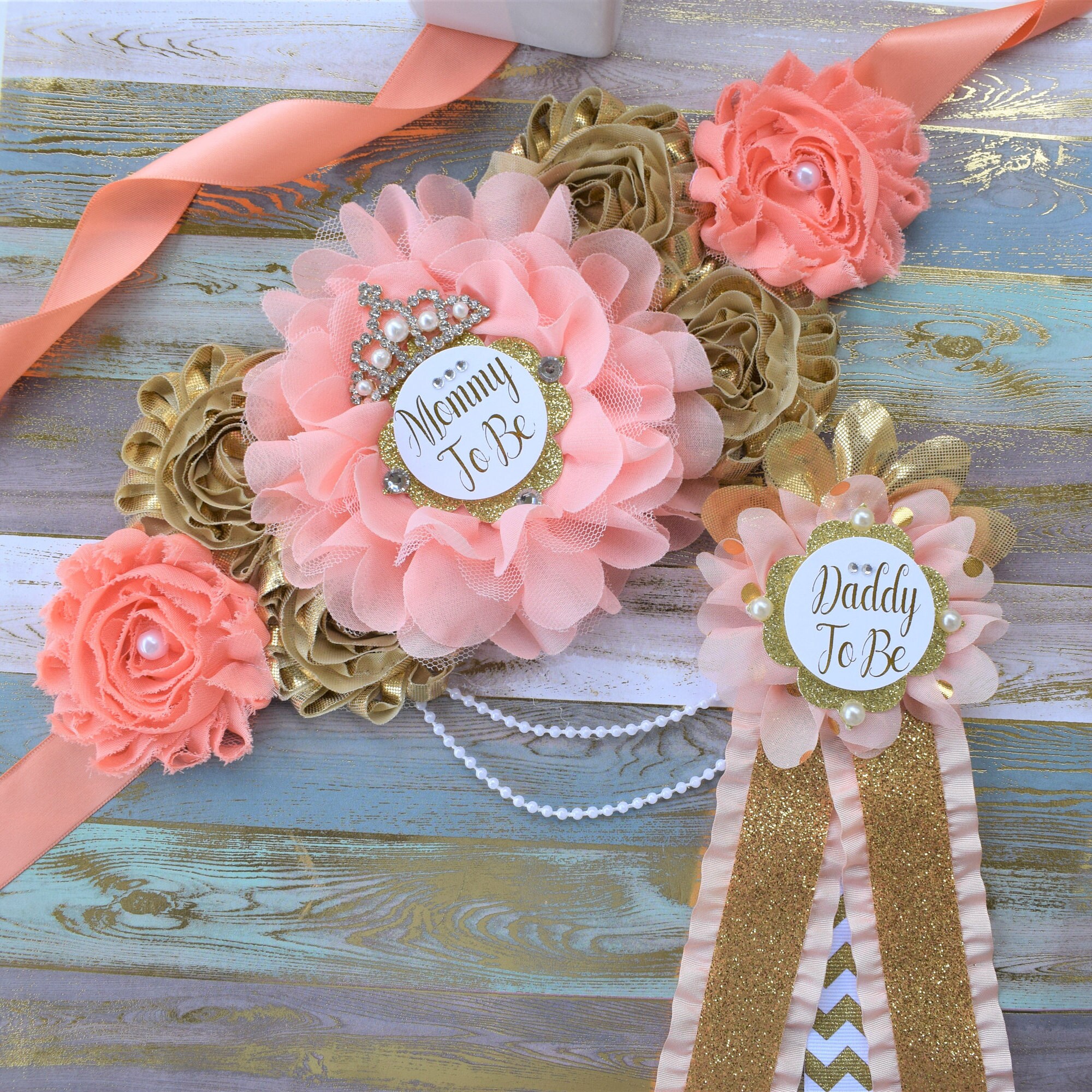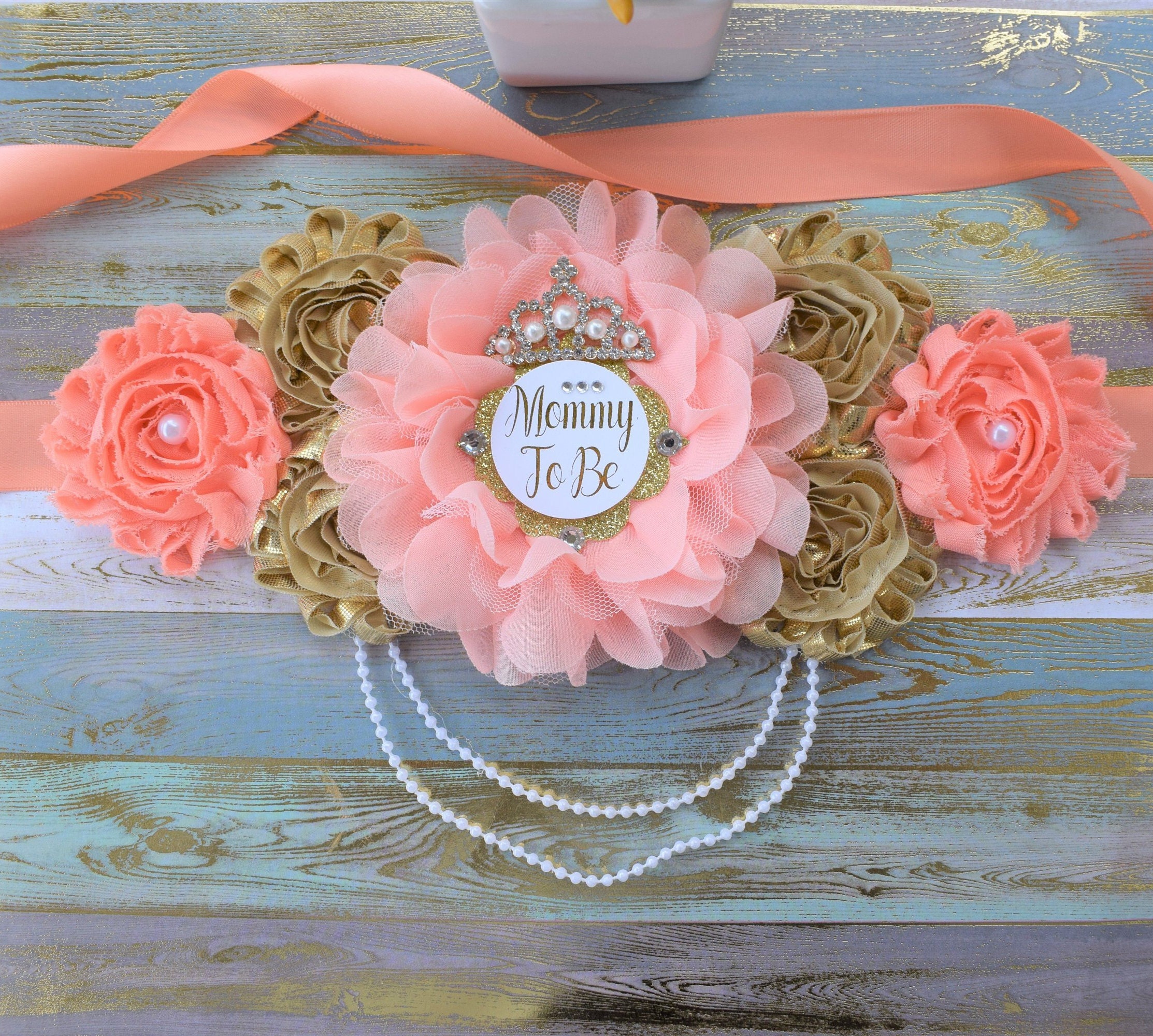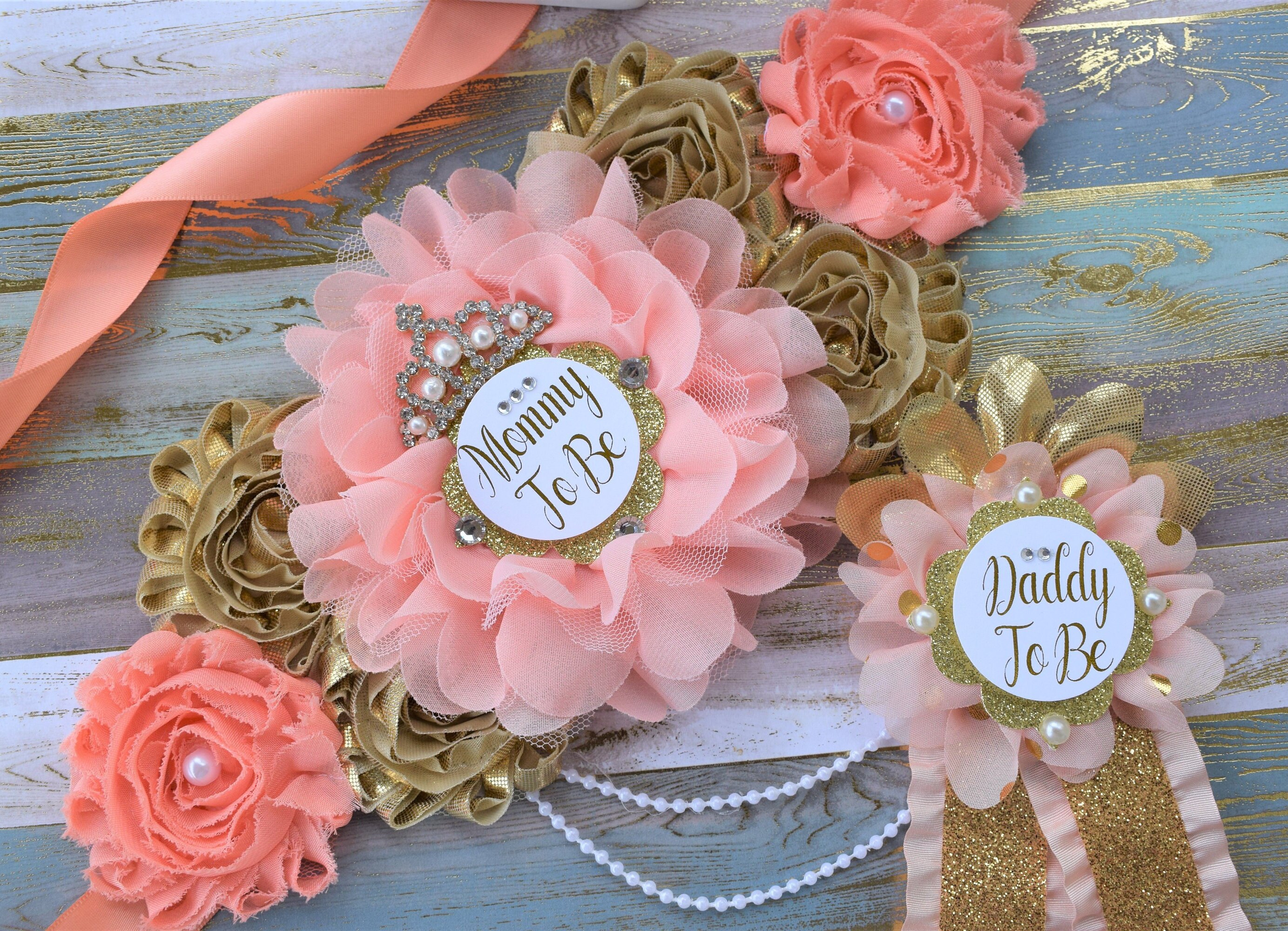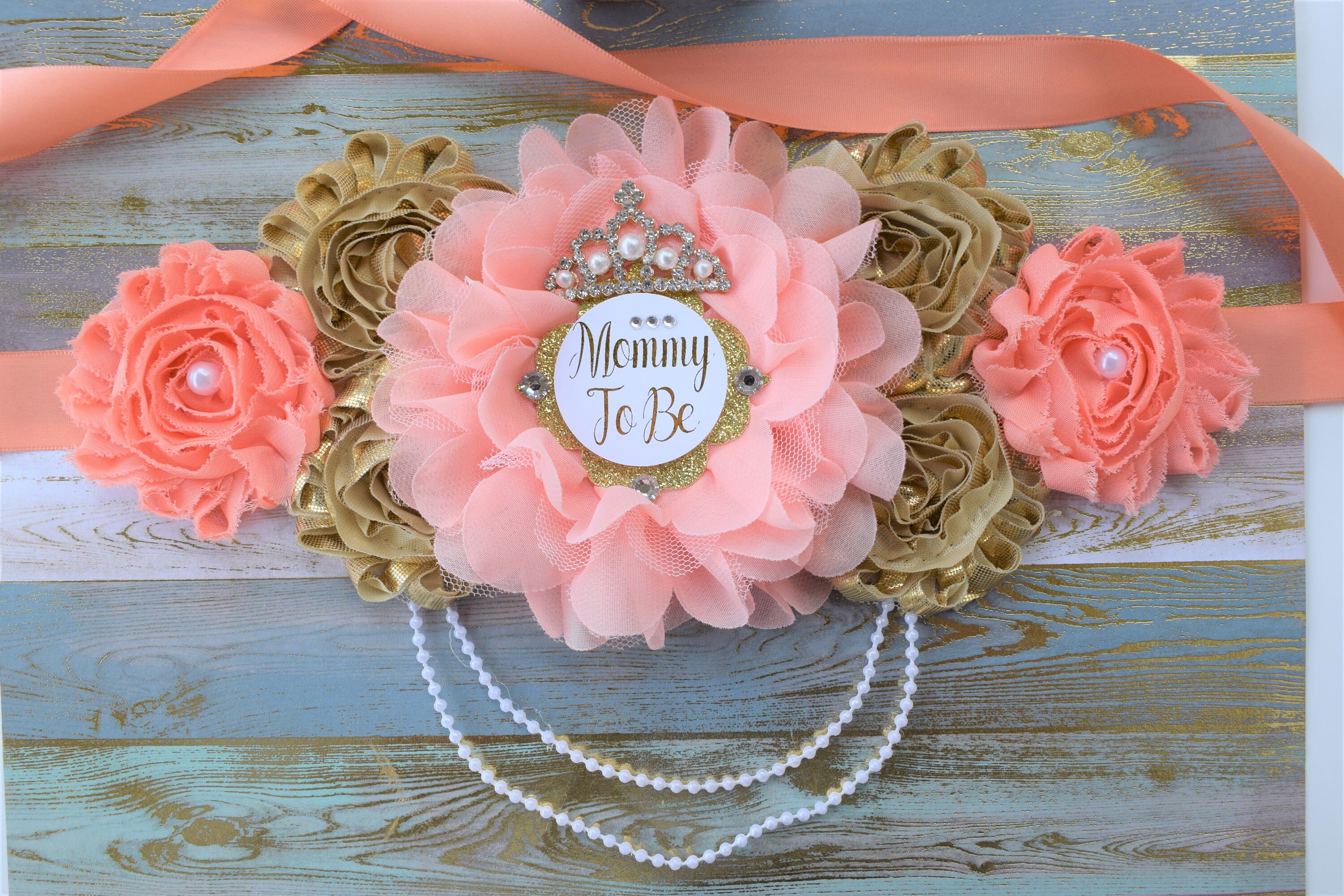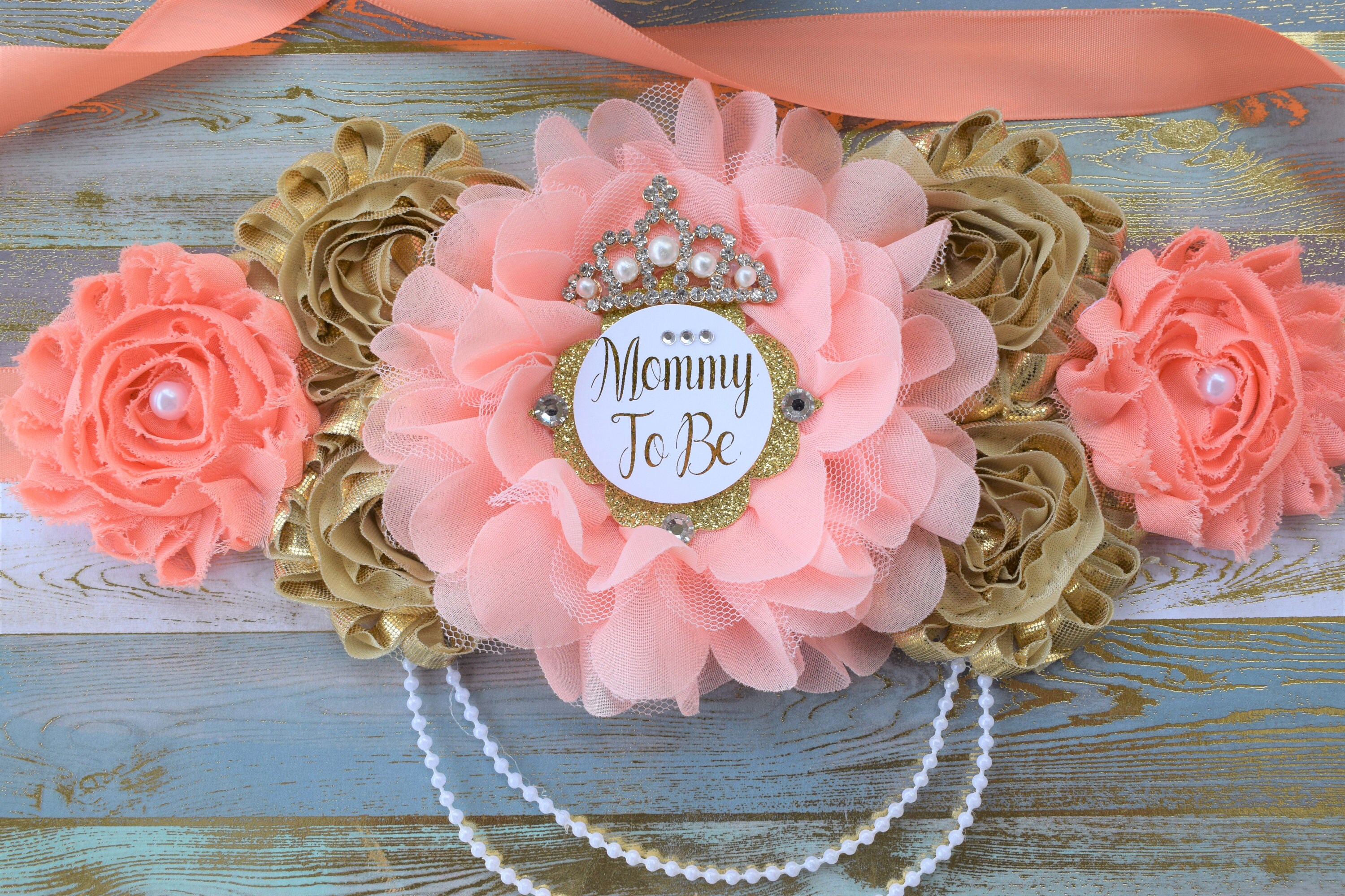 Coral Gold Flower Sash, Coral Gold Maternity Sash, Coral Gold Pregnant Sash, Coral Mommy and Daddy To Be, Coral Princess Baby Shower, Custom