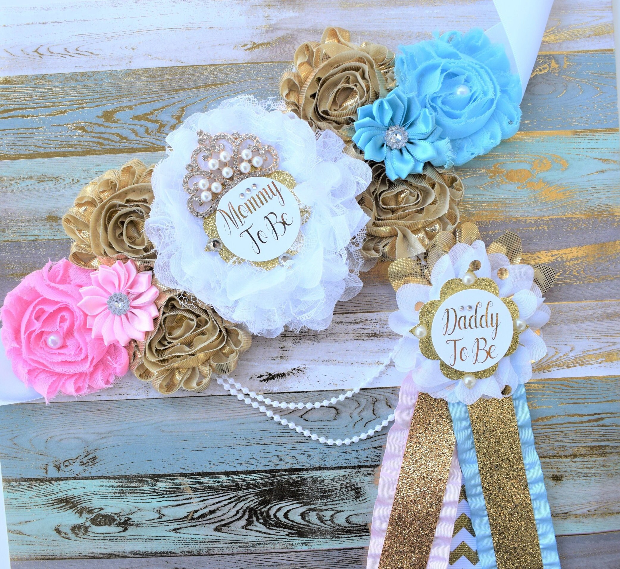 This Gorgeous Pink & Blue Flower Sash was made especially for a gender reveal. This beautiful sash has eight flowers in different sizes and a pink & blue bow embellished with rhinestones and pearls. The satin ribbon sash is 80'' (2 meters) long.