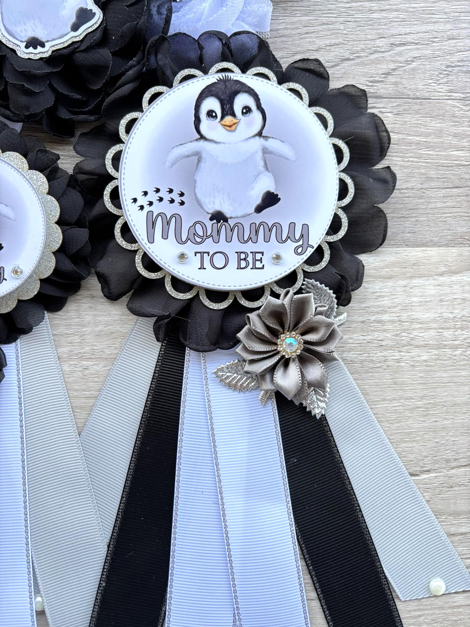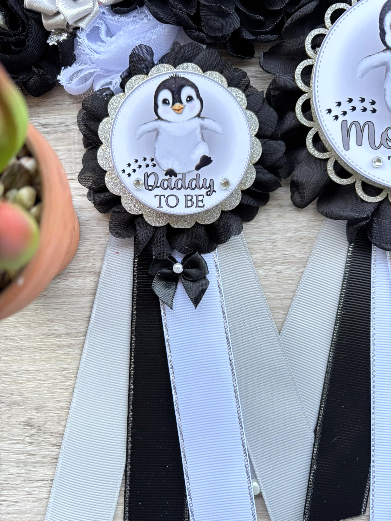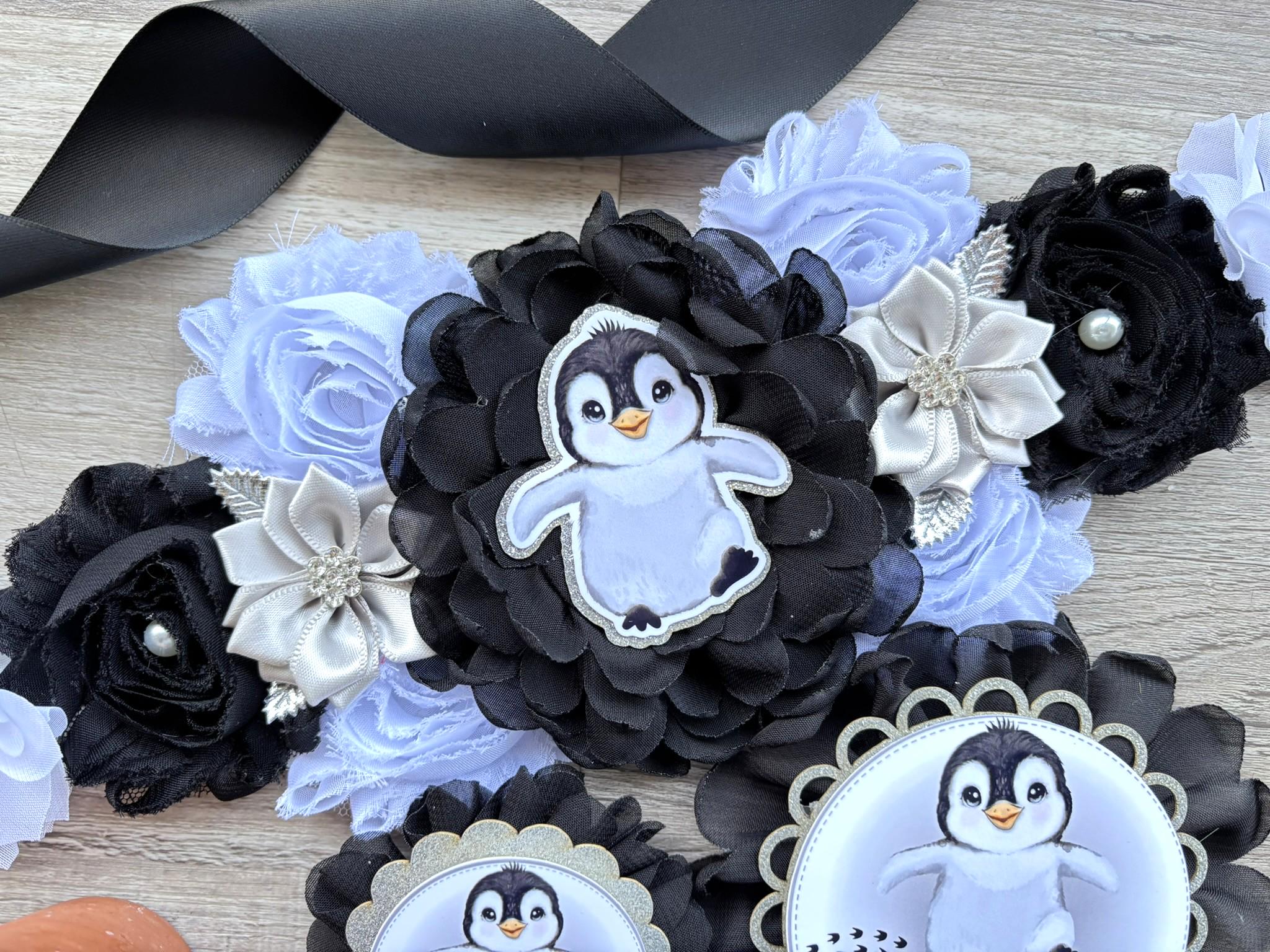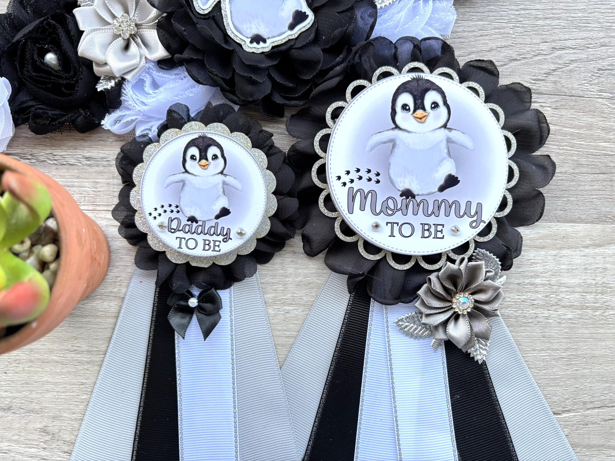 Penguin Baby Shower, Christmas Penguin Maternity Sash and Pin, Penguin Mommy To Be Corsage, Daddy To Be Pin, Neutral Black White Penguin Set