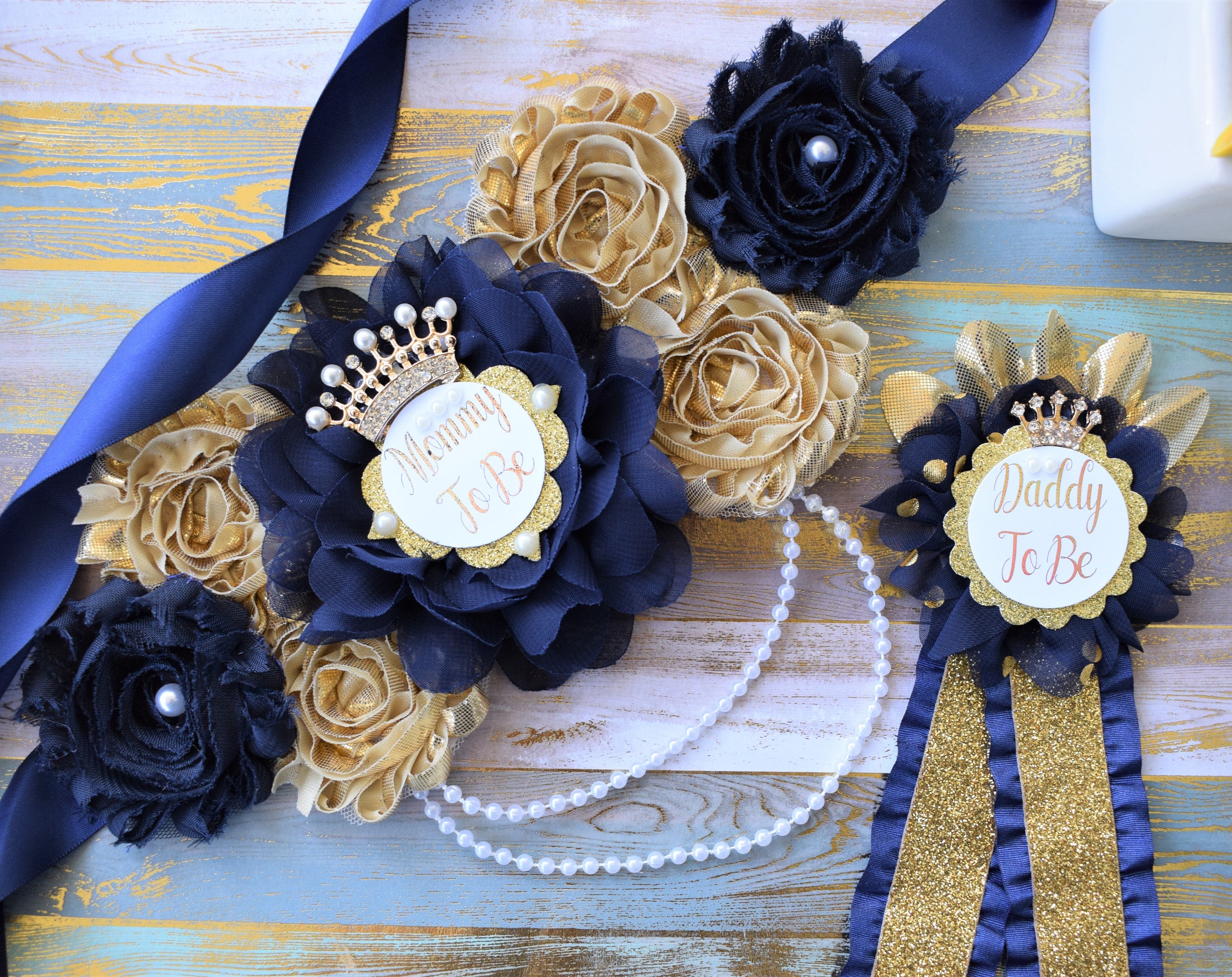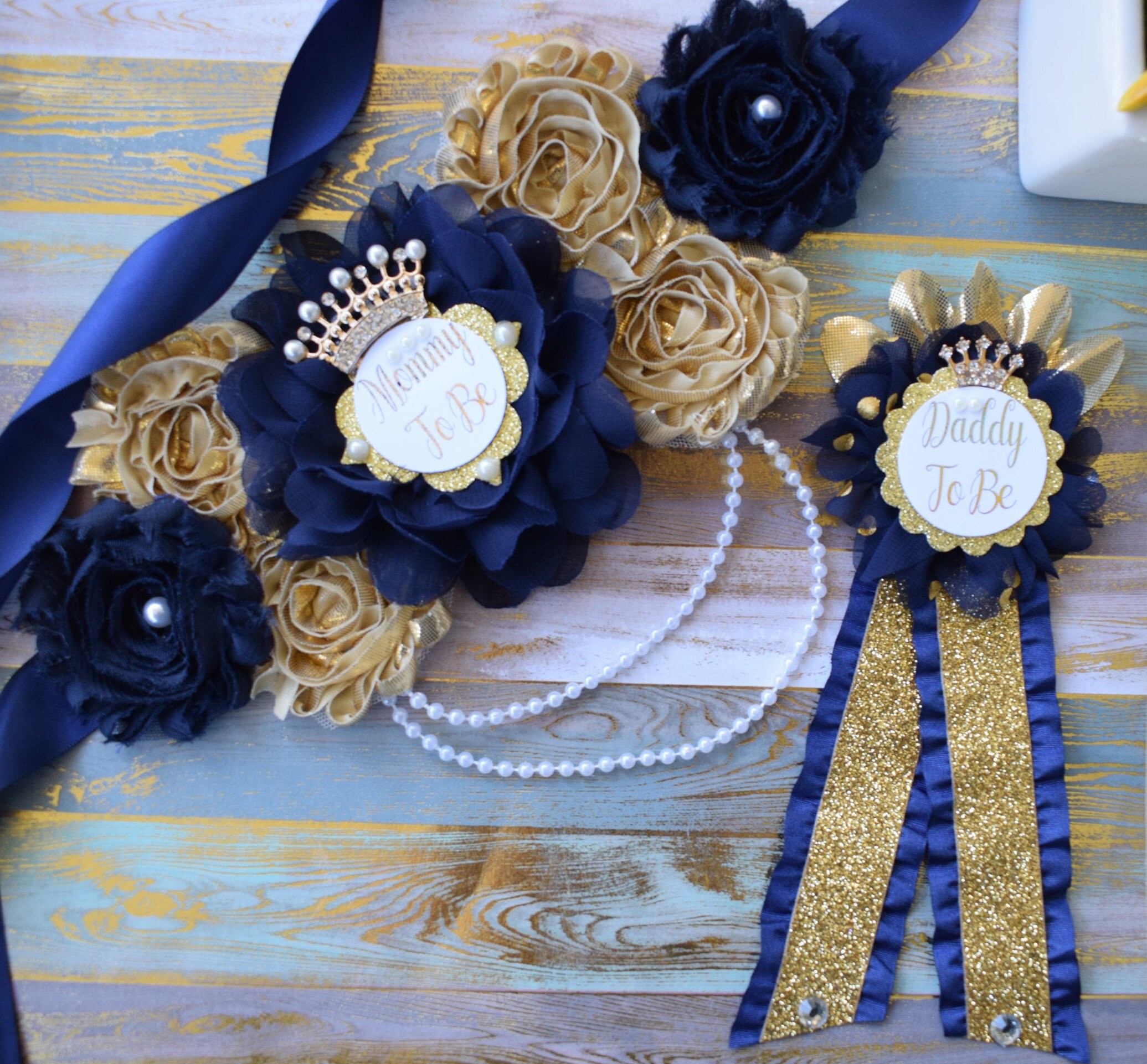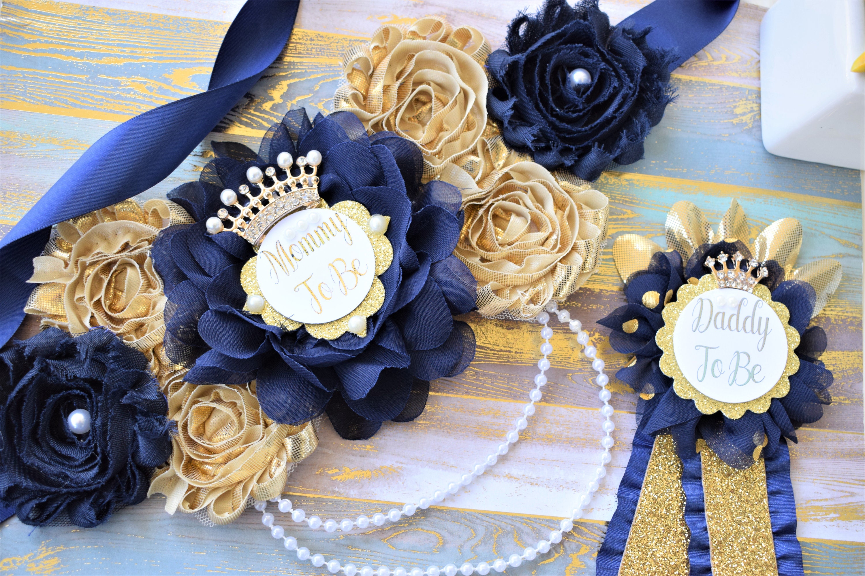 Navy Gold Prince Flower Sash, Navy Gold Maternity Sash, Navy Gold Pregnant Sash, Mommy and Daddy To Be, Navy Prince Baby Shower, Custom