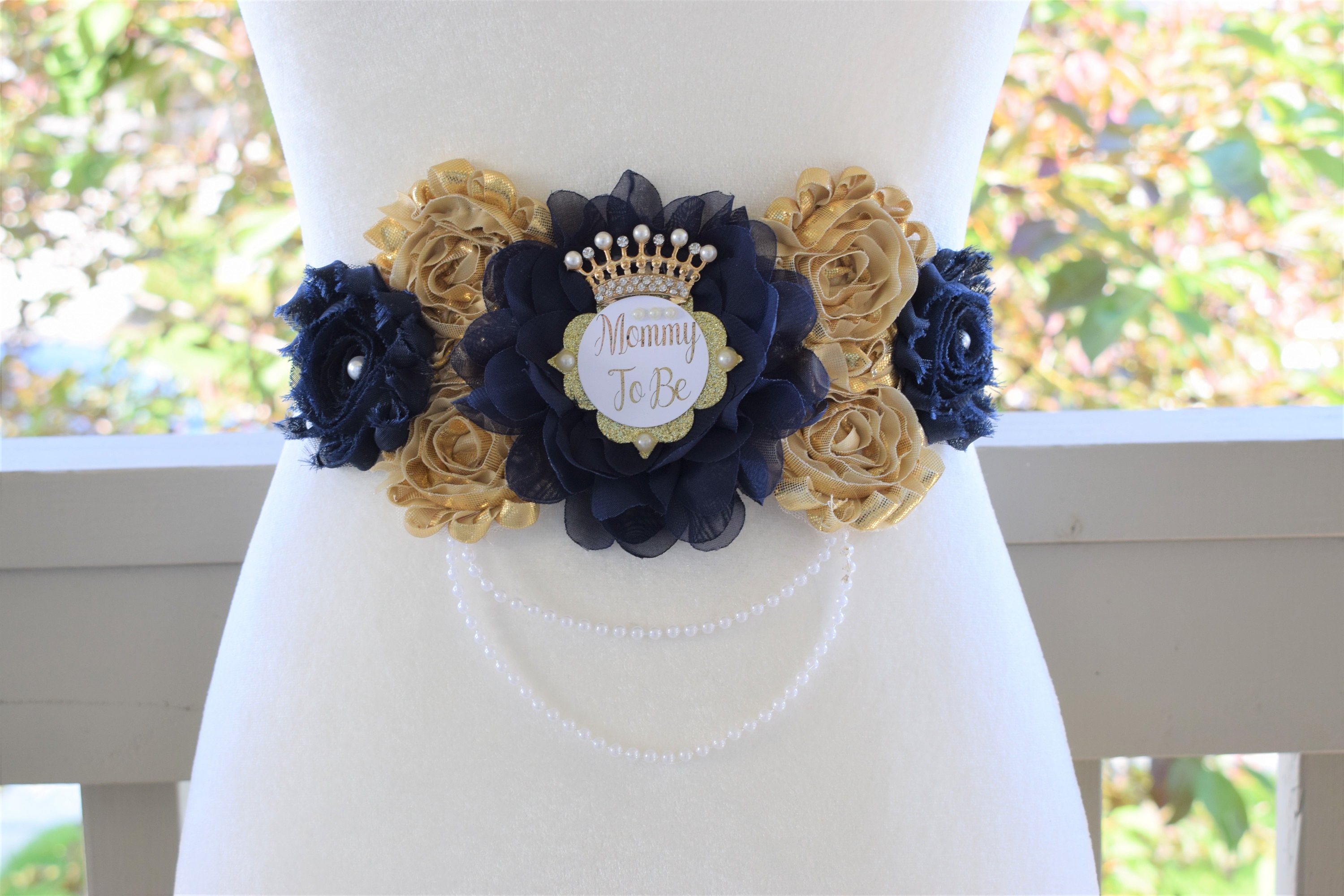 ** Maternity Sash: It has seven beautiful flowers in NavyBlue and Gold colors embellished with rhinestones and pearls. The ribbon sash is 80'' (2 meters) long.
