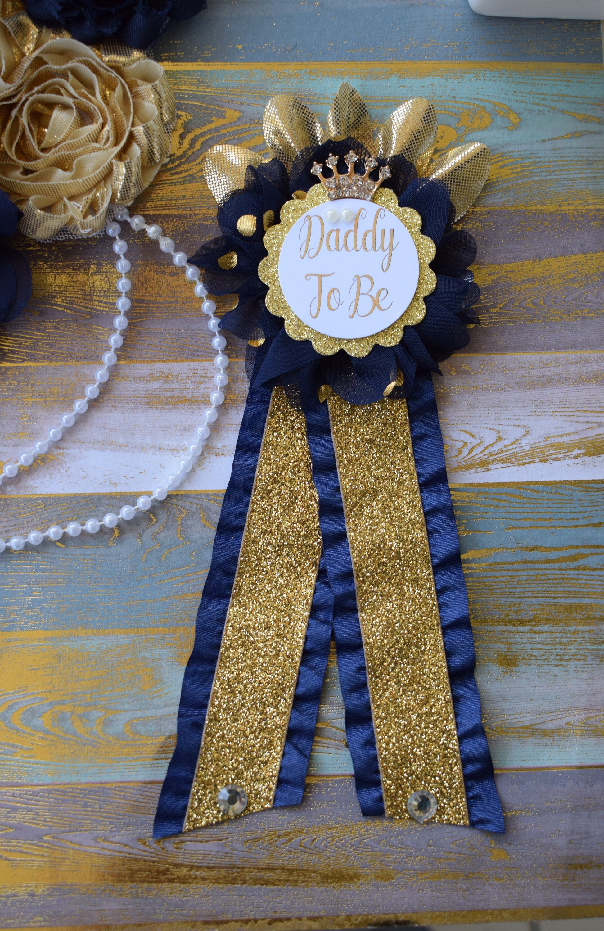 This Gold & Navy Prince Flower Sash is made especially for a Baby Shower or a Photo Prop.