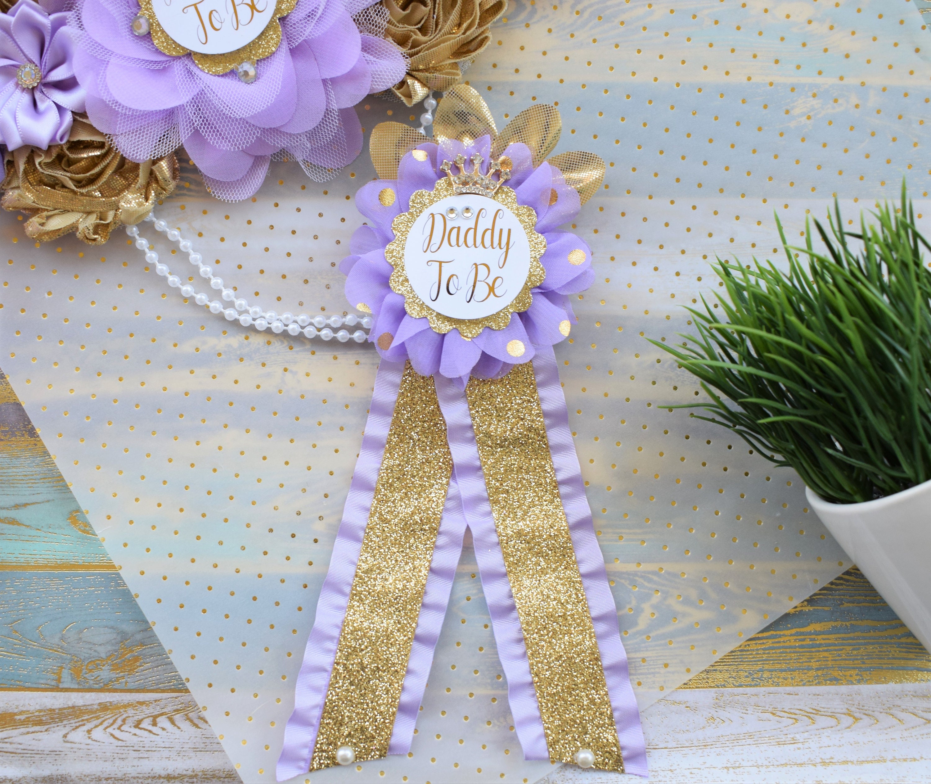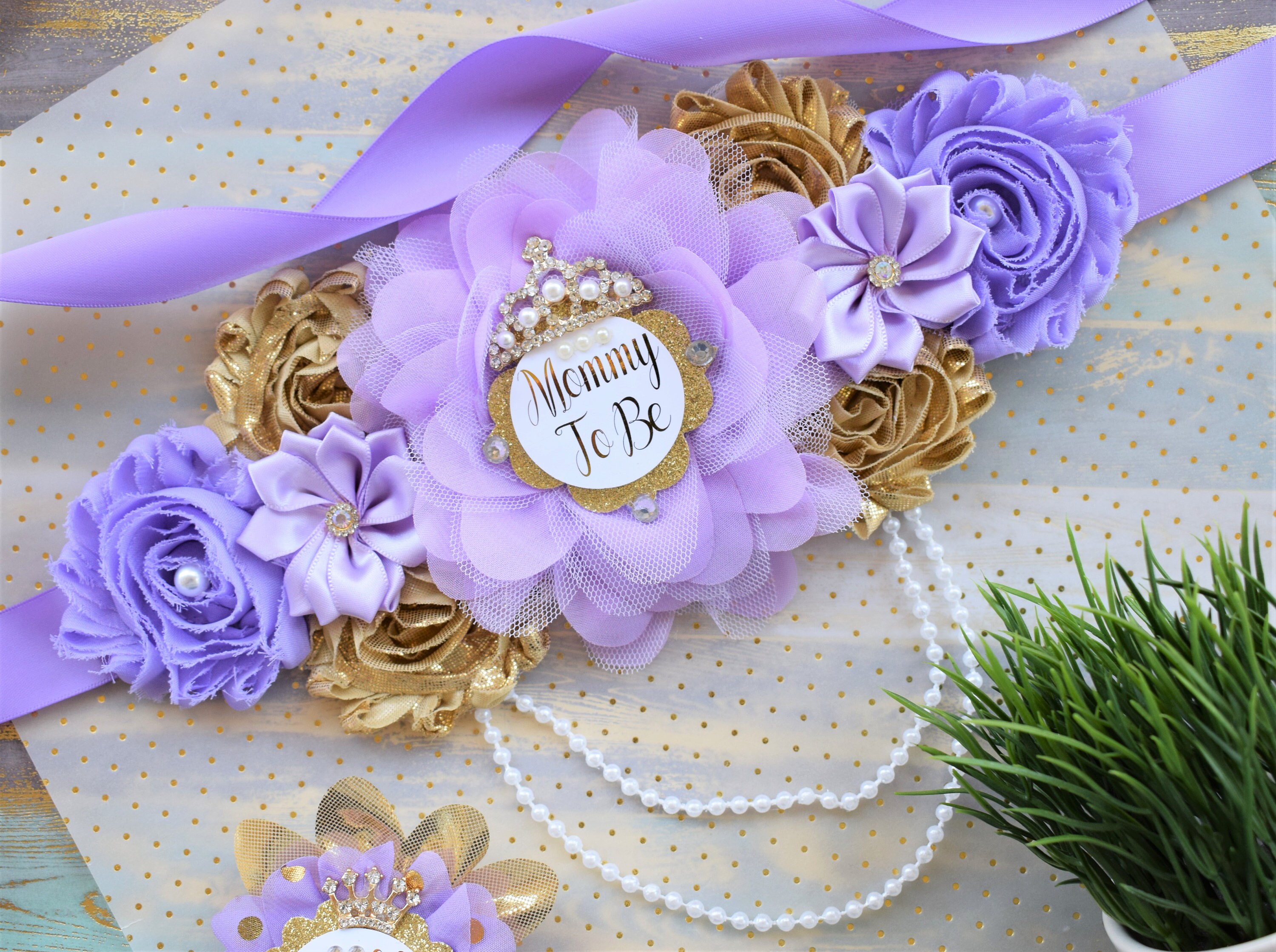 Lavender Gold Princess Flower Sash, Lavender Gold Maternity Sash, Lavender Gold Pregnant Sash, Mommy and Daddy To Be, Purple Gold Shower