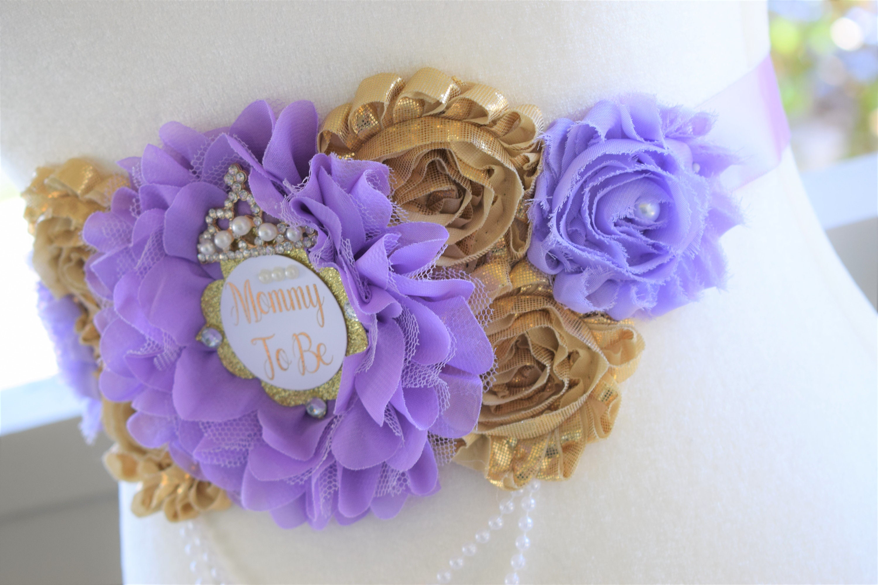 * Maternity Sash: It has nine beautiful flowers in Lavender & Gold colors embellished with rhinestones and pearls. The ribbon sash is 80'' (2 meters) long.
